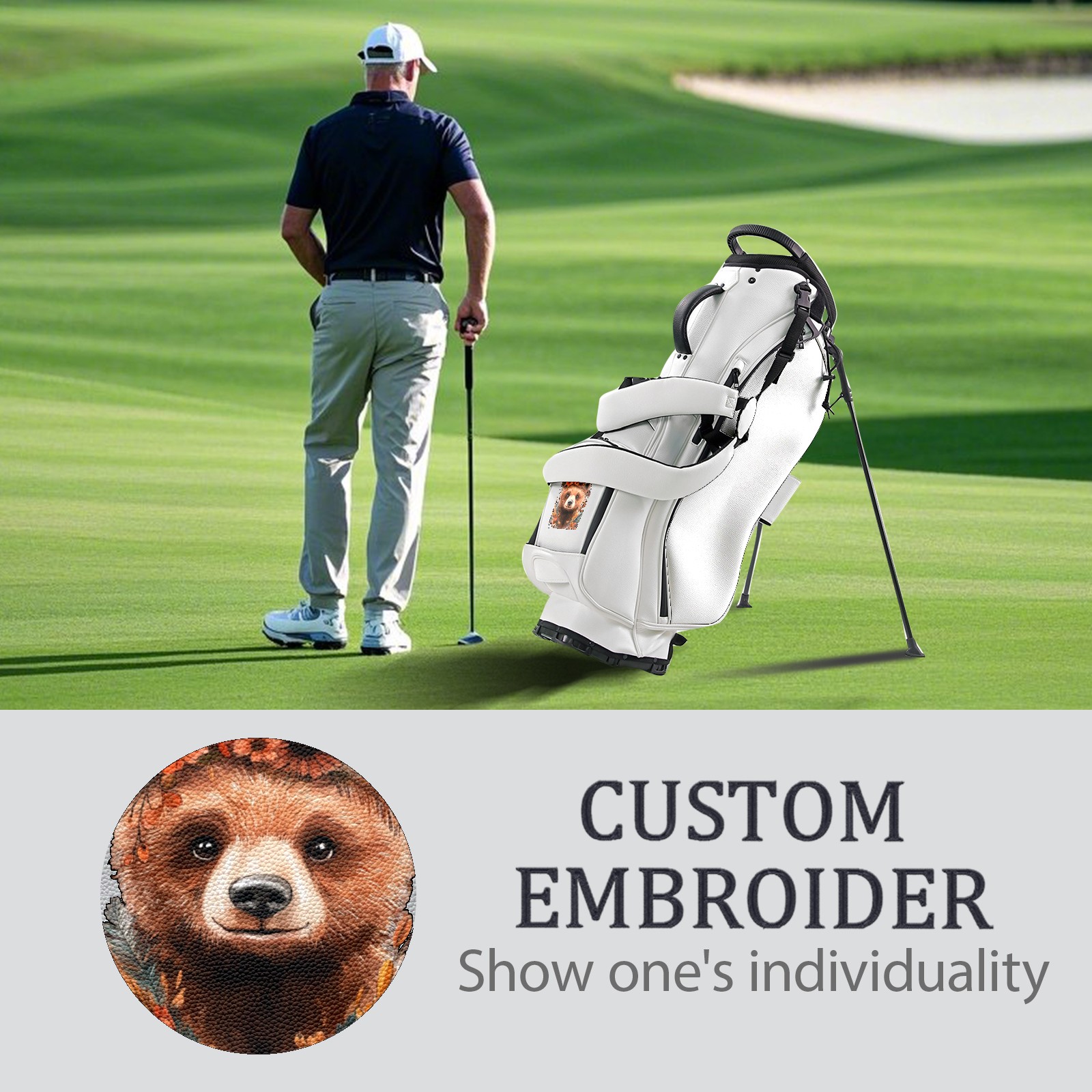 <p>The golf bag is carefully crafted with PU leather fabric, with classic lychee pattern and matte texture, available in black and white, and equipped with a dedicated rain cover. It not only looks stylish, but also can protect your clubs and equipment from wind and rain. In terms of storage design, it provides 5/14 compartments of large capacity to effectively protect the clubs; waterproof zipper pockets ensure that items are dry and safe; abundant storage space to meet your storage needs for various necessities. Thickened breathable shoulder straps with adjustable chest buckles evenly disperse shoulder pressure, 14-way partition design on the top of the bag, each iron, wood and putter has a dedicated position, and the bottom anti-wear and anti-slip spikes design can adapt to various complex terrain placements to prevent the bag from tipping over or shaking, escorting your golf trip.</p>