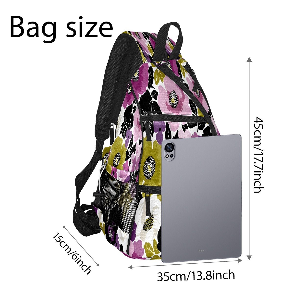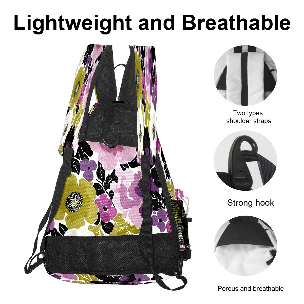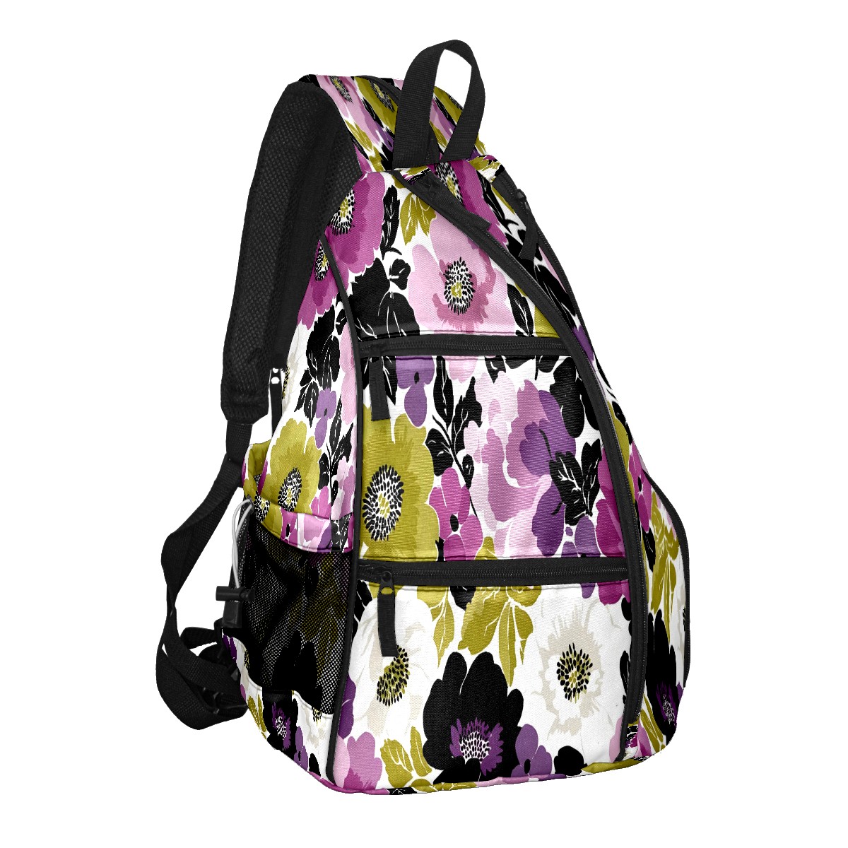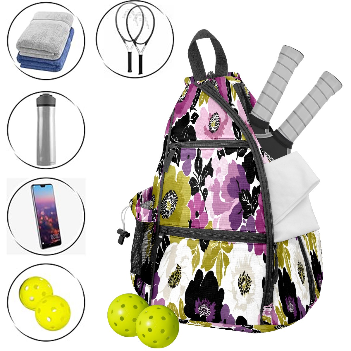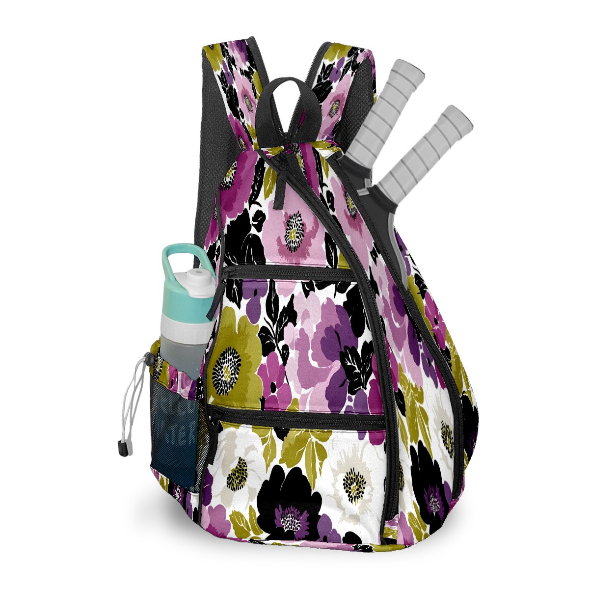 Pickleball Bag with Padded Back, Purple Green Mixed Flowers Vintage Multi-Compartment Paddle Backpack, Lightweight Nylon Sports Bag for Men & Women