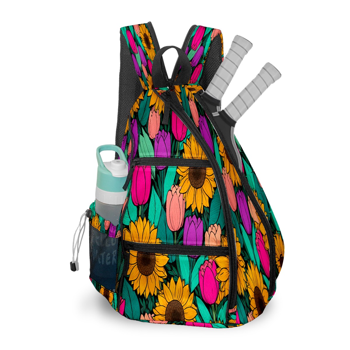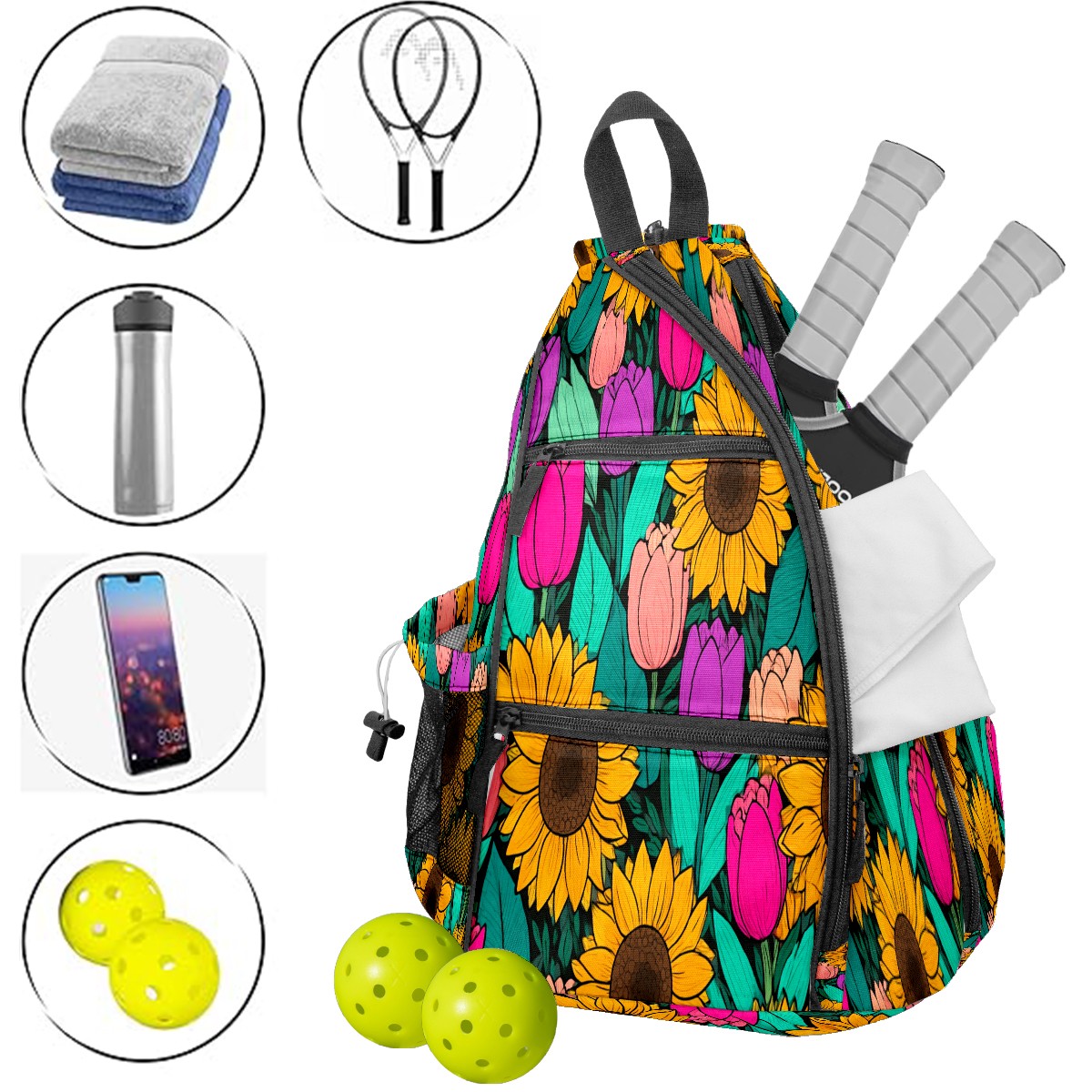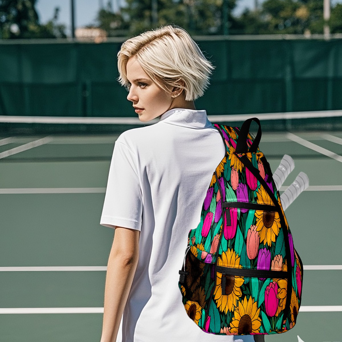 Pickleball Bag with Padded Back, Yellow Sunflowers Multi-Compartment Paddle Backpack, Lightweight Nylon Sports Bag for Men & Women
