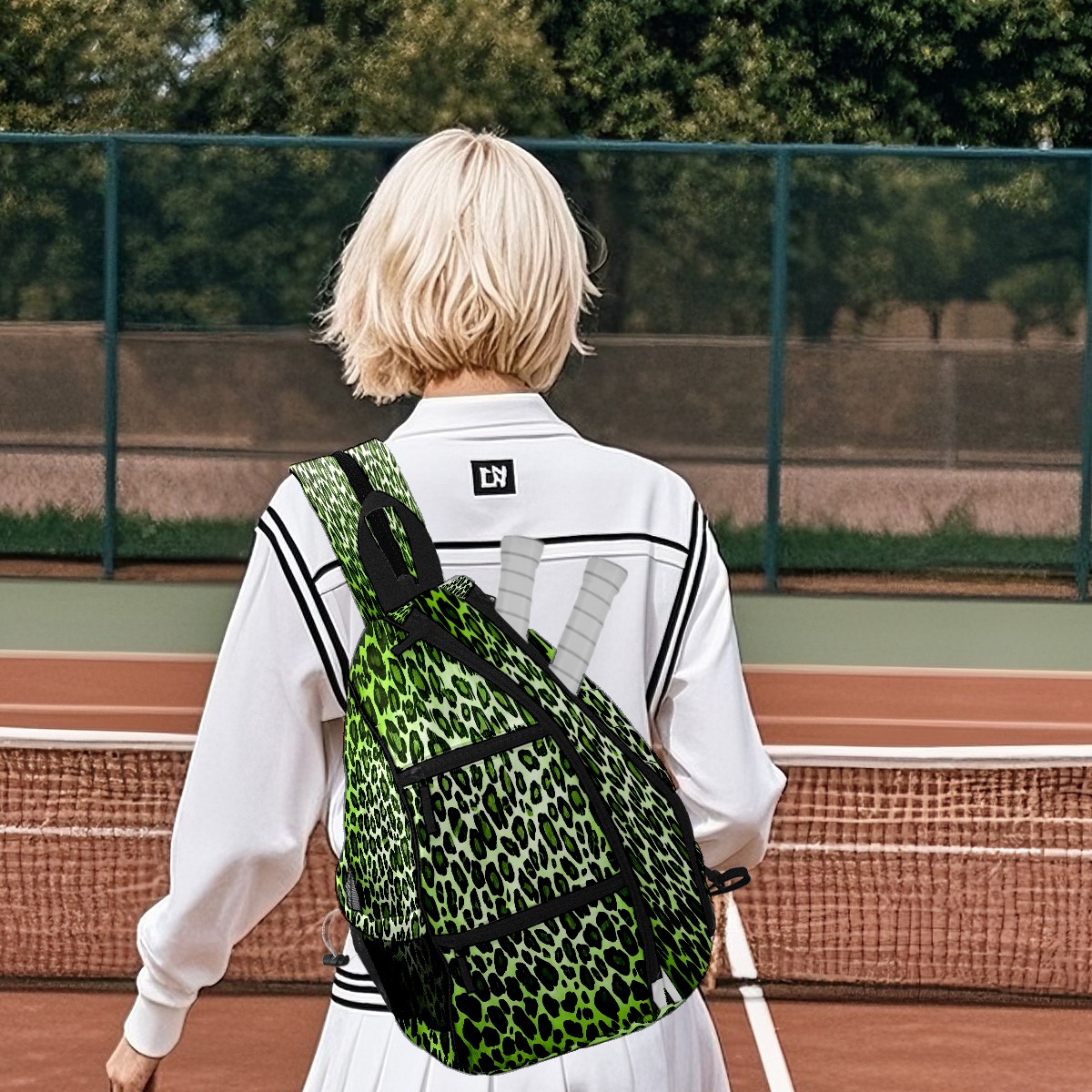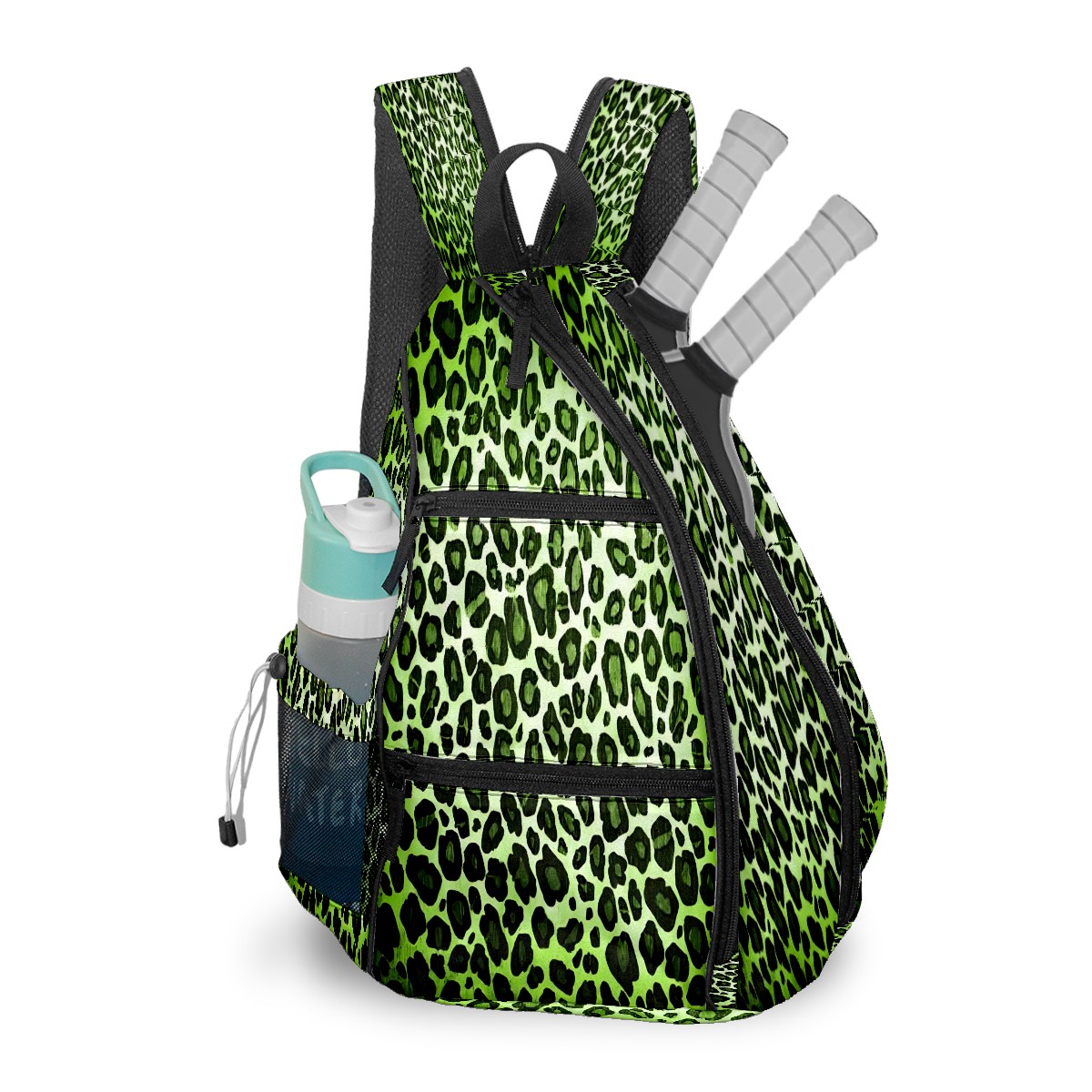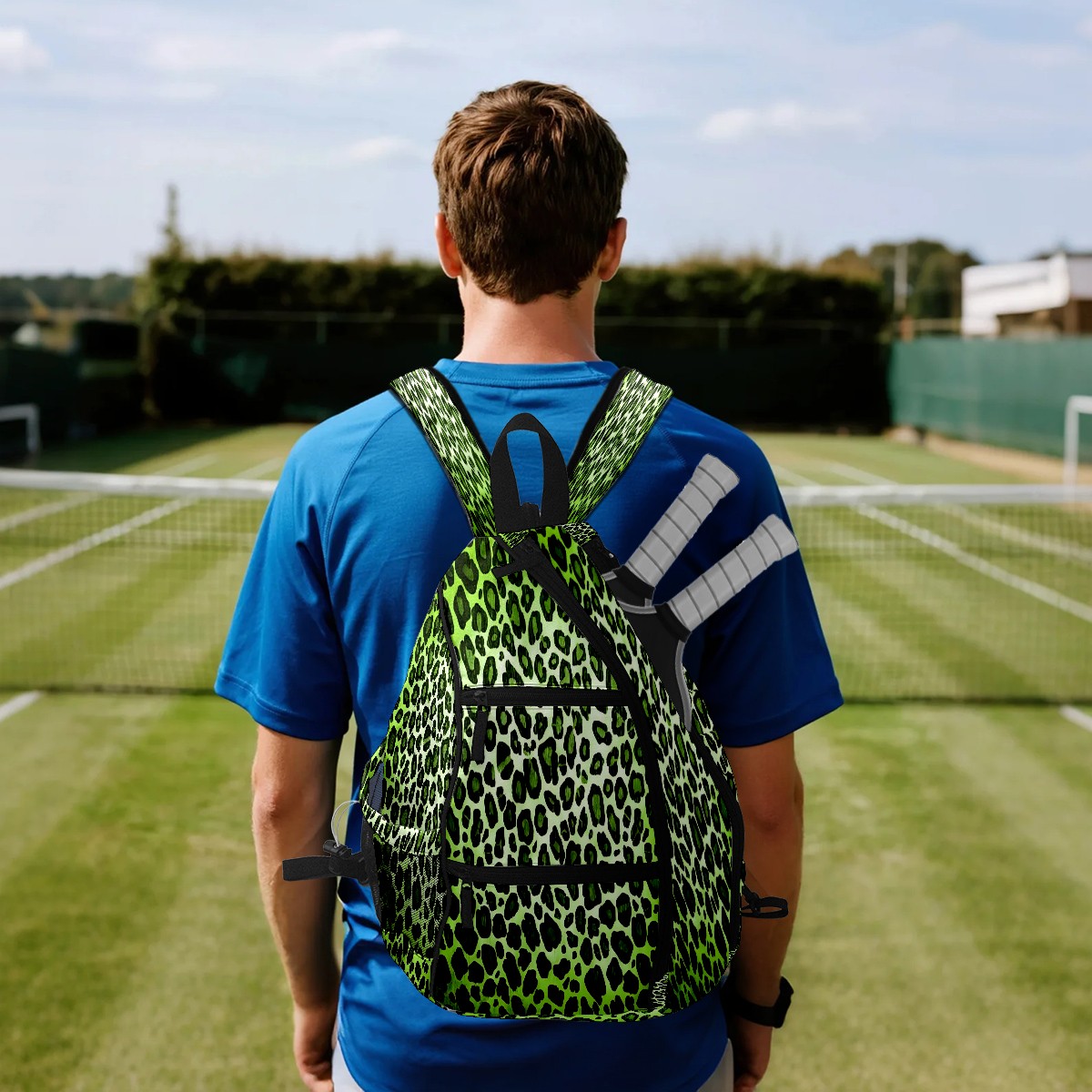Pickleball Bag with Padded Back, Green Leopard Print Multi-Compartment Paddle Backpack, Lightweight Nylon Sports Bag for Men & Women