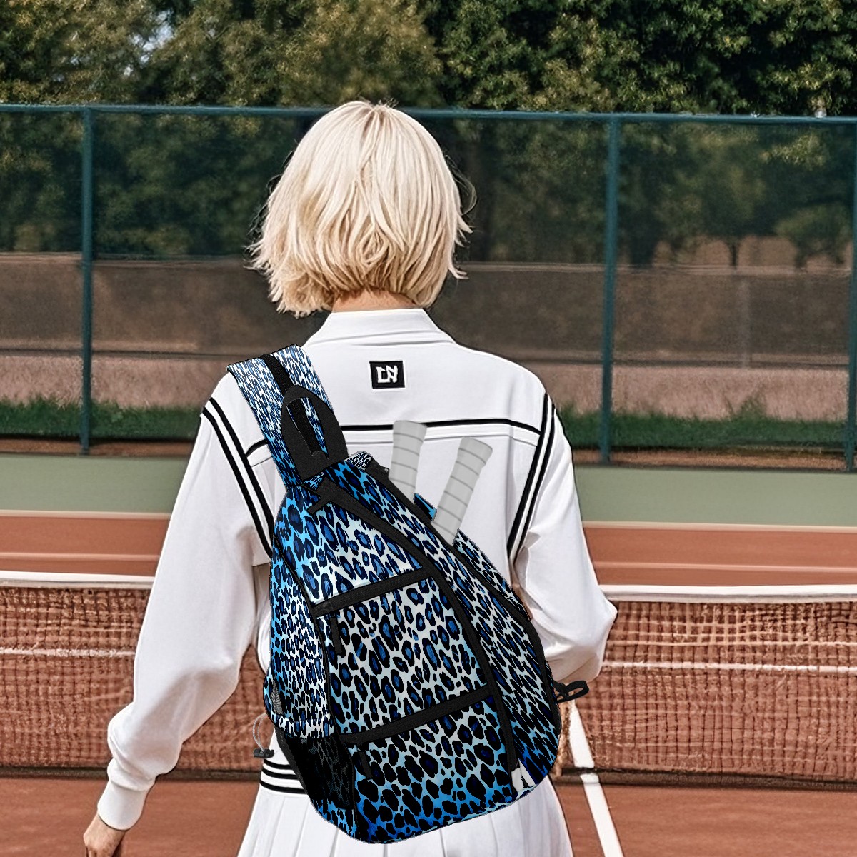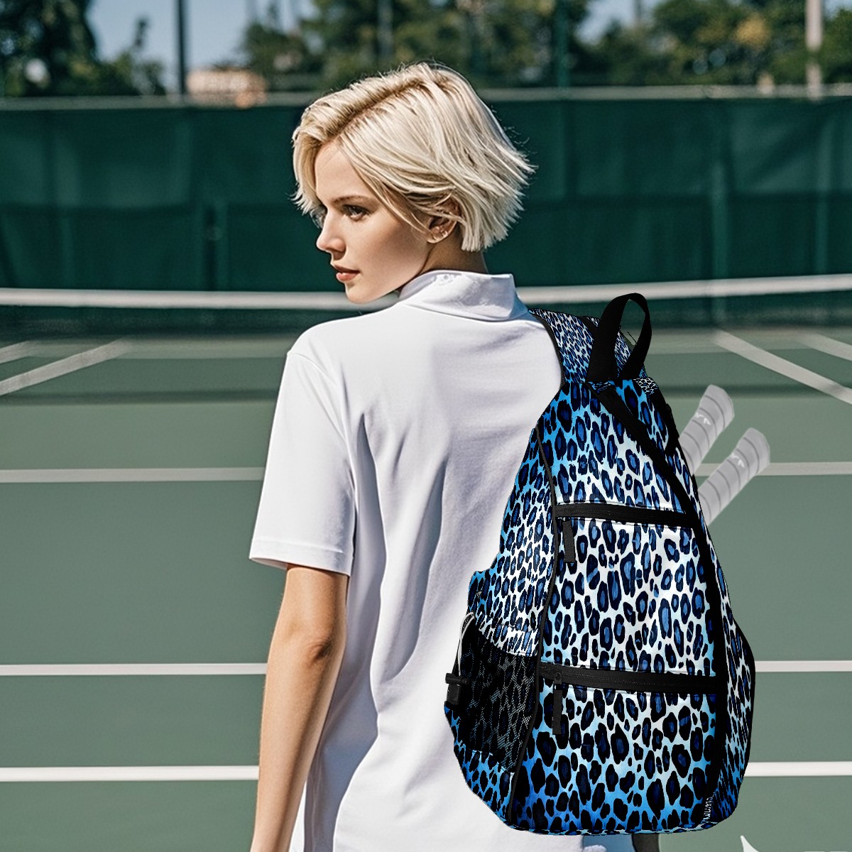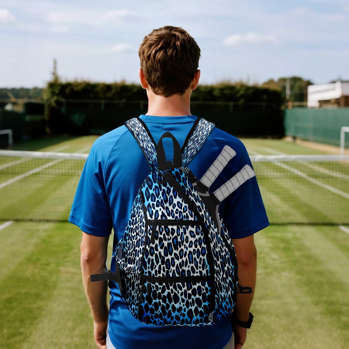 Pickleball Bag with Padded Back, Blue Leopard Print Multi-Compartment Paddle Backpack, Lightweight Nylon Sports Bag for Men & Women