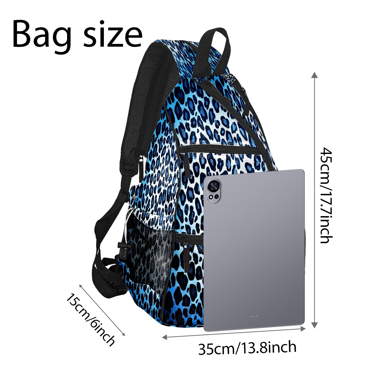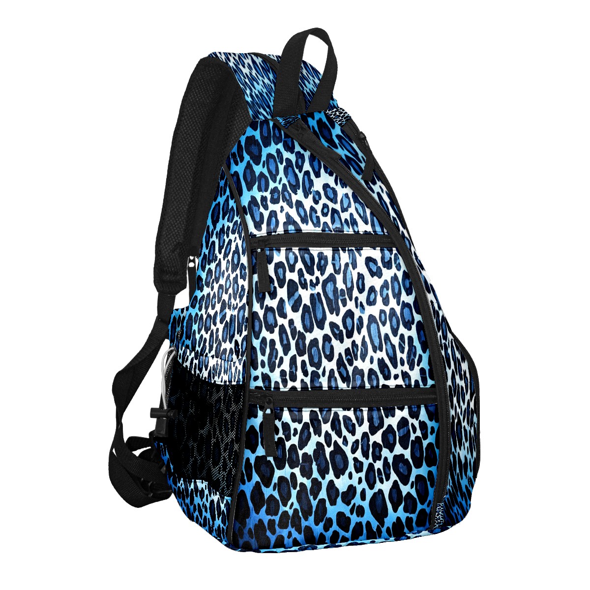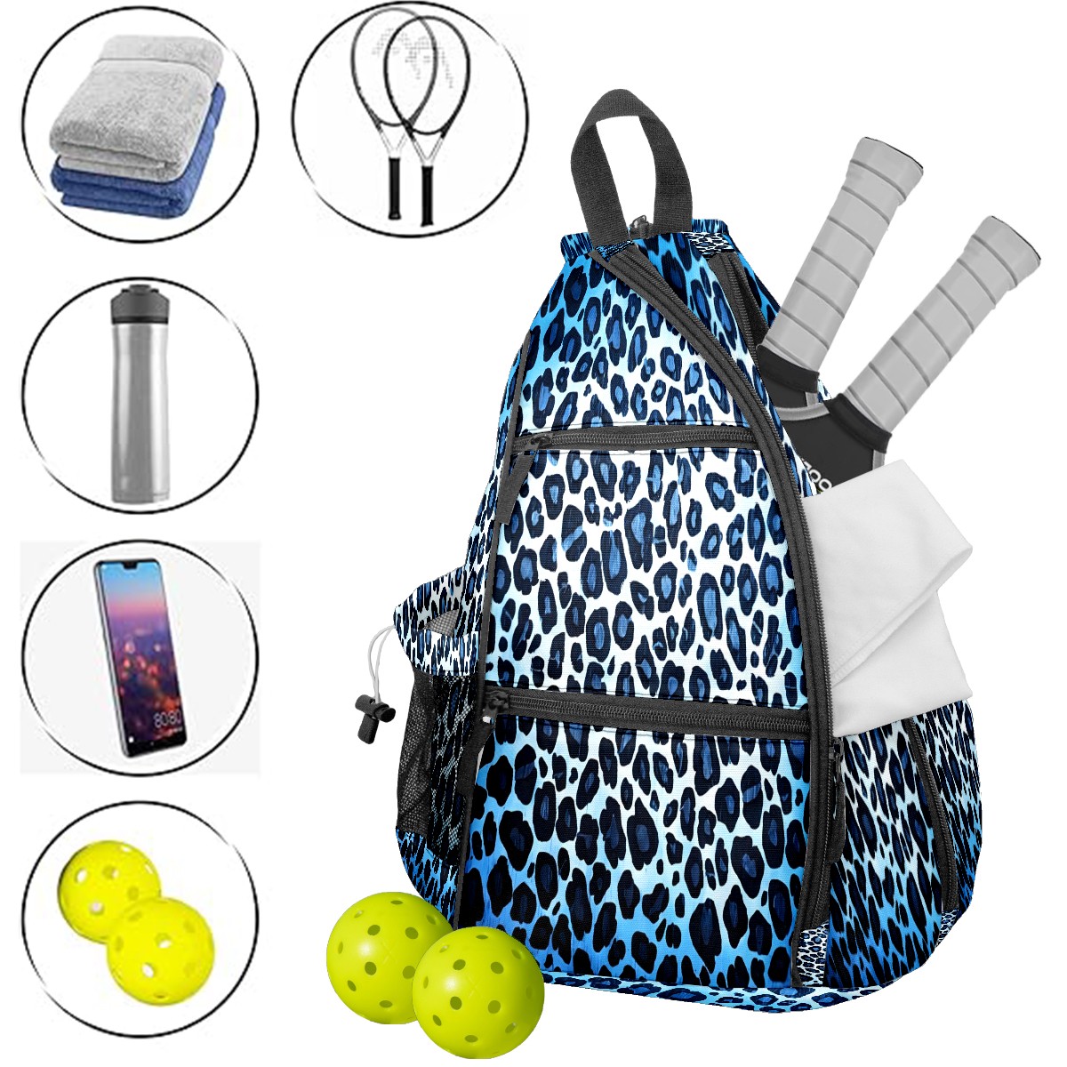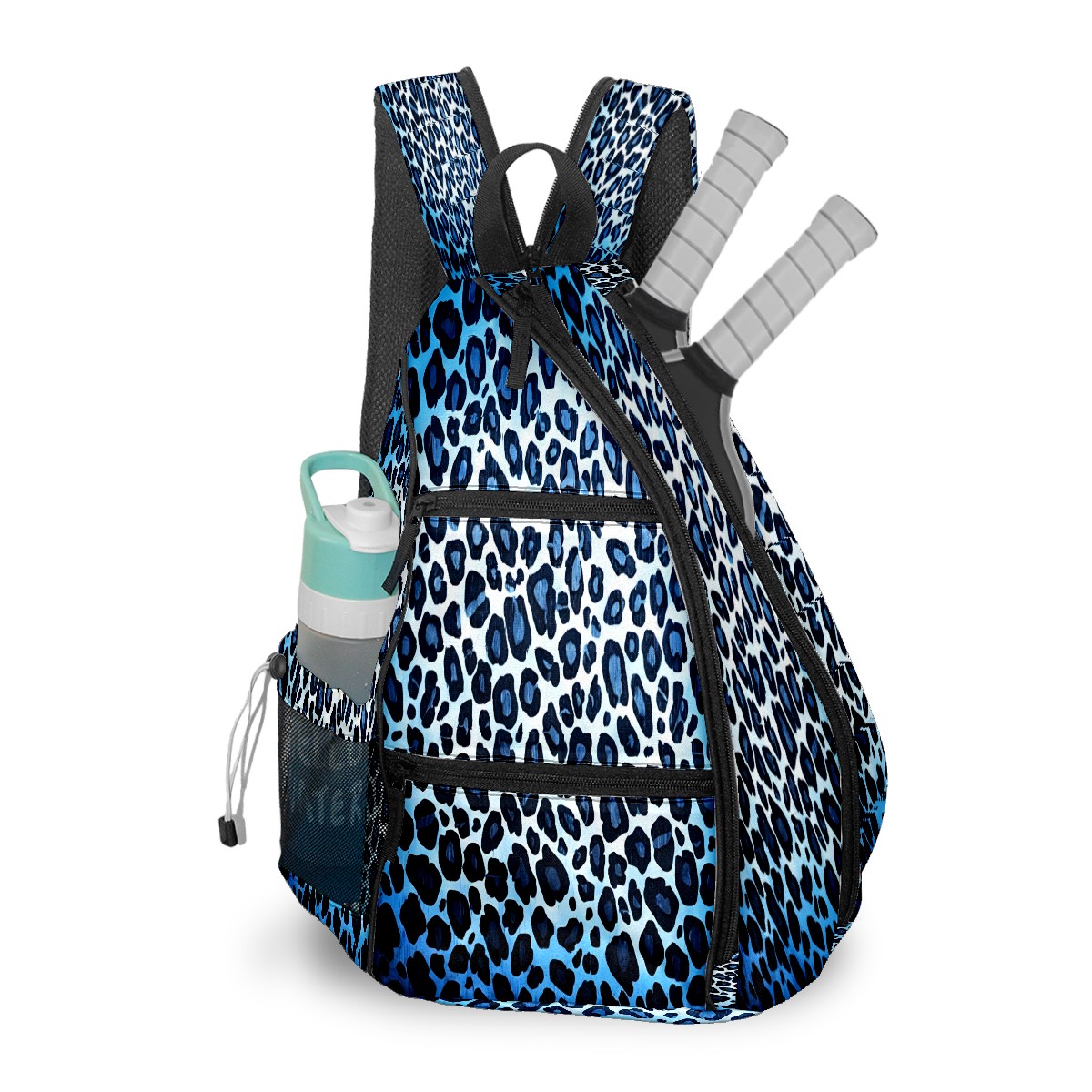 Pickleball Bag with Padded Back, Blue Leopard Print Multi-Compartment Paddle Backpack, Lightweight Nylon Sports Bag for Men & Women