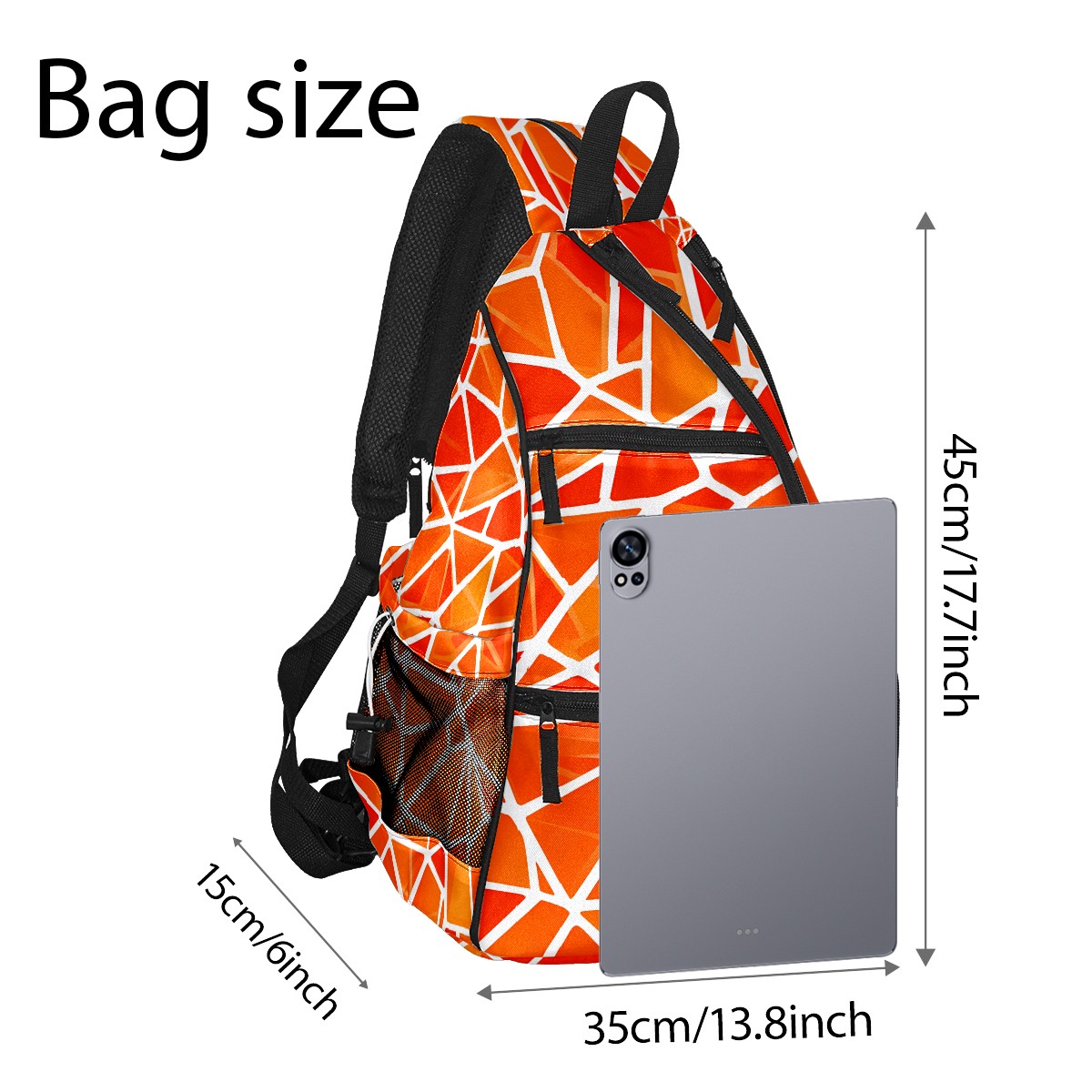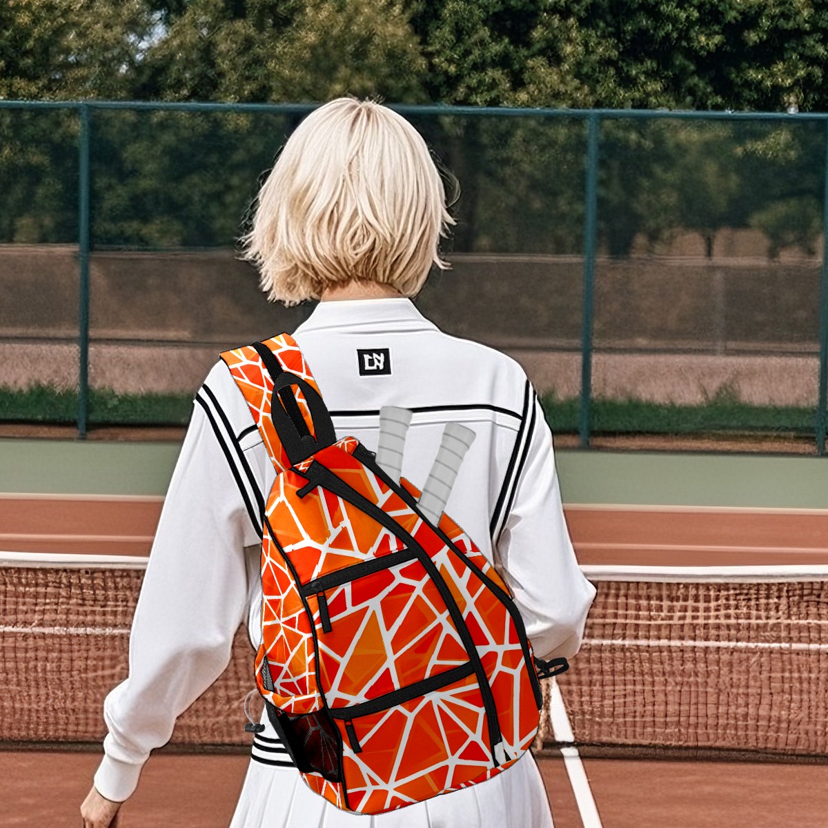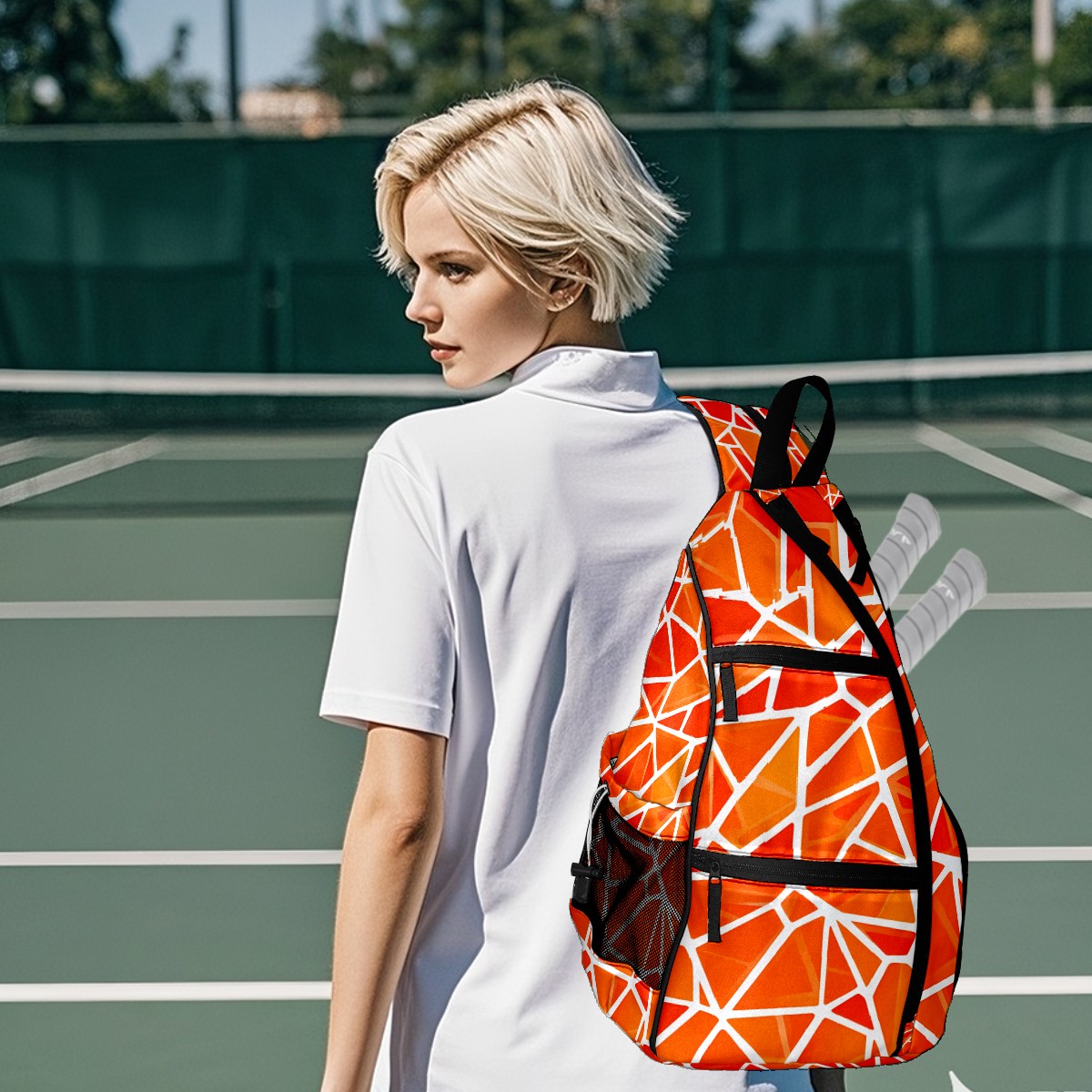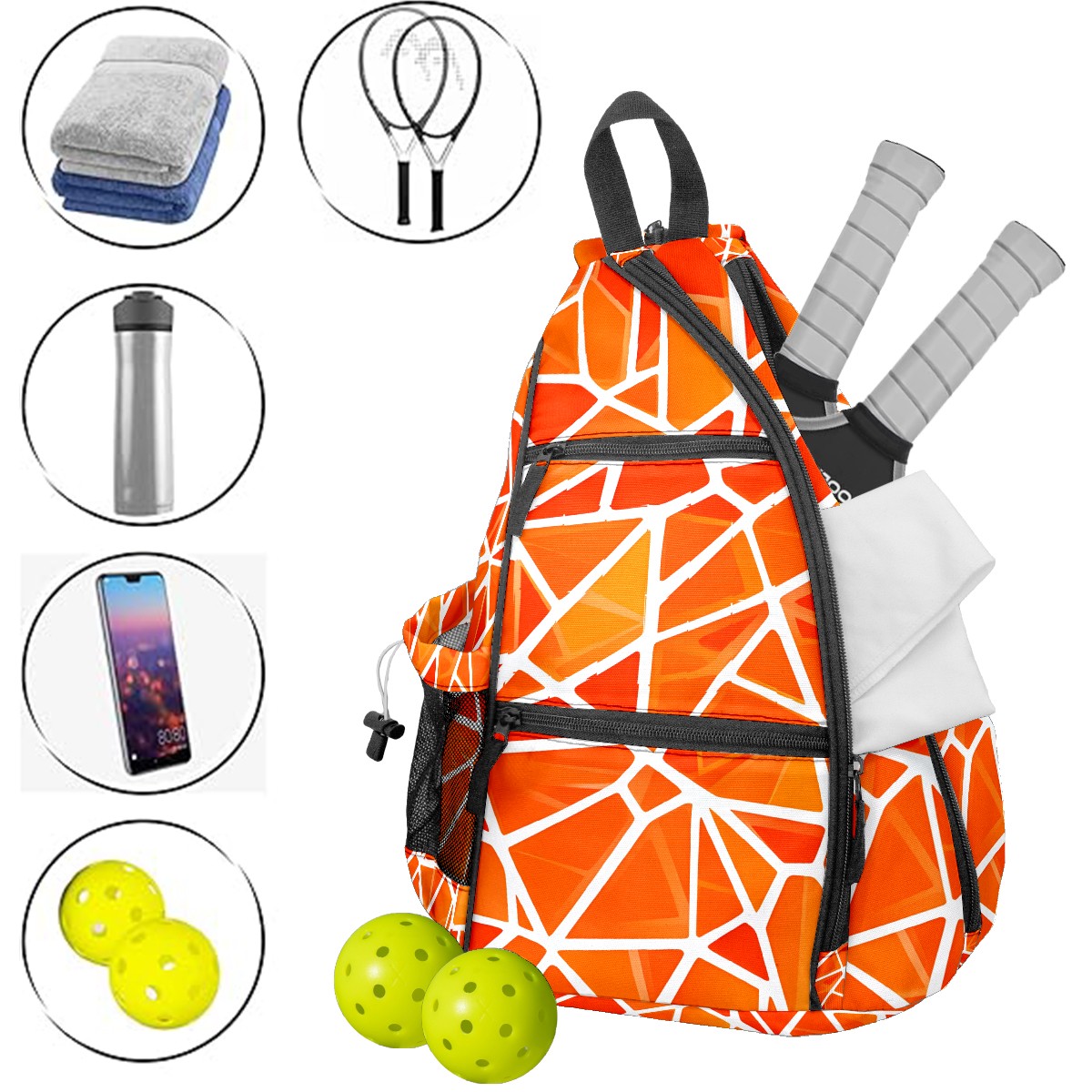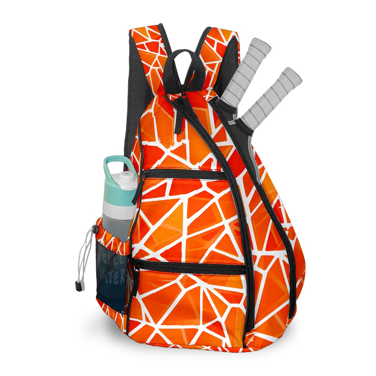 Pickleball Bag with Padded Back, Geometric Orange Multi-Compartment Paddle Backpack, Lightweight Nylon Sports Bag for Men & Women