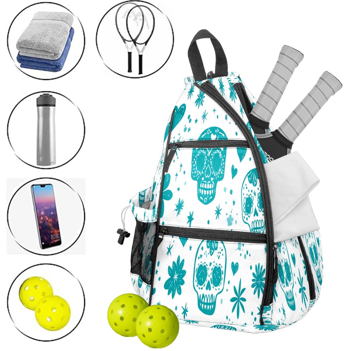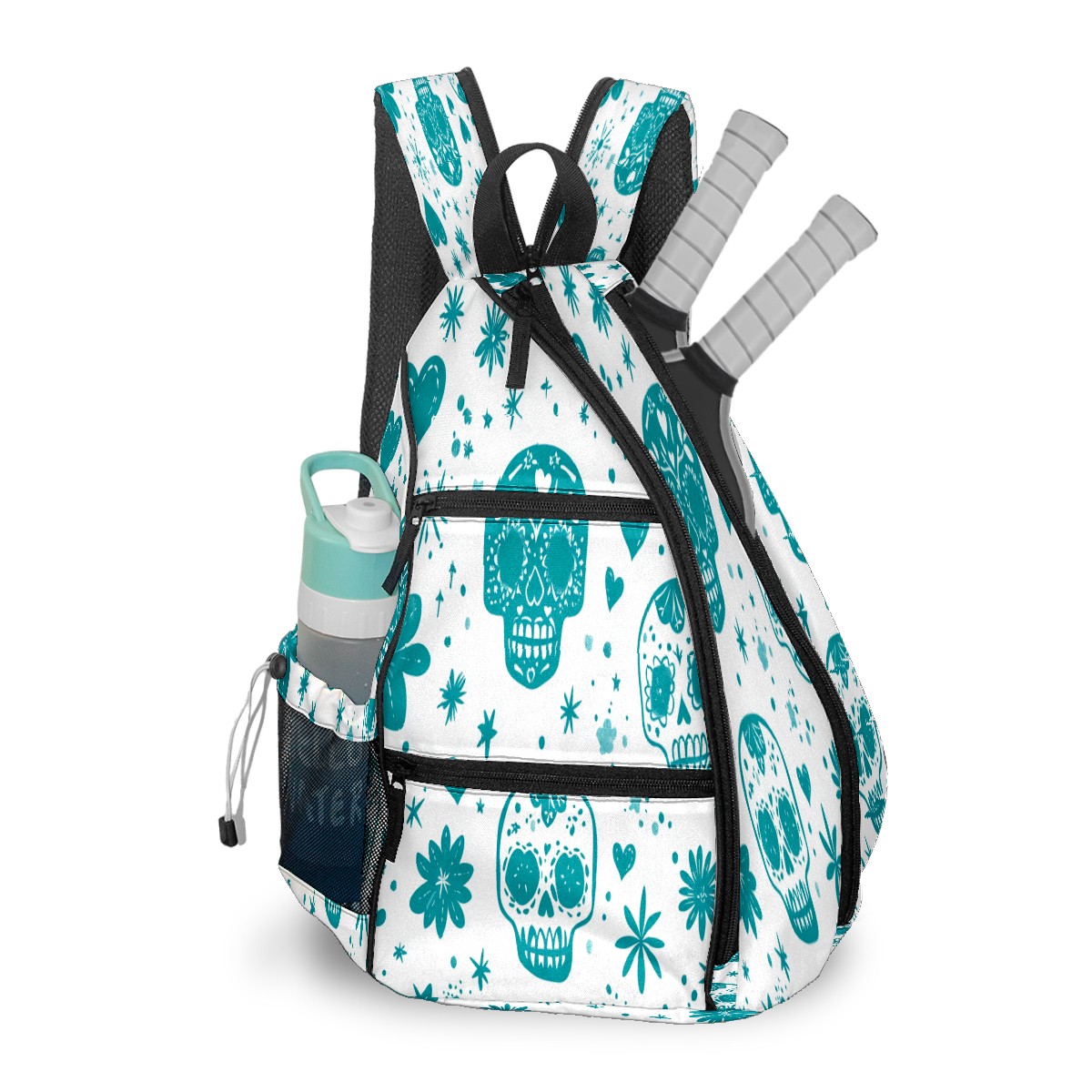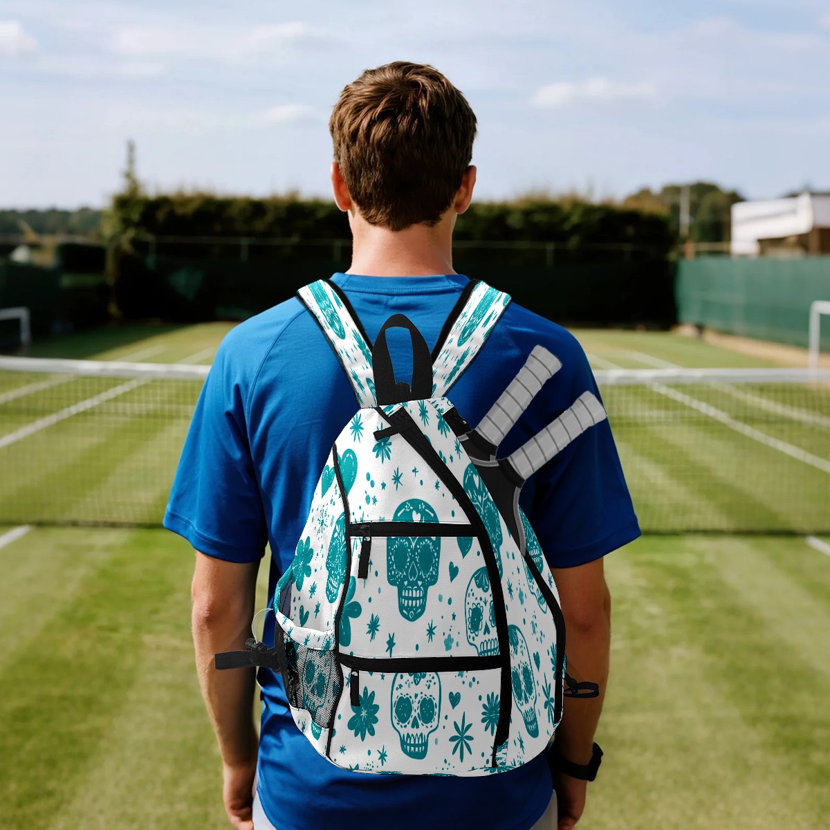 Pickleball Bag with Padded Back, Green Skull Multi-Compartment Paddle Backpack, Lightweight Nylon Sports Bag for Men & Women