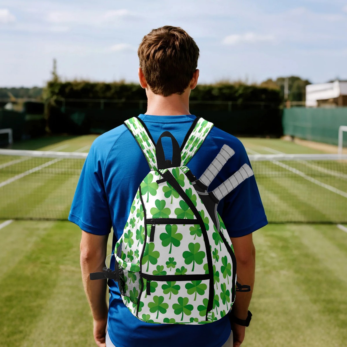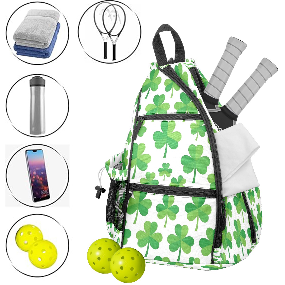 Pickleball Bag with Padded Back, Green Clover Multi-Compartment Paddle Backpack, Lightweight Nylon Sports Bag for Men & Women
