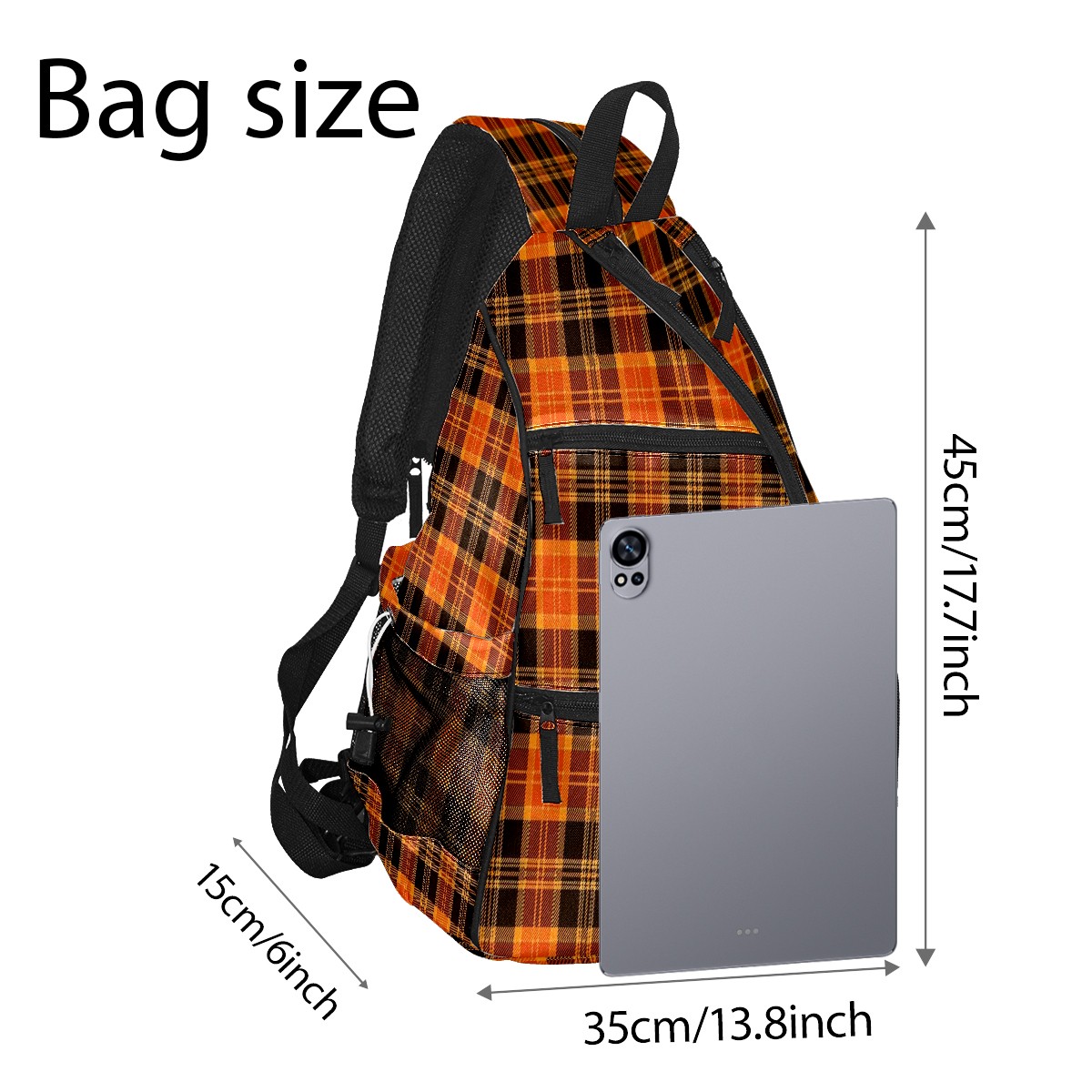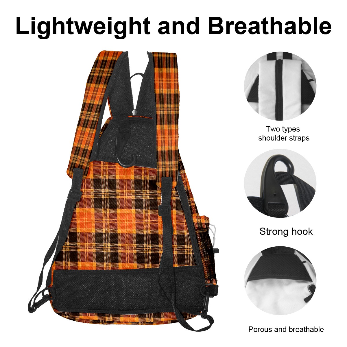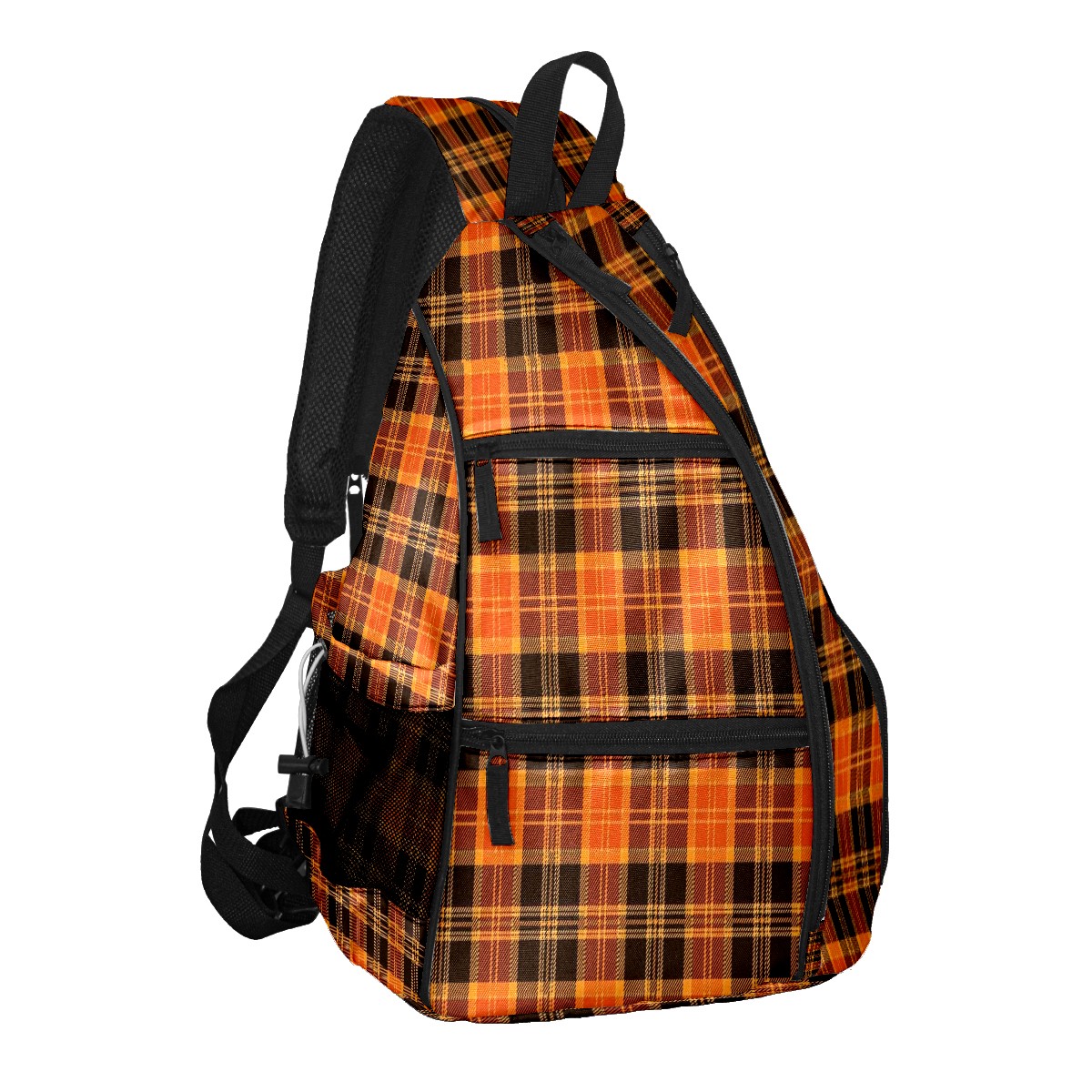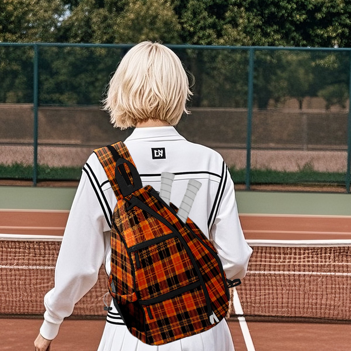 Pickleball Sling Bag for Women and Men - Backpack with Nylon Fabric/Woven Strap/Mesh Pocket/Fence Hook/Large Capacity/Adjustable Sling Bag Orange Black Grid Checked