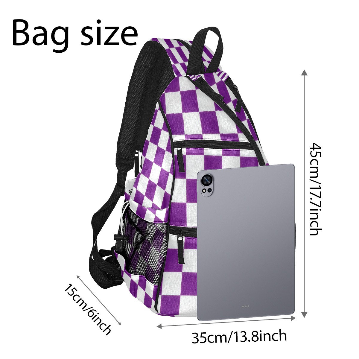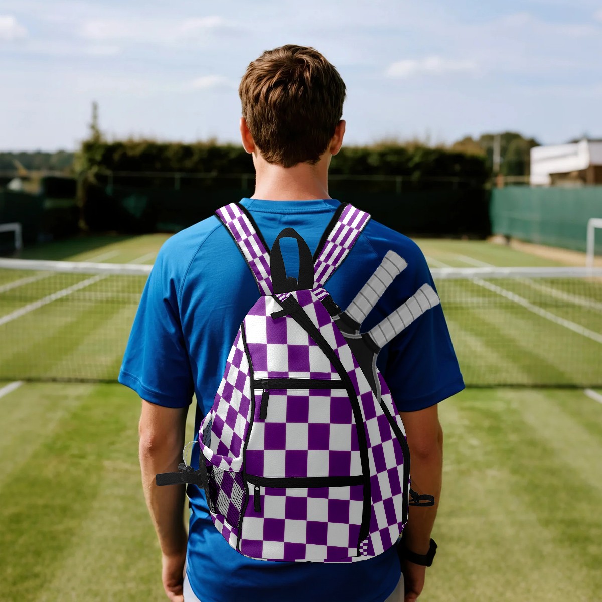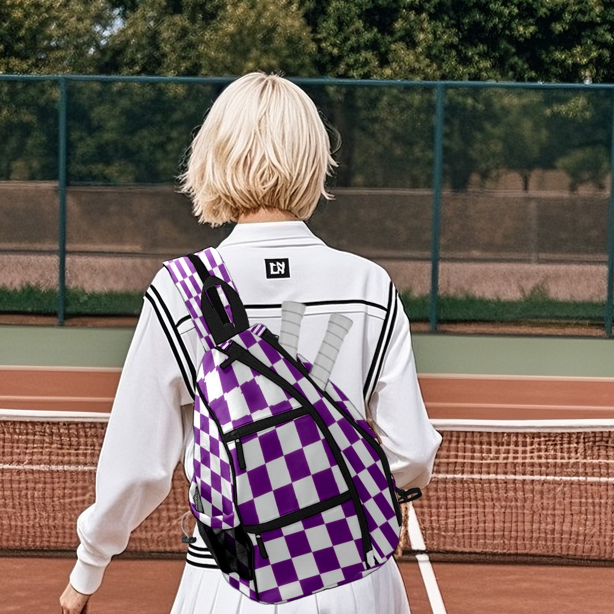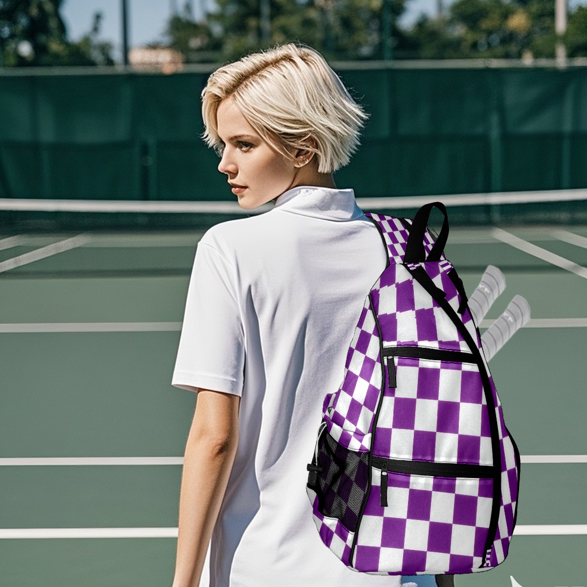 Pickleball Sling Bag for Women and Men - Backpack with Nylon Fabric/Woven Strap/Mesh Pocket/Fence Hook/Large Capacity/Adjustable Sling Bag Purple Checkered