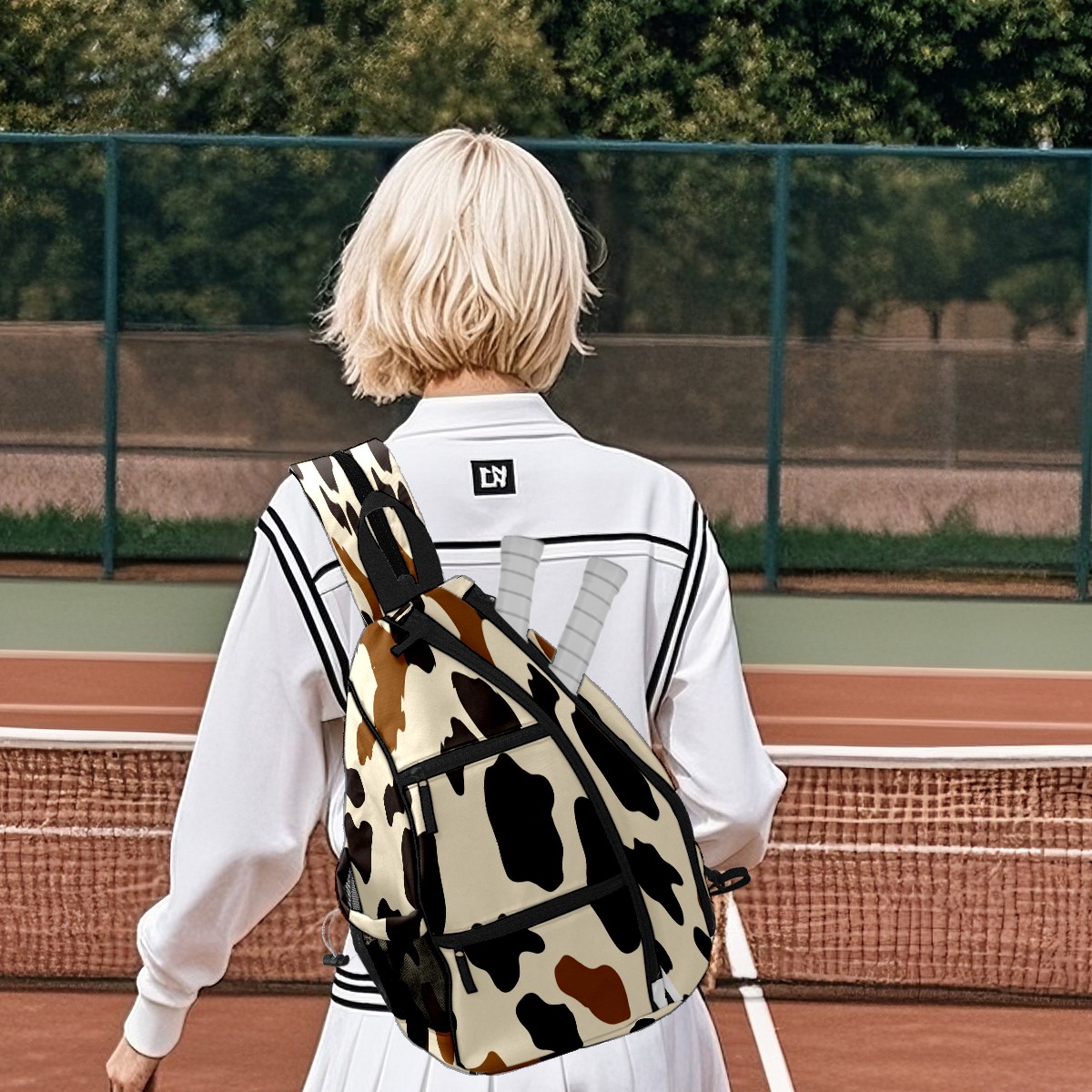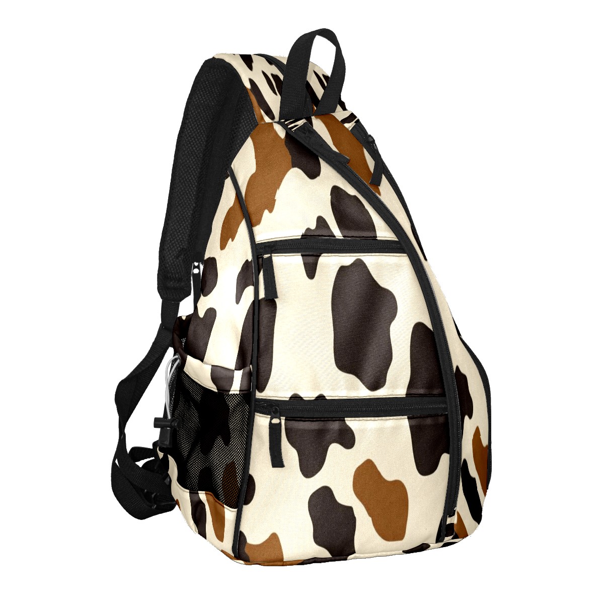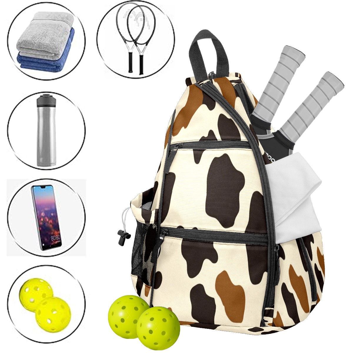 Pickleball Sling Bag for Women and Men - Backpack with Nylon Fabric/Woven Strap/Mesh Pocket/Fence Hook/Large Capacity/Adjustable Sling Bag Cow Print Pattern