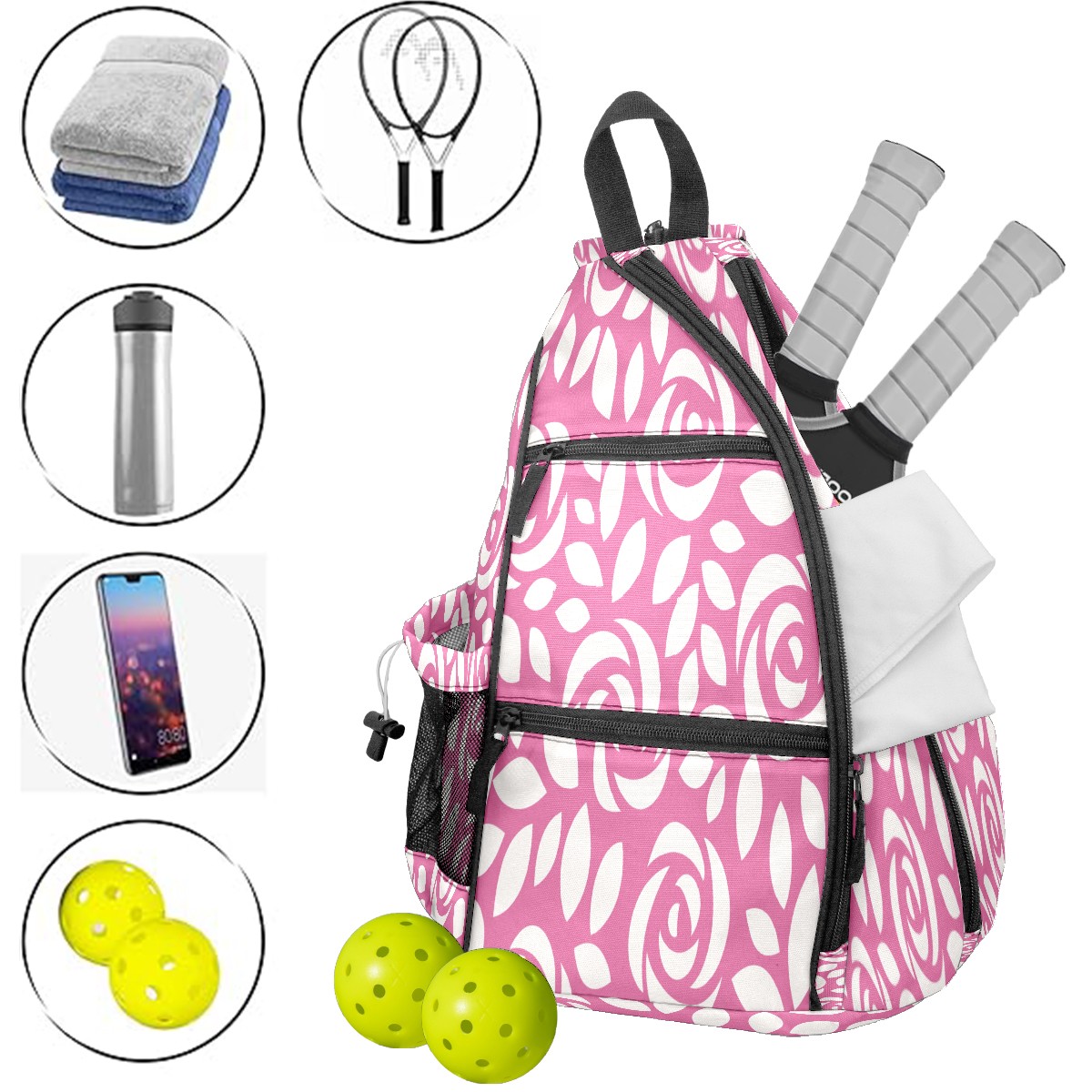 Pickleball Sling Bag for Women and Men - Backpack with Nylon Fabric/Woven Strap/Mesh Pocket/Fence Hook/Large Capacity/Adjustable Sling Bag Pink Flower Rose