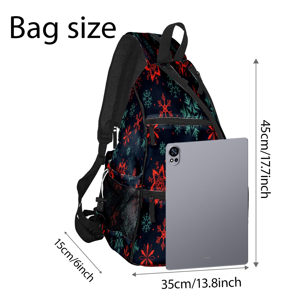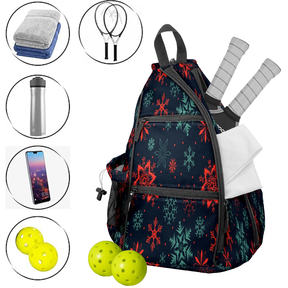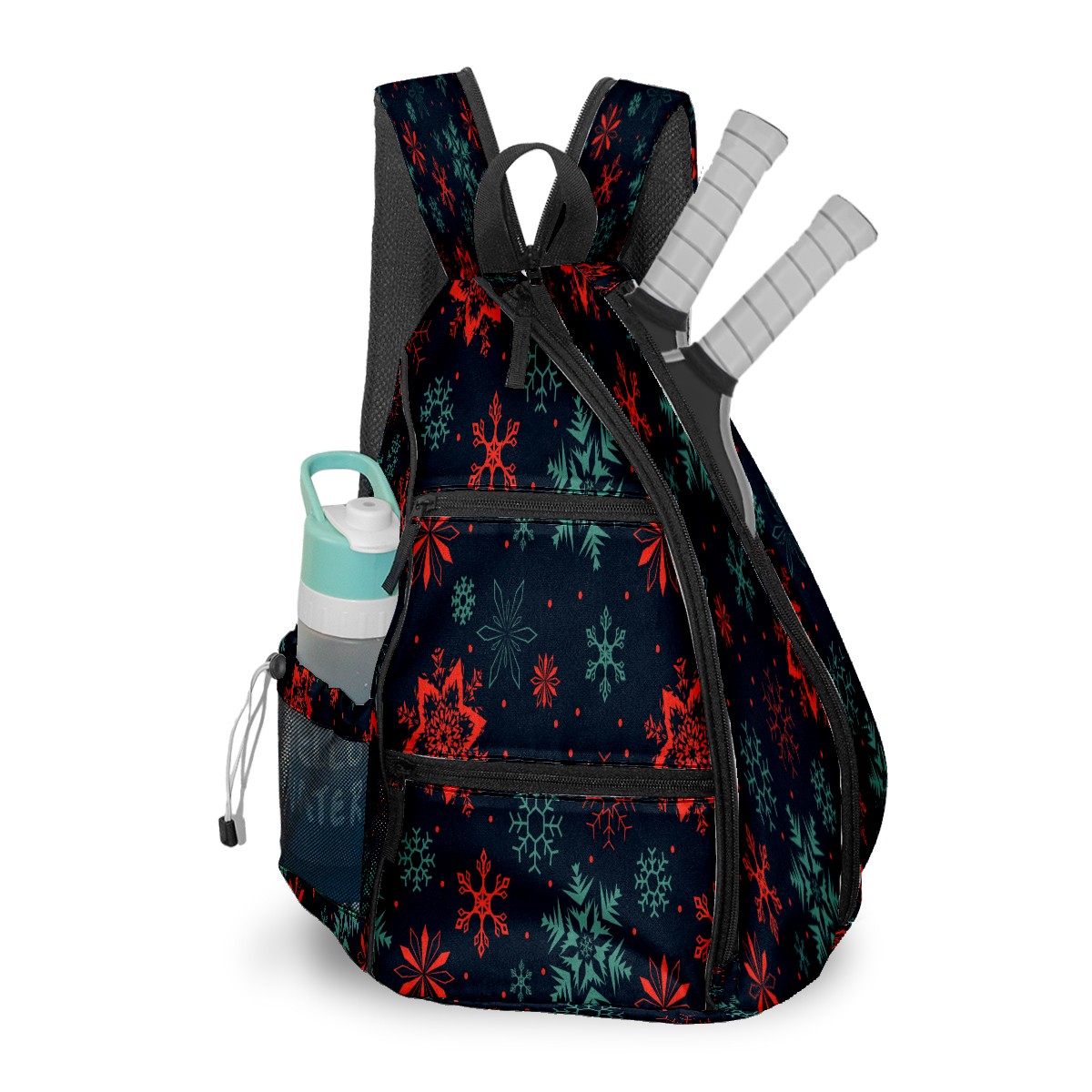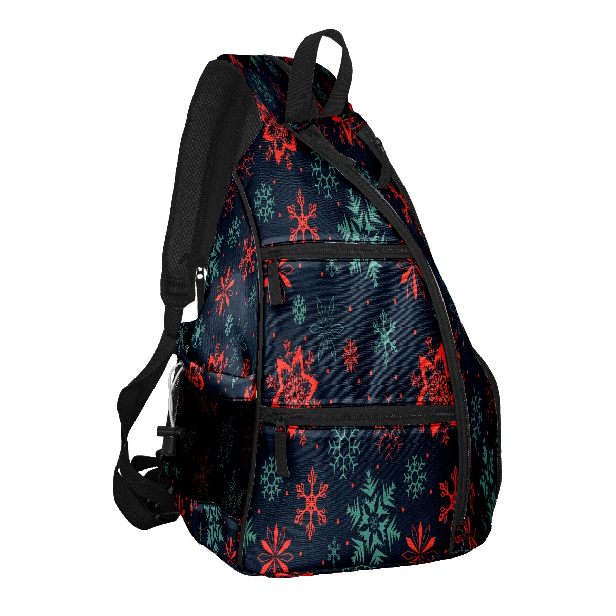 Pickleball Sling Bag for Women and Men - Backpack with Nylon Fabric/Woven Strap/Mesh Pocket/Fence Hook/Large Capacity/Adjustable Sling Bag Winter Snowflake Pattern
