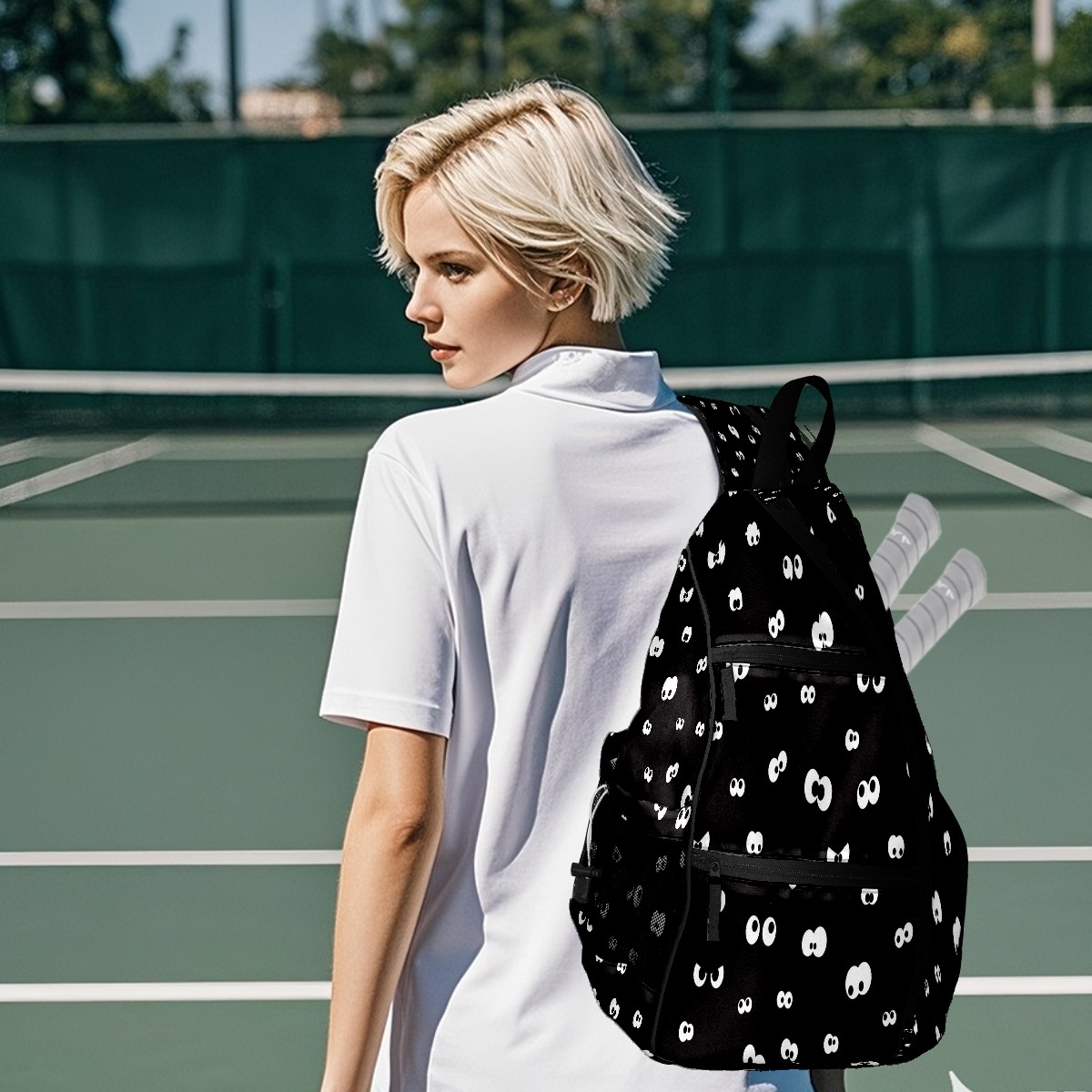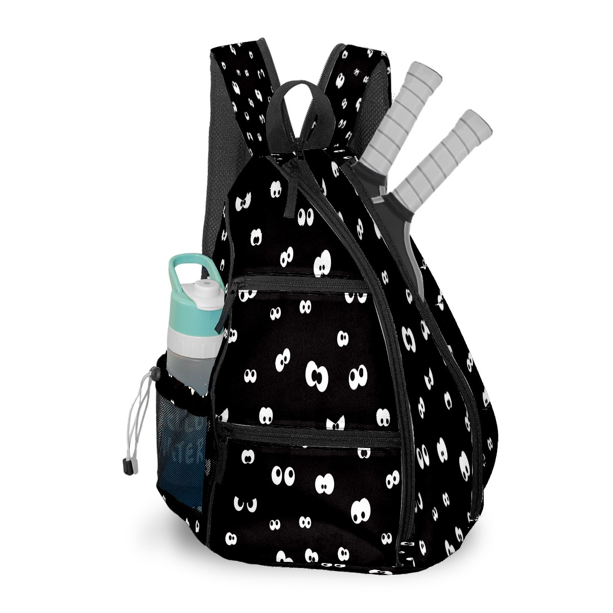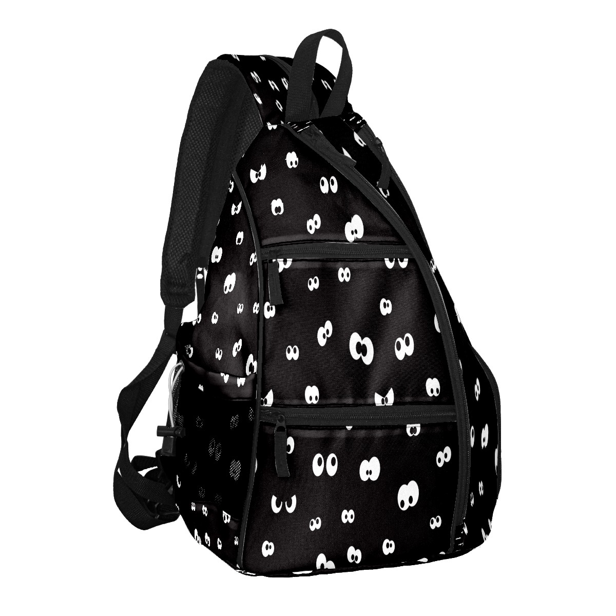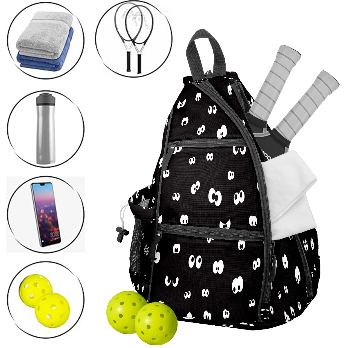 Pickleball Sling Bag for Women and Men - Backpack with Nylon Fabric/Woven Strap/Mesh Pocket/Fence Hook/Large Capacity/Adjustable Sling Bag Eyeball Black