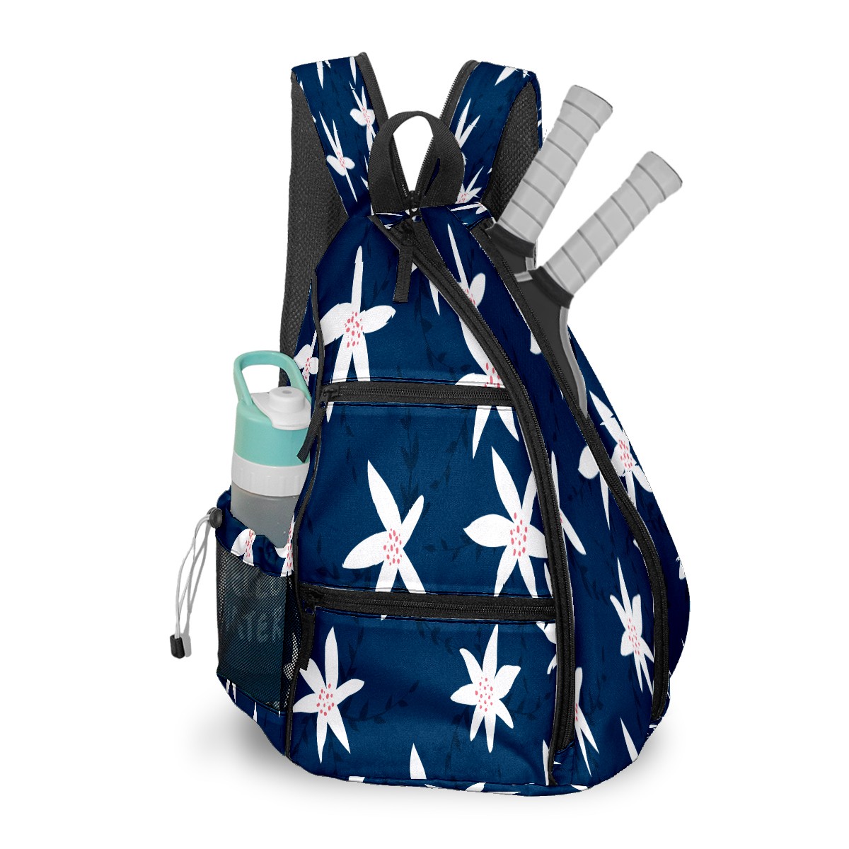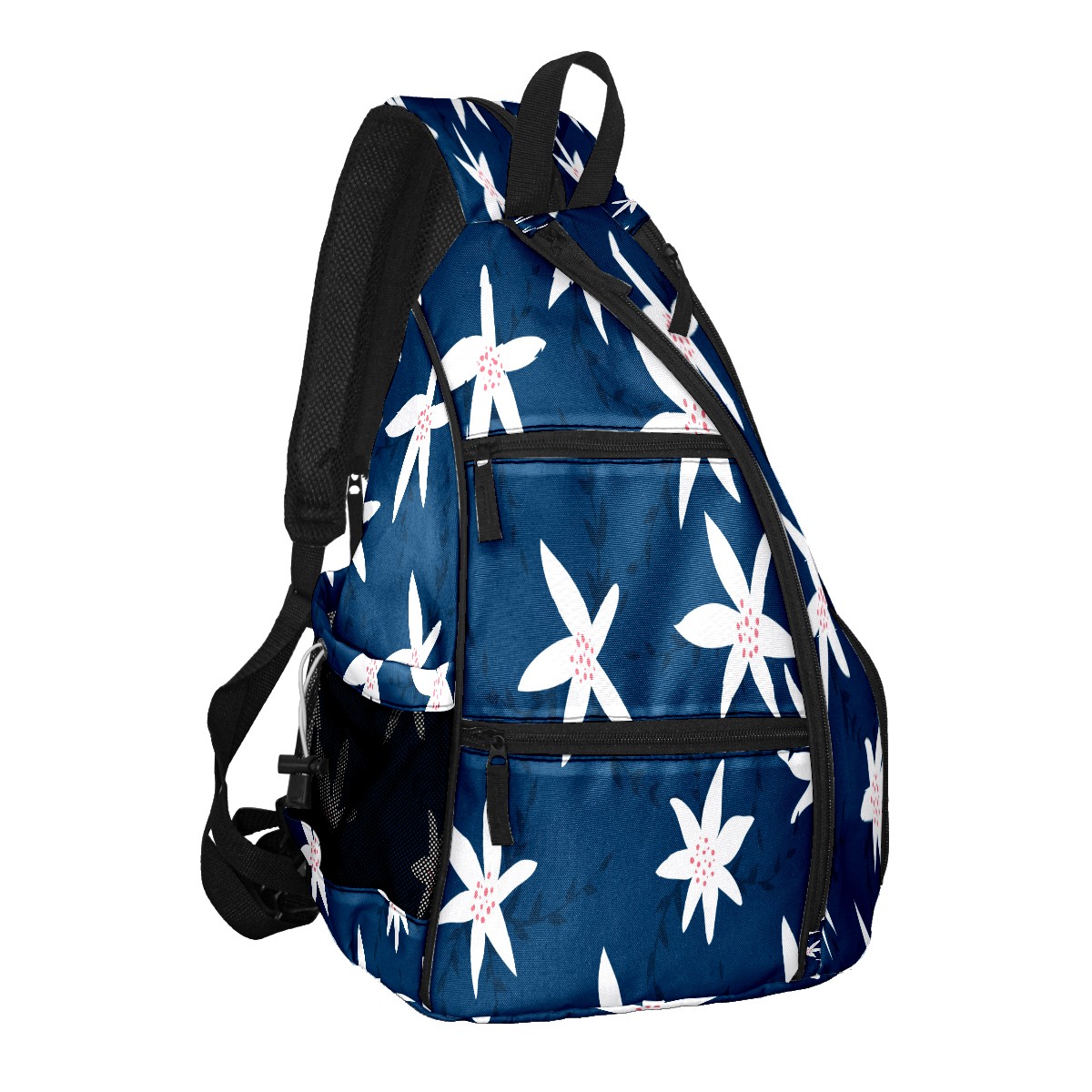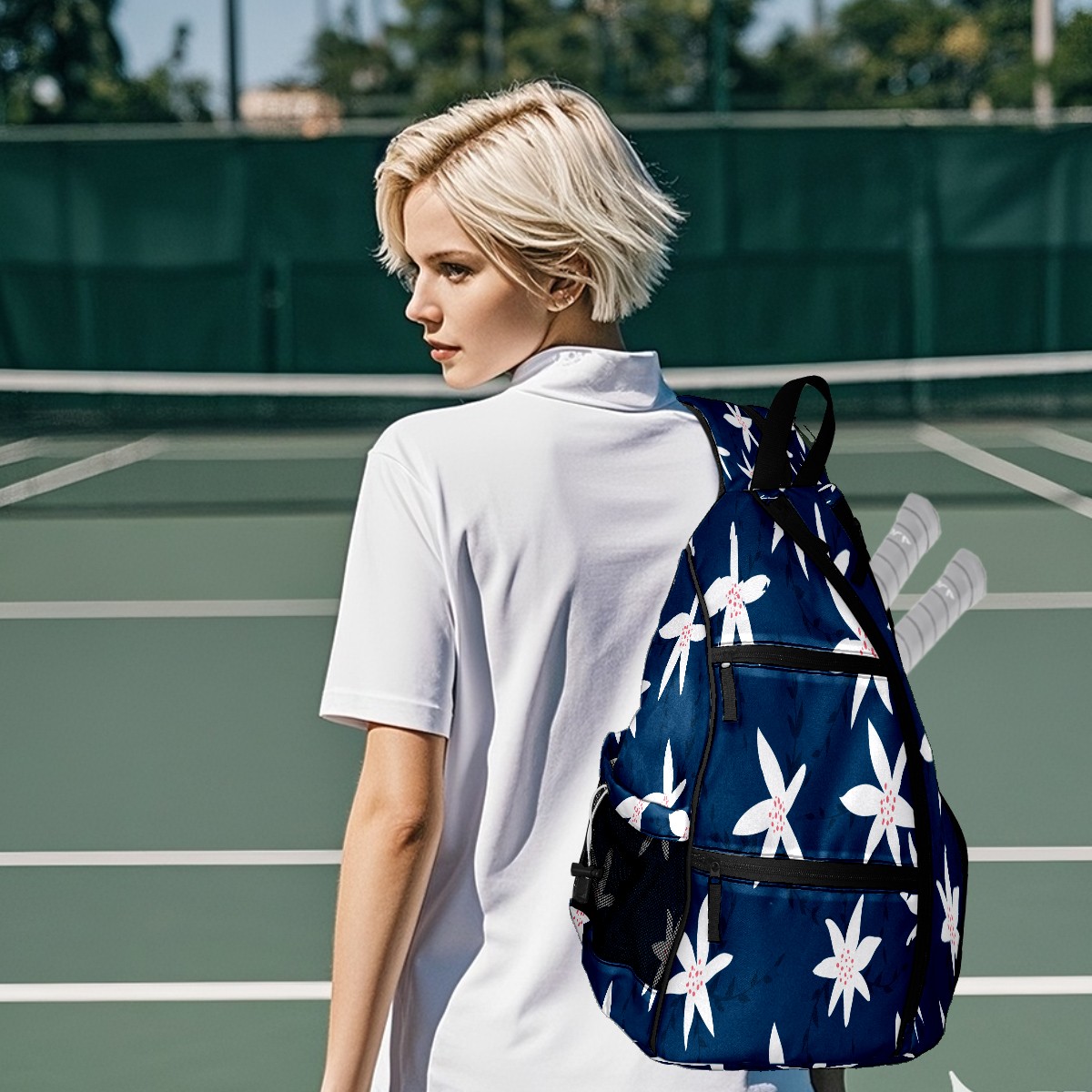 Pickleball Sling Bag for Women and Men - Backpack with Nylon Fabric/Woven Strap/Mesh Pocket/Fence Hook/Large Capacity/Adjustable Sling Bag Florals Pattern Navy Blue