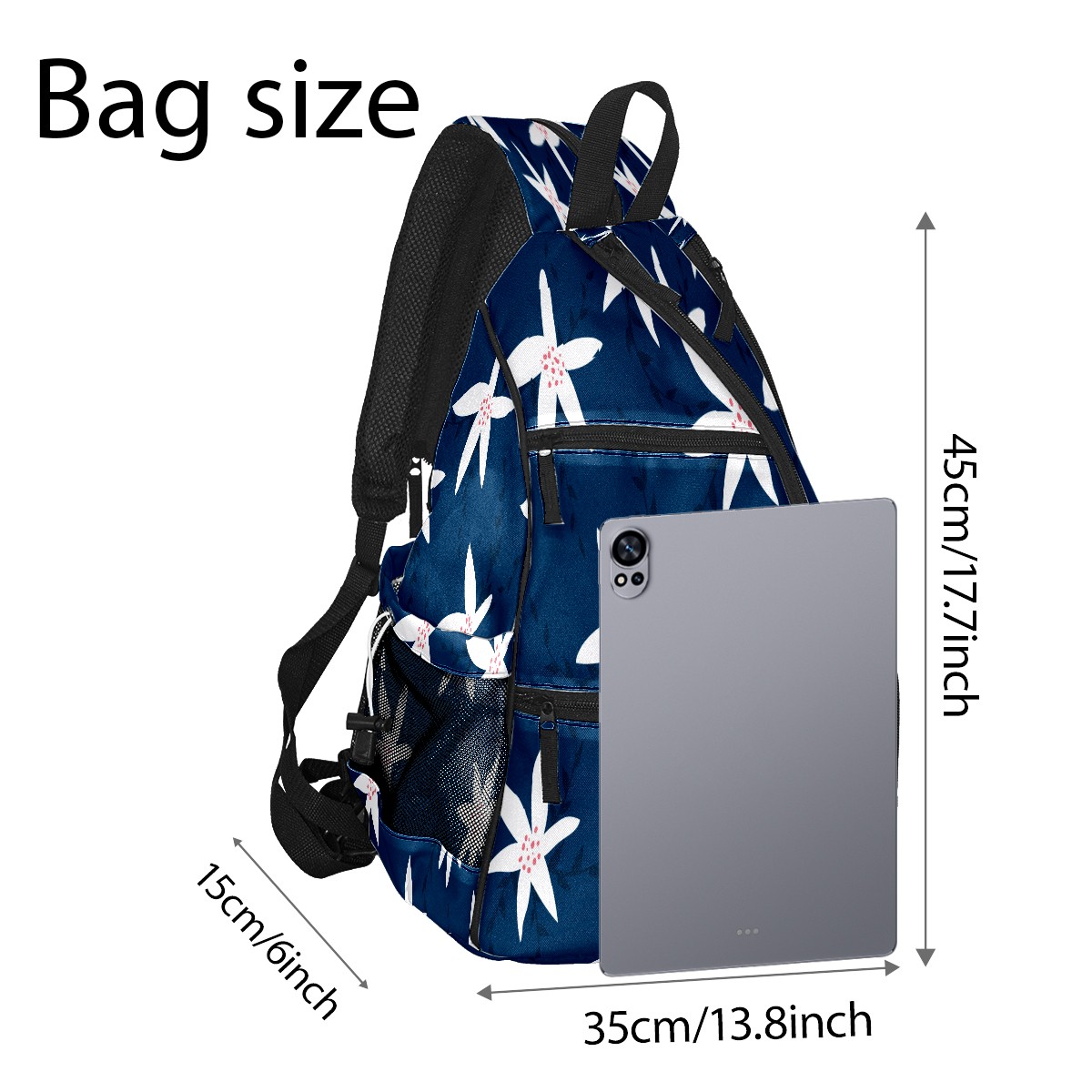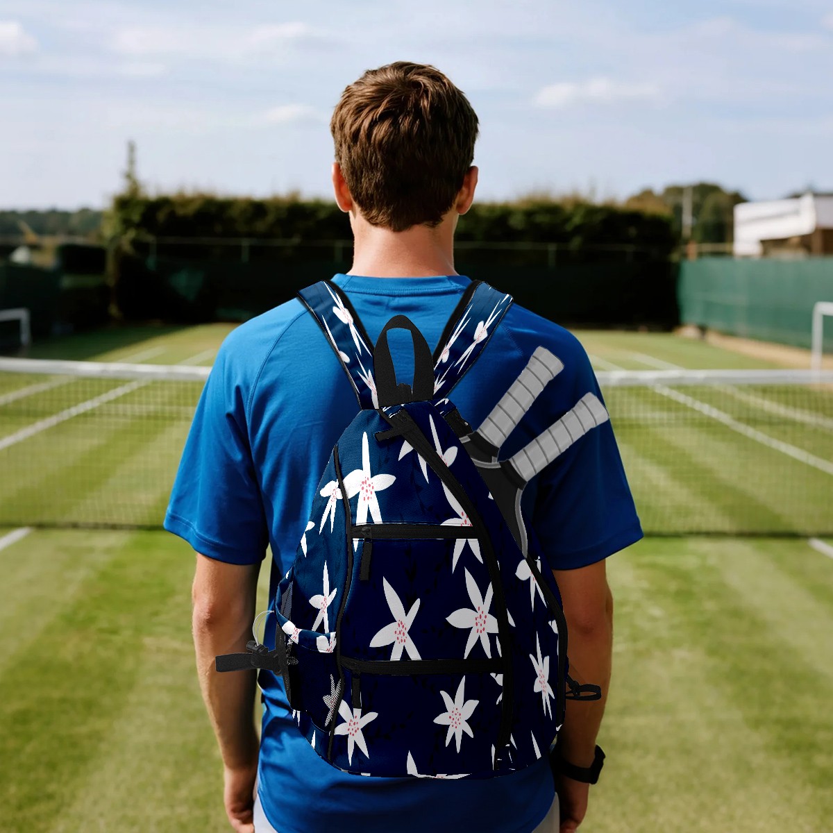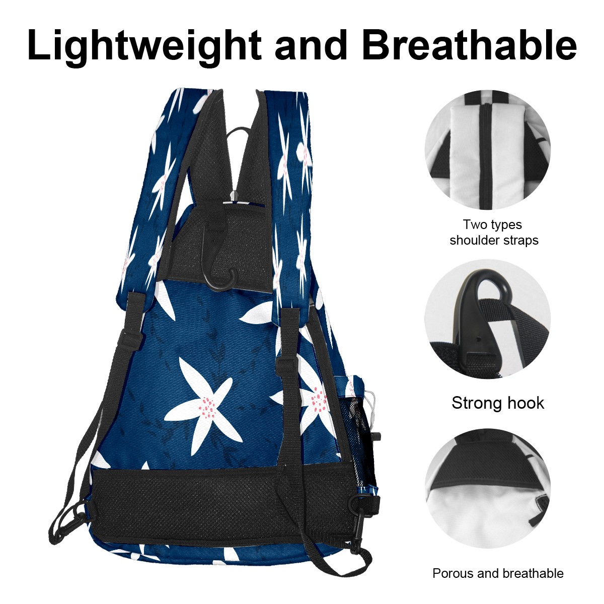 Pickleball Sling Bag for Women and Men - Backpack with Nylon Fabric/Woven Strap/Mesh Pocket/Fence Hook/Large Capacity/Adjustable Sling Bag Florals Pattern Navy Blue
