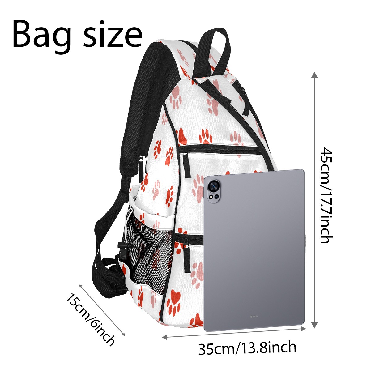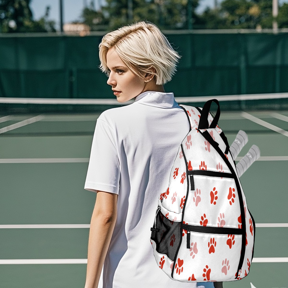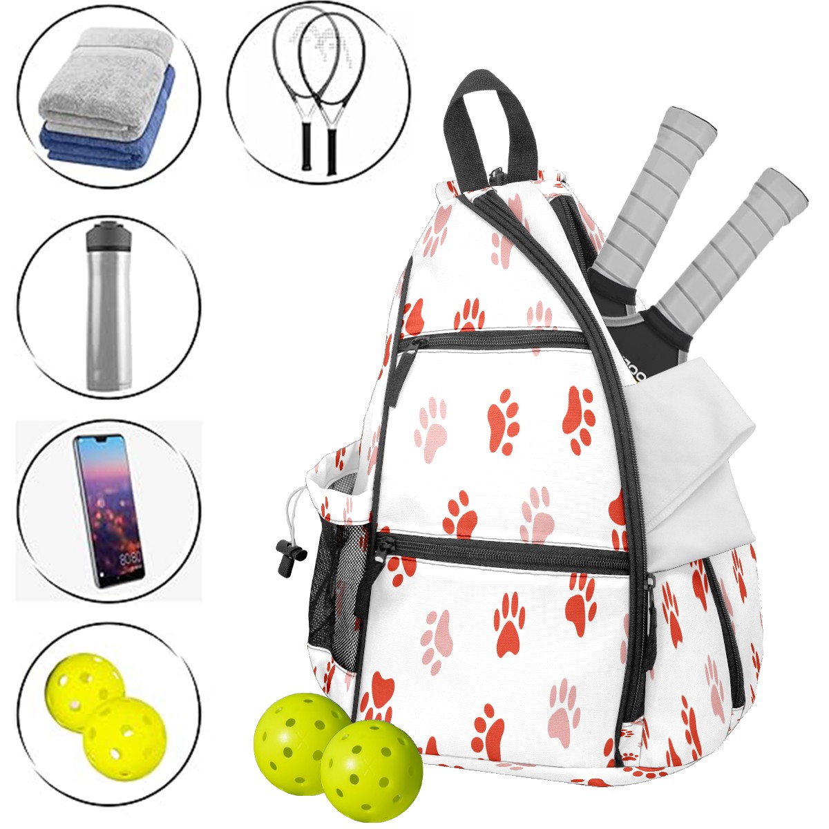 Pickleball Sling Bag for Women and Men - Backpack with Nylon Fabric/Woven Strap/Mesh Pocket/Fence Hook/Large Capacity/Adjustable Sling Bag Red Dog Pawprint