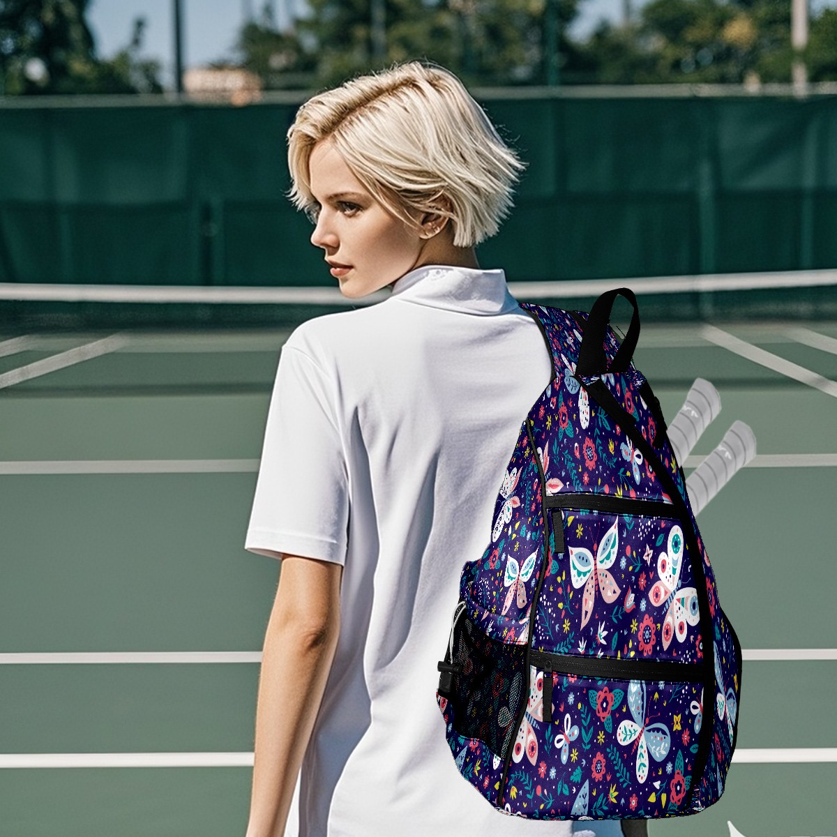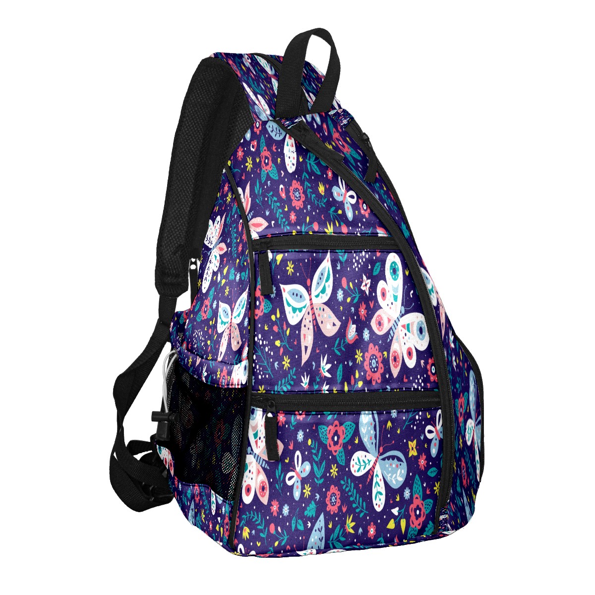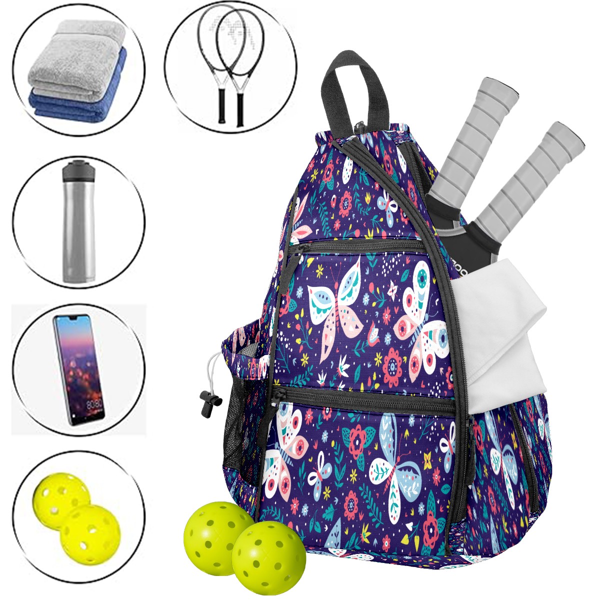 Pickleball Sling Bag for Women and Men - Backpack with Nylon Fabric/Woven Strap/Mesh Pocket/Fence Hook/Large Capacity/Adjustable Sling Bag Butterfly Florals Pattern