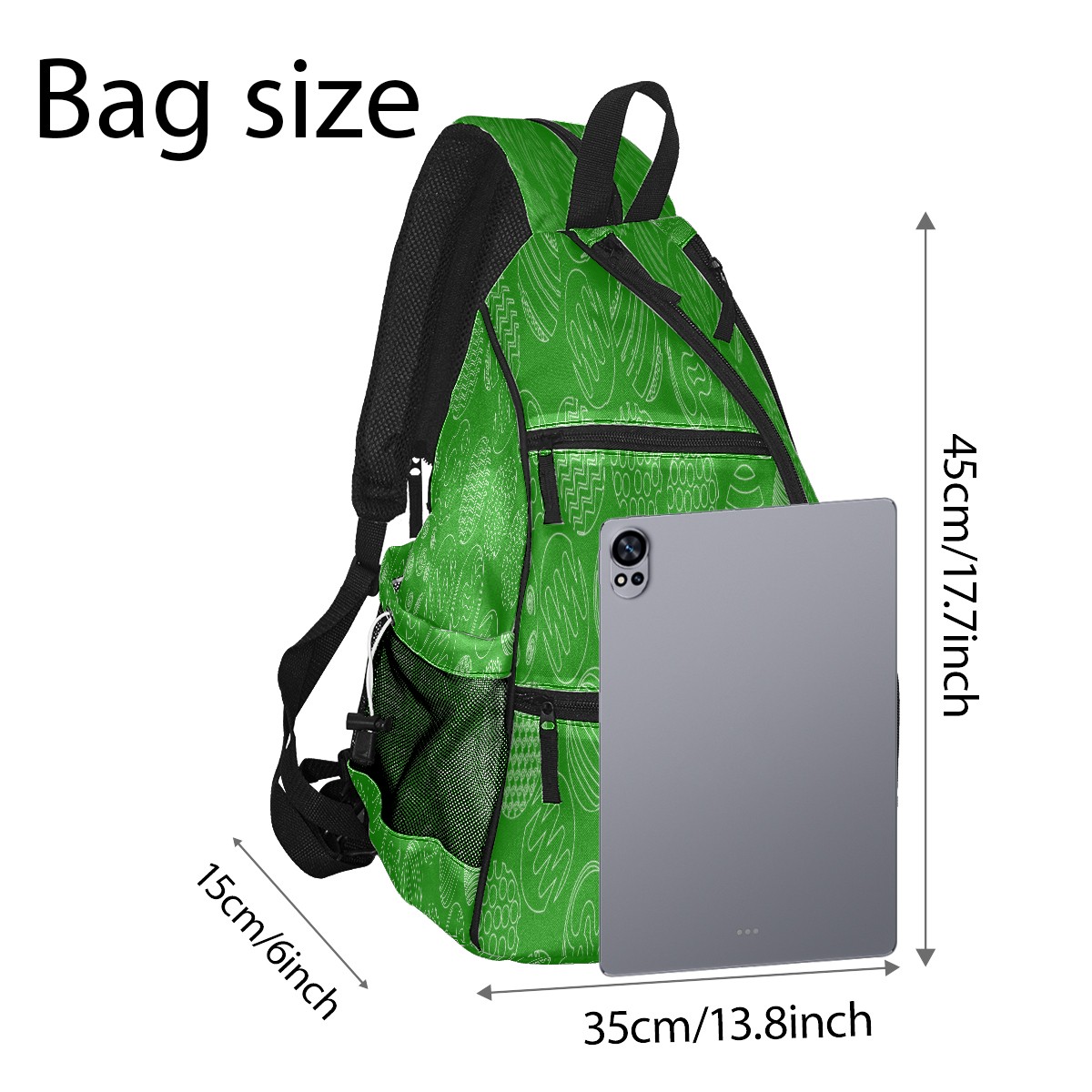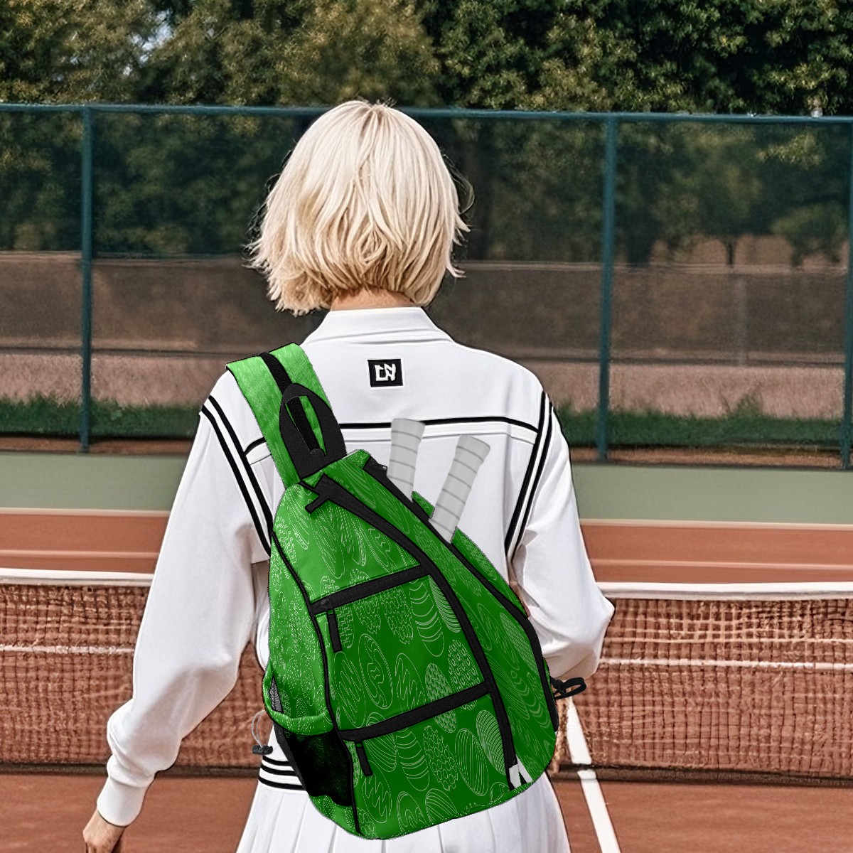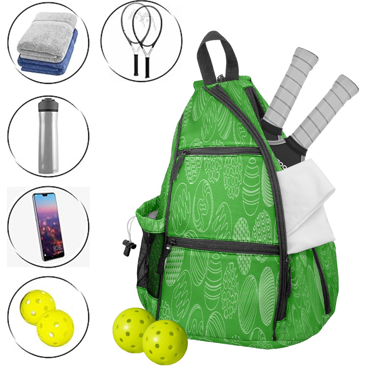 Pickleball Sling Bag for Women and Men - Backpack with Nylon Fabric/Woven Strap/Mesh Pocket/Fence Hook/Large Capacity/Adjustable Sling Bag Eggs Pattern Green