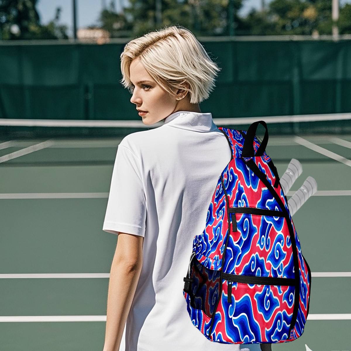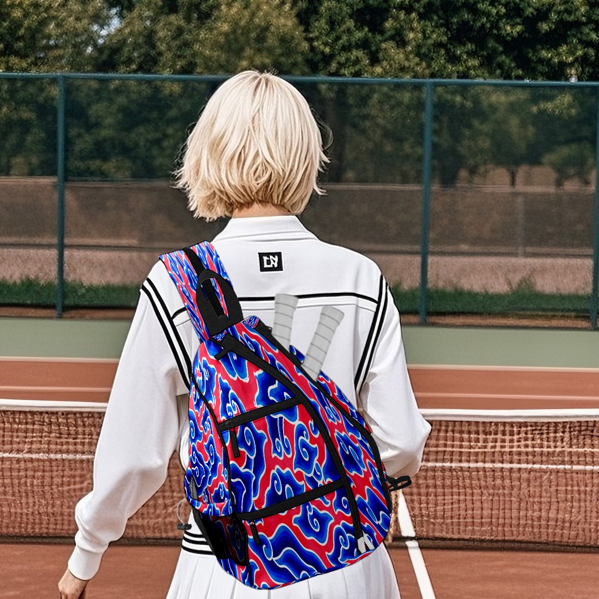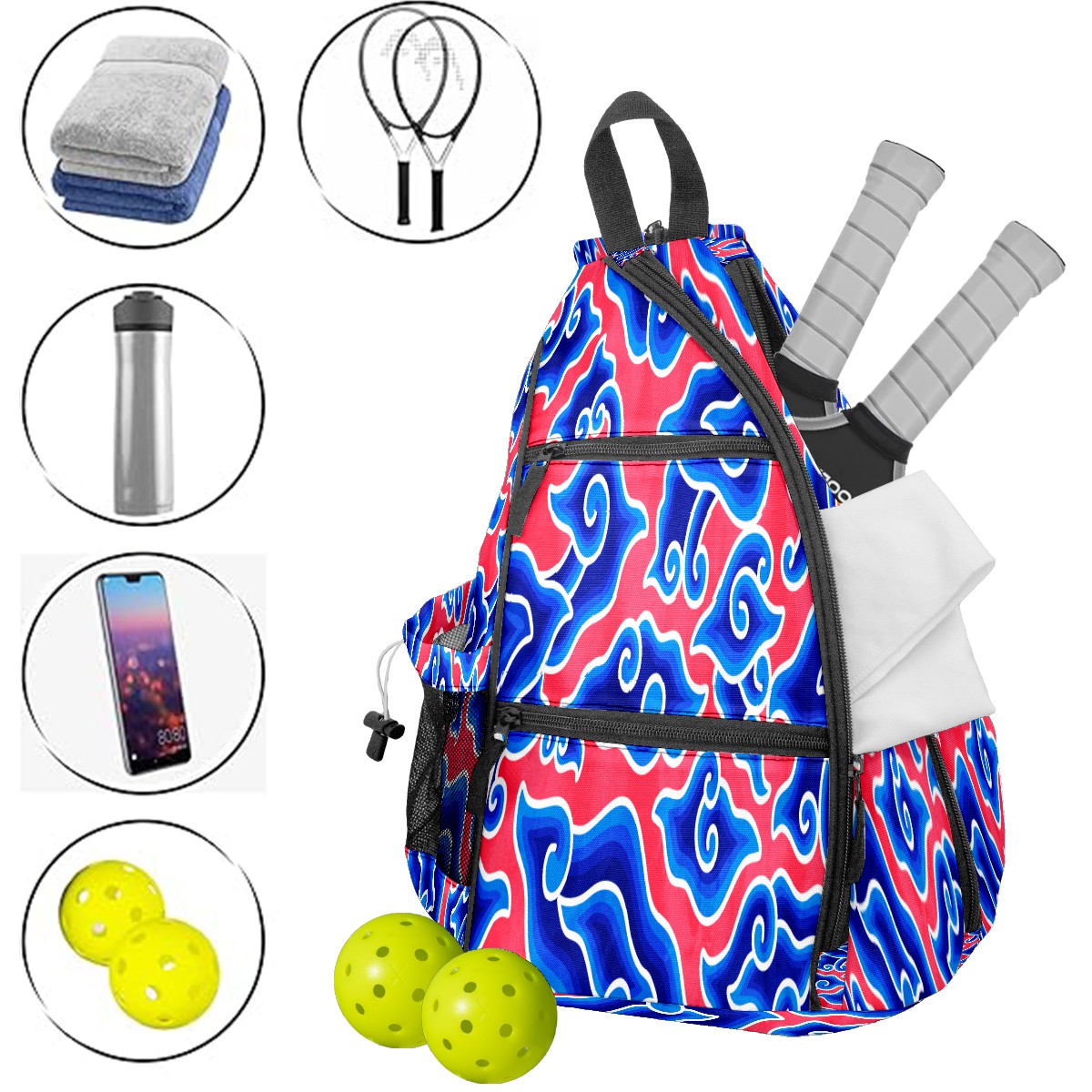 Pickleball Sling Bag for Women and Men - Backpack with Nylon Fabric/Woven Strap/Mesh Pocket/Fence Hook/Large Capacity/Adjustable Sling Bag Chinese Blue Red Cloud Megamend