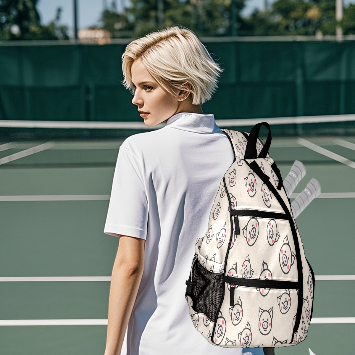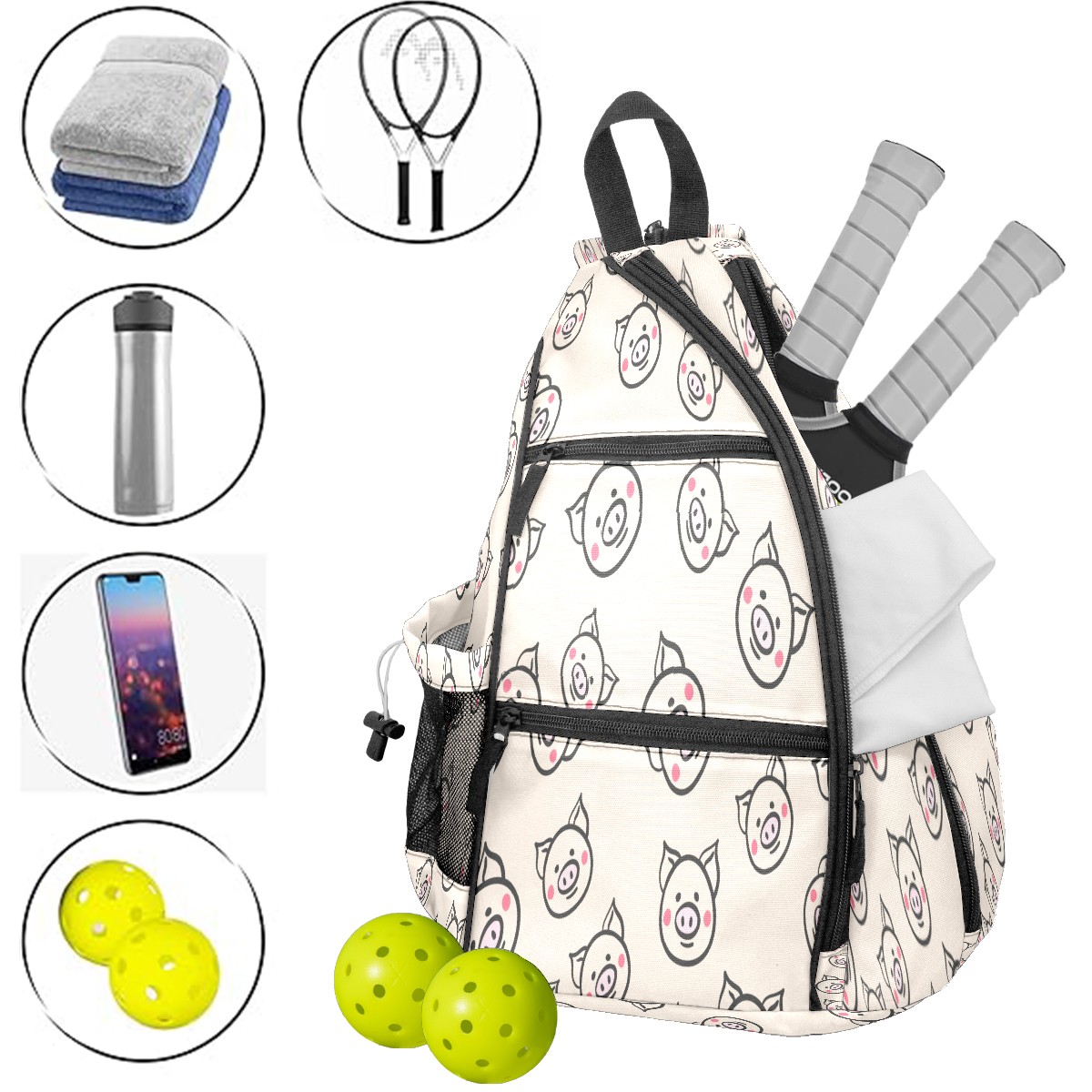 Pickleball Sling Bag for Women and Men - Backpack with Nylon Fabric/Woven Strap/Mesh Pocket/Fence Hook/Large Capacity/Adjustable Sling Bag Cute Pig