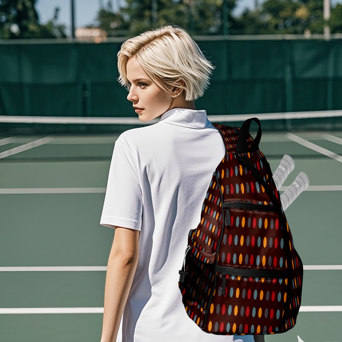 Pickleball Sling Bag for Women and Men - Backpack with Nylon Fabric/Woven Strap/Mesh Pocket/Fence Hook/Large Capacity/Adjustable Sling Bag Colorful Dots Pattern