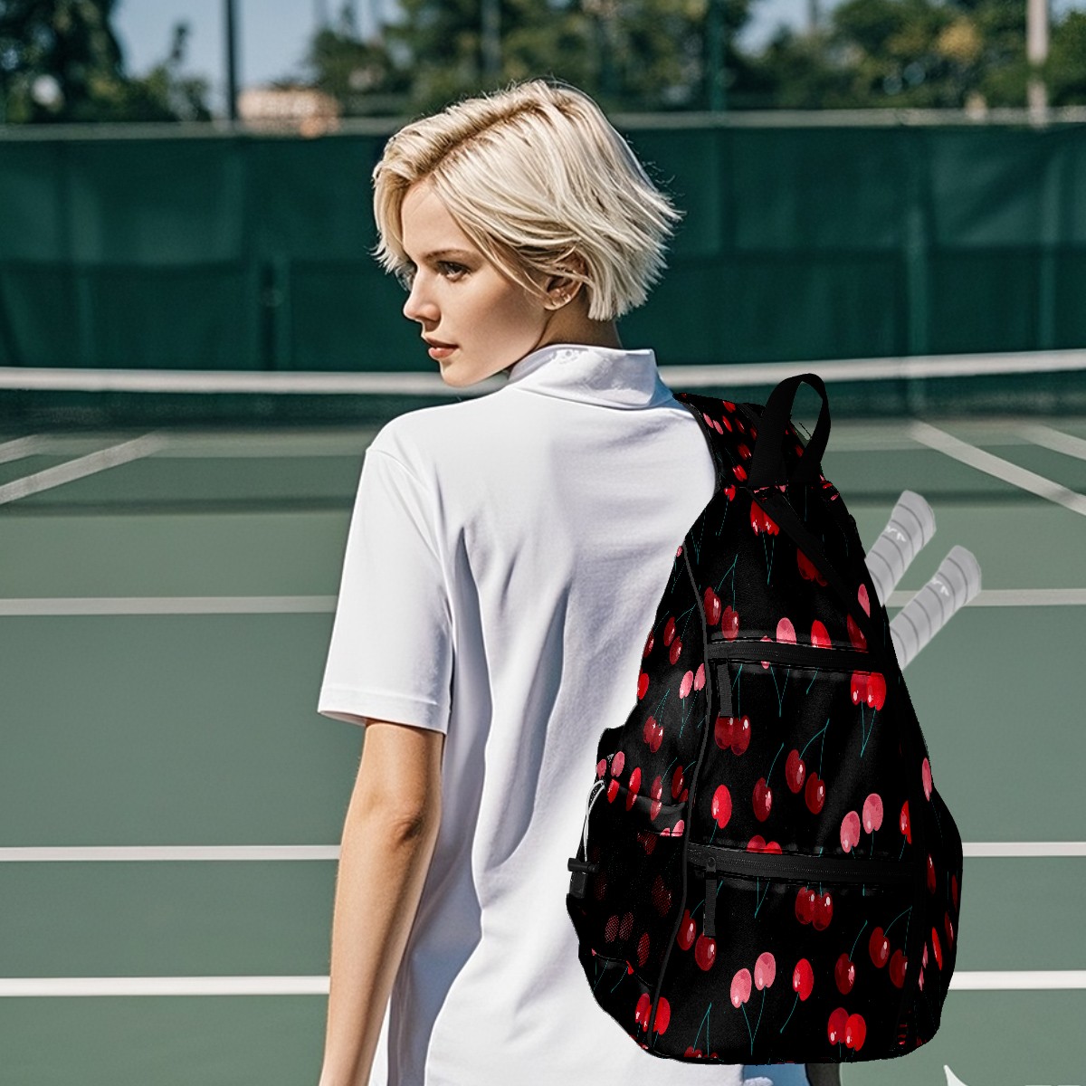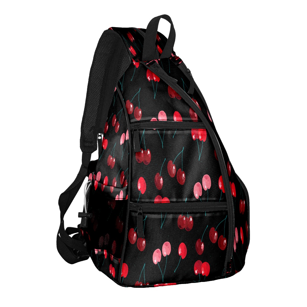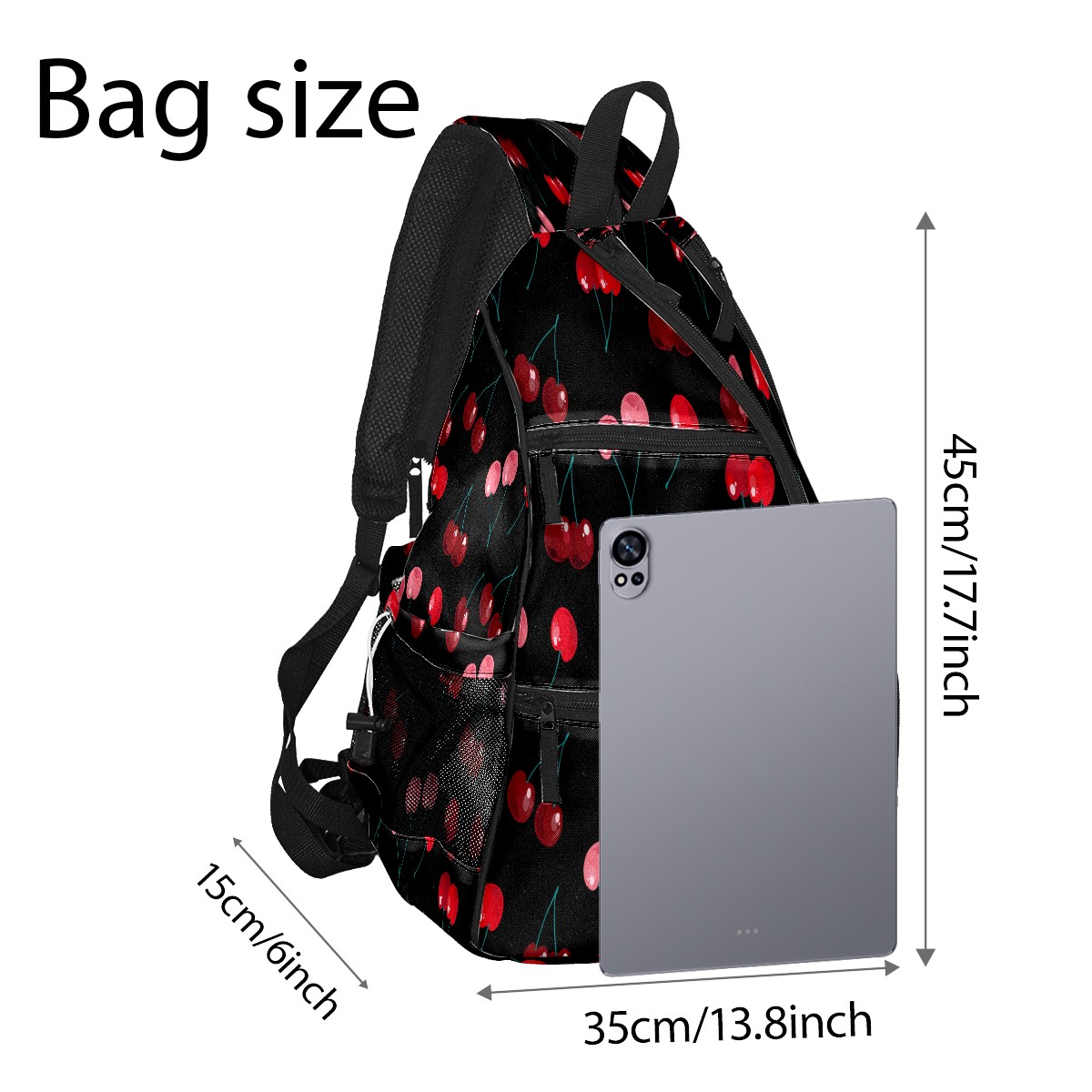 Pickleball Sling Bag for Women and Men - Backpack with Nylon Fabric/Woven Strap/Mesh Pocket/Fence Hook/Large Capacity/Adjustable Sling Bag Red Pink Cherries Black Background