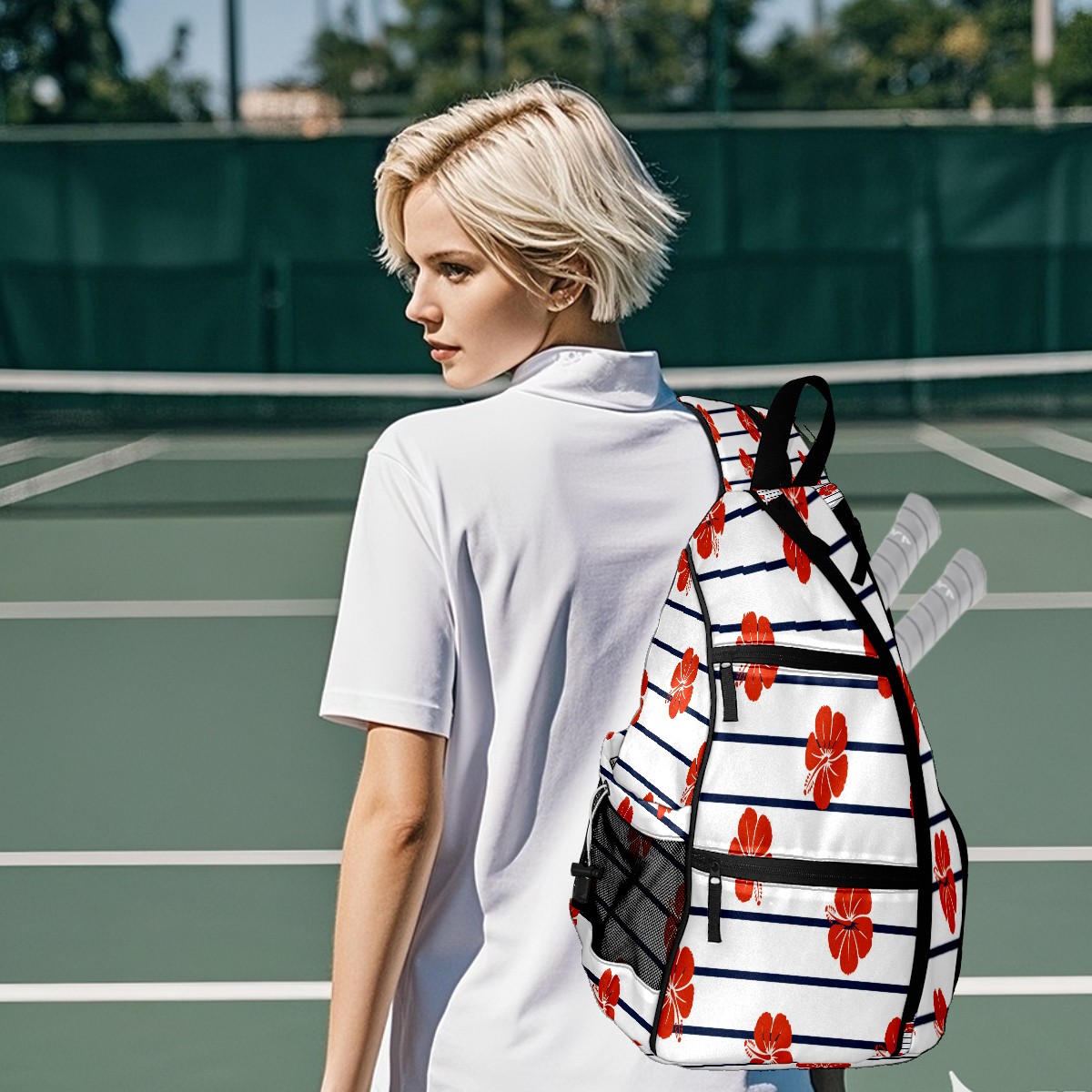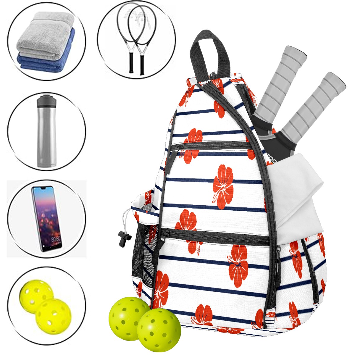 Pickleball Sling Bag for Women and Men - Backpack with Nylon Fabric/Woven Strap/Mesh Pocket/Fence Hook/Large Capacity/Adjustable Sling Bag Red Hibiscus Flower Marine Stripes