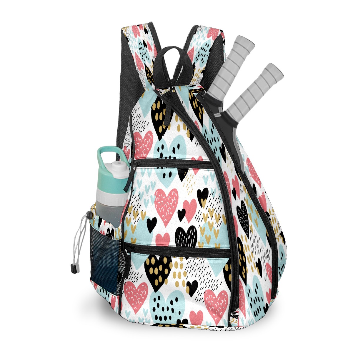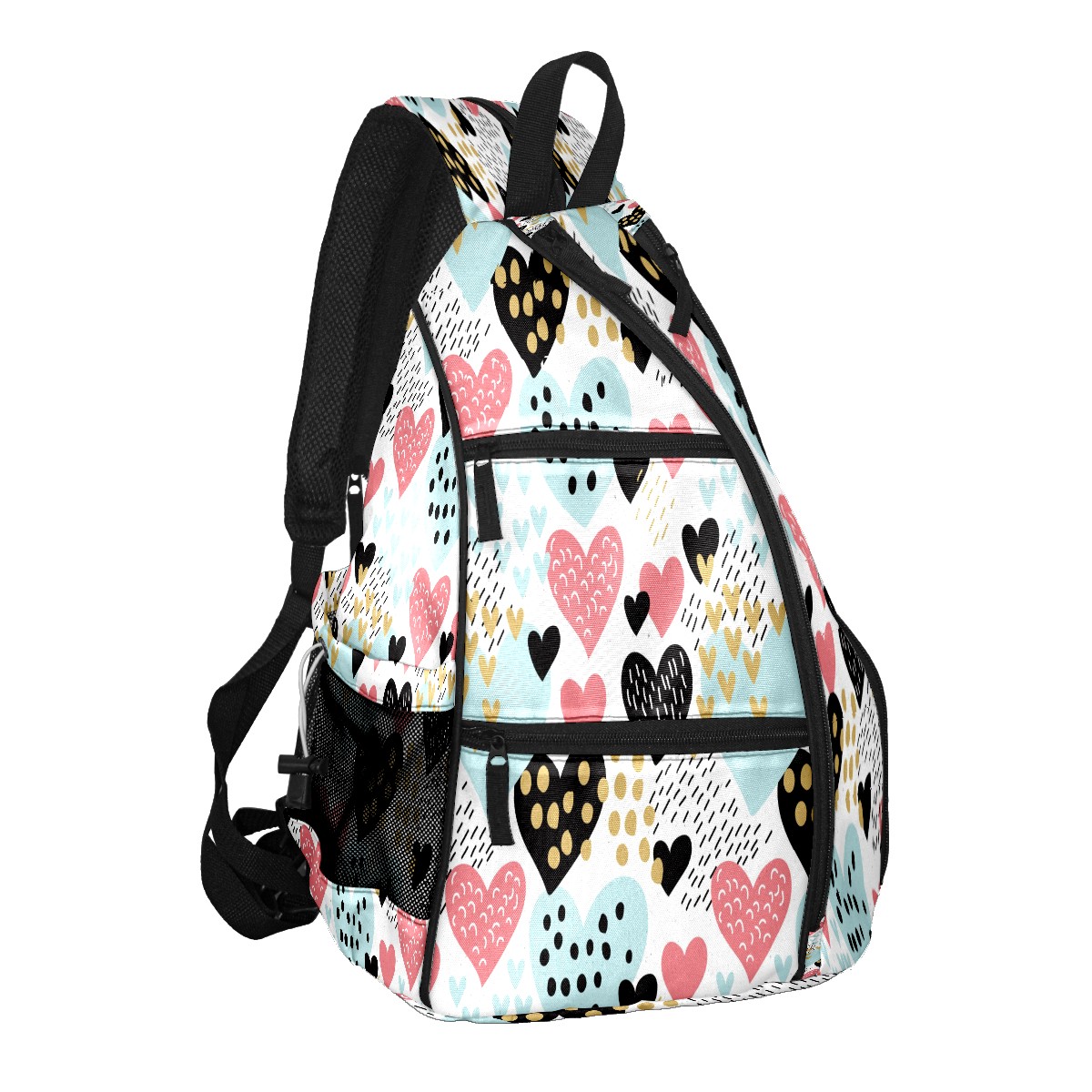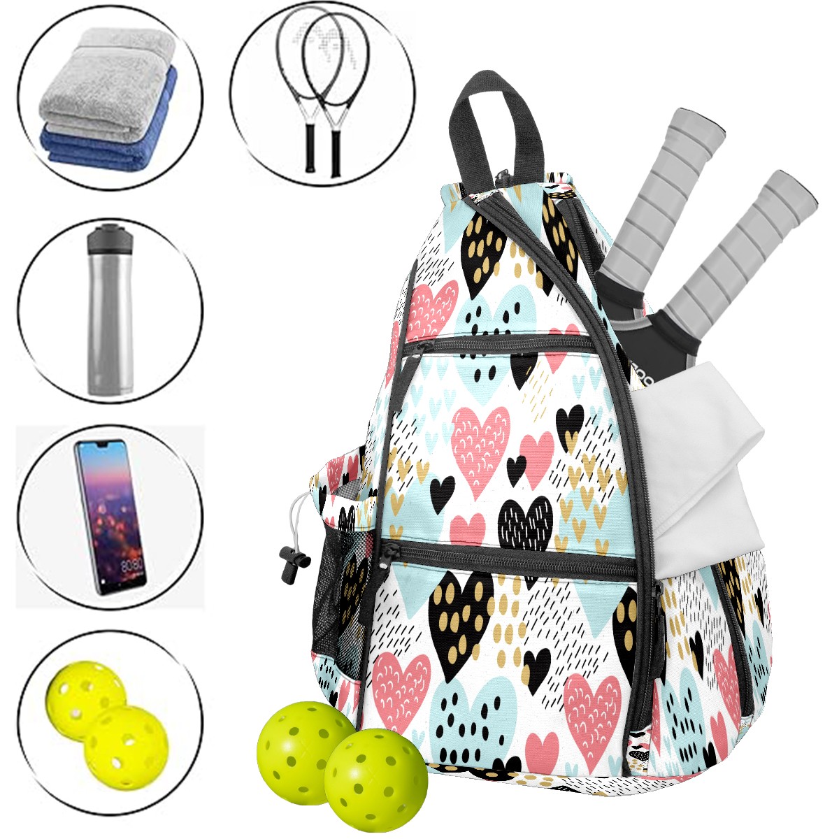 Pickleball Sling Bag for Women and Men - Backpack with Nylon Fabric/Woven Strap/Mesh Pocket/Fence Hook/Large Capacity/Adjustable Sling Bag Colorful Hearts Dots Pink Blue