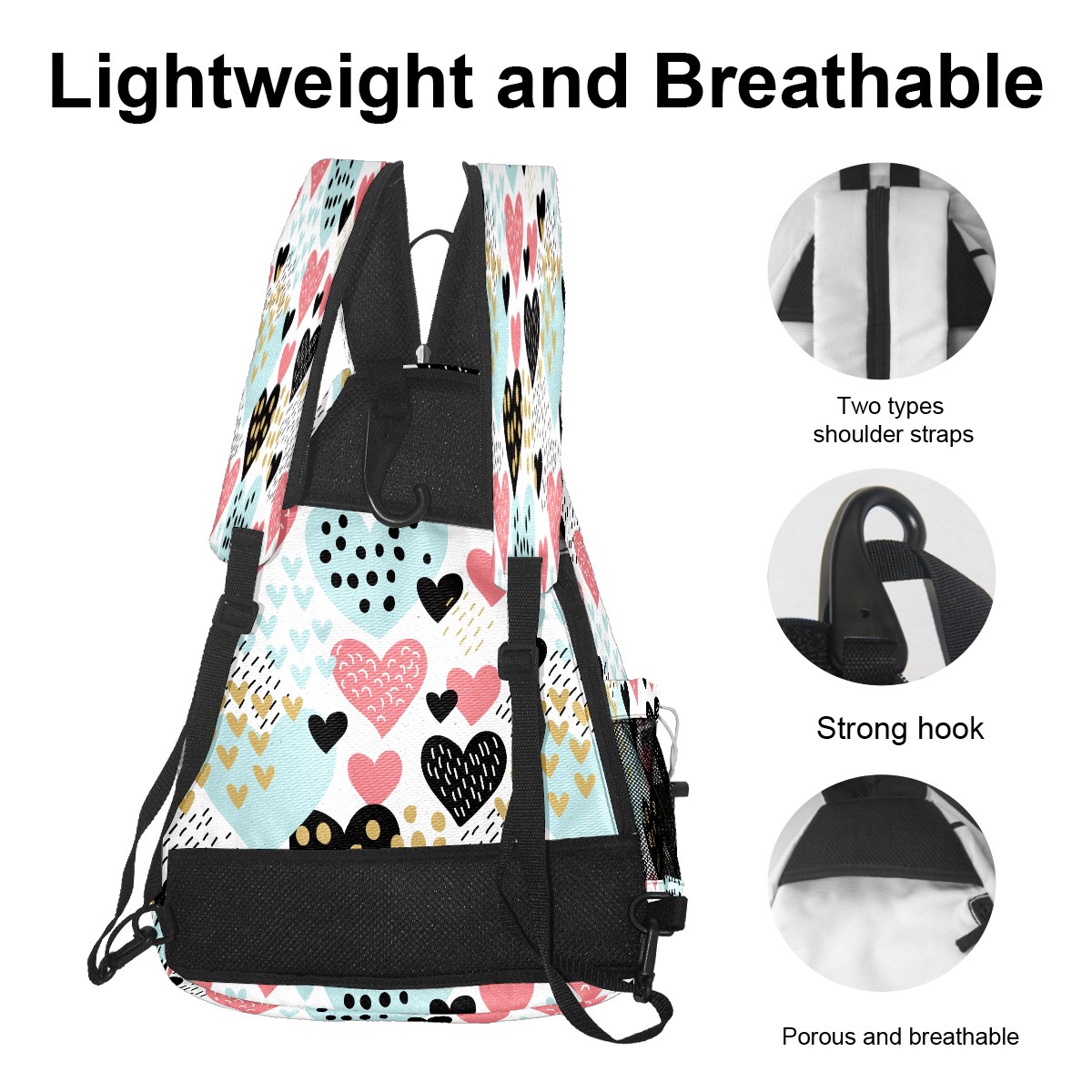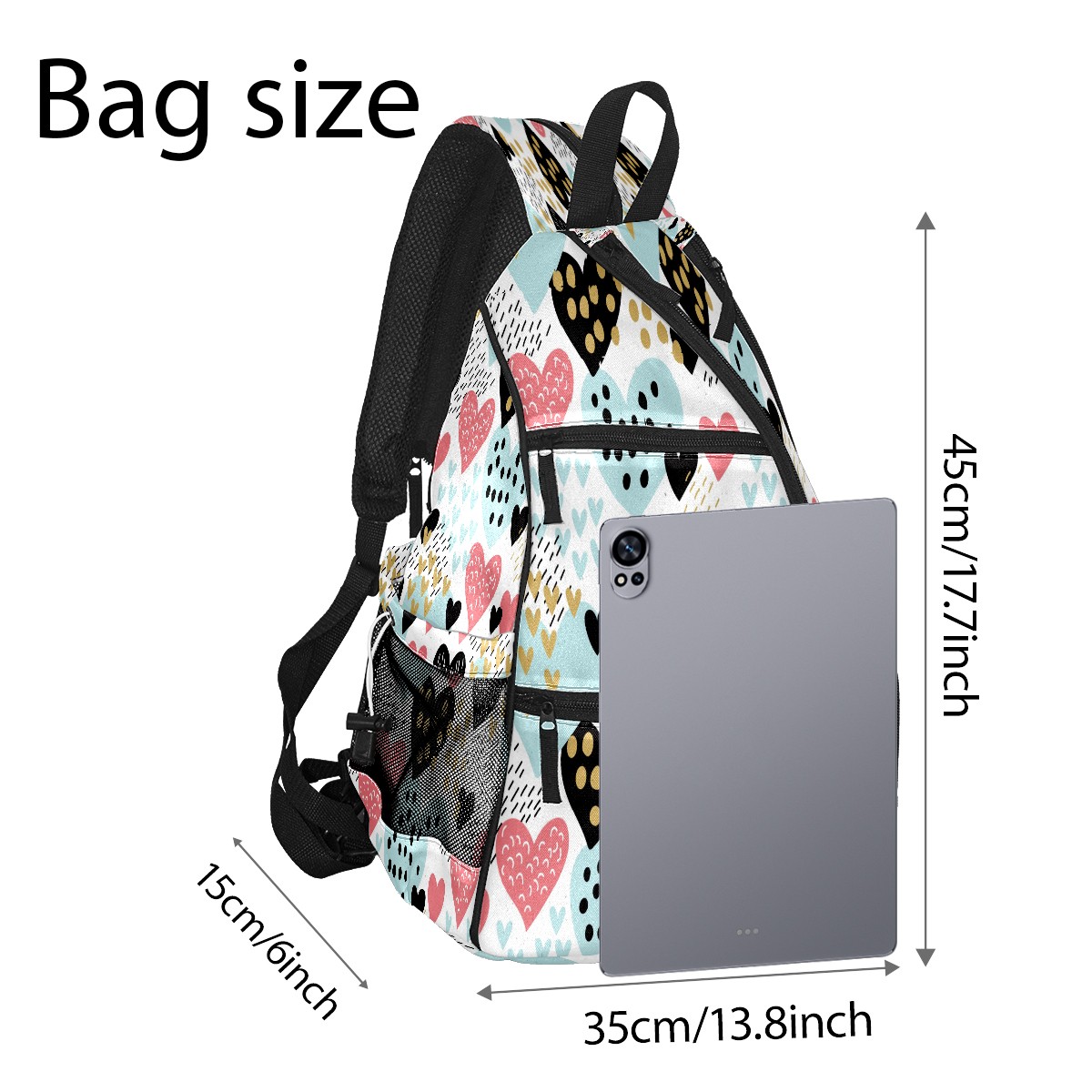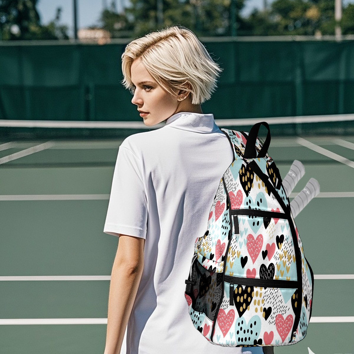Pickleball Sling Bag for Women and Men - Backpack with Nylon Fabric/Woven Strap/Mesh Pocket/Fence Hook/Large Capacity/Adjustable Sling Bag Colorful Hearts Dots Pink Blue