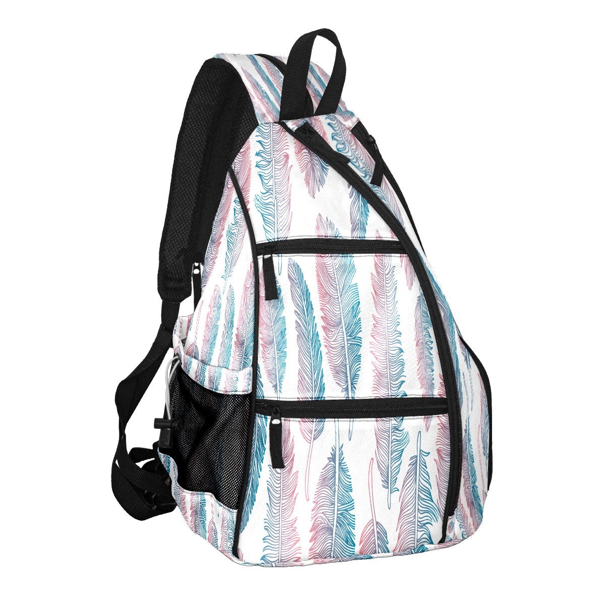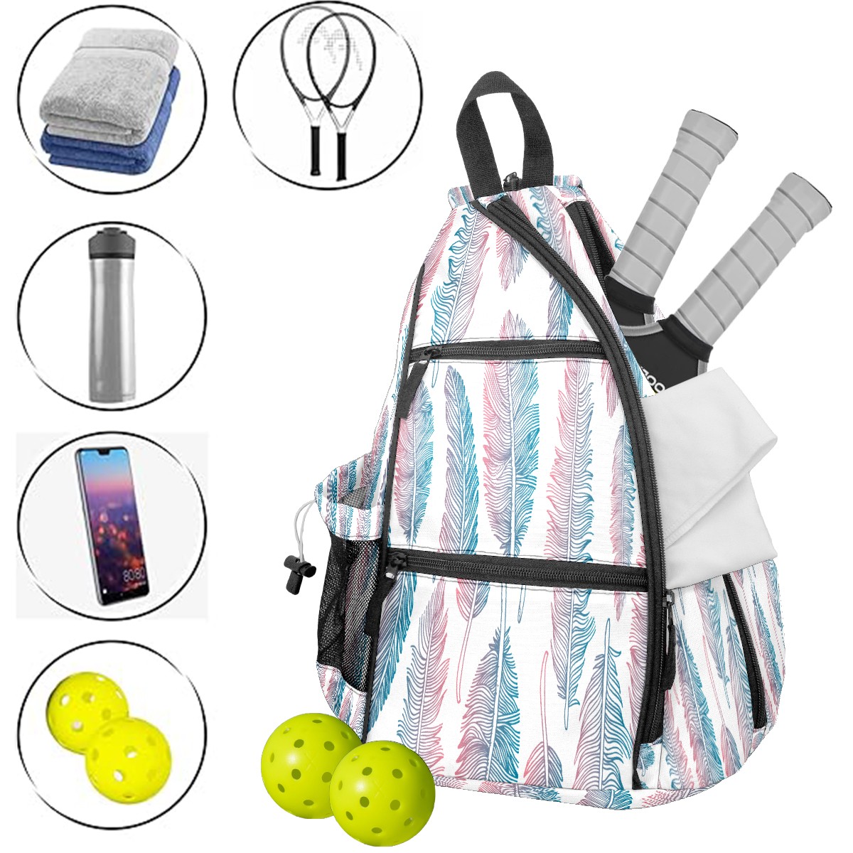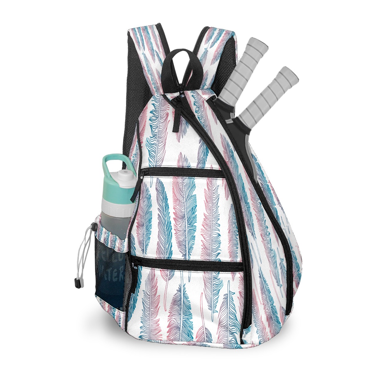 Pickleball Sling Bag for Women and Men - Backpack with Nylon Fabric/Woven Strap/Mesh Pocket/Fence Hook/Large Capacity/Adjustable Sling Bag Colorful Tribal Feather Pattern