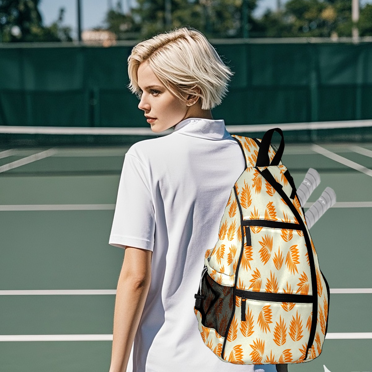 Pickleball Sling Bag for Women and Men - Backpack with Nylon Fabric/Woven Strap/Mesh Pocket/Fence Hook/Large Capacity/Adjustable Sling Bag Orange Surf Leaf
