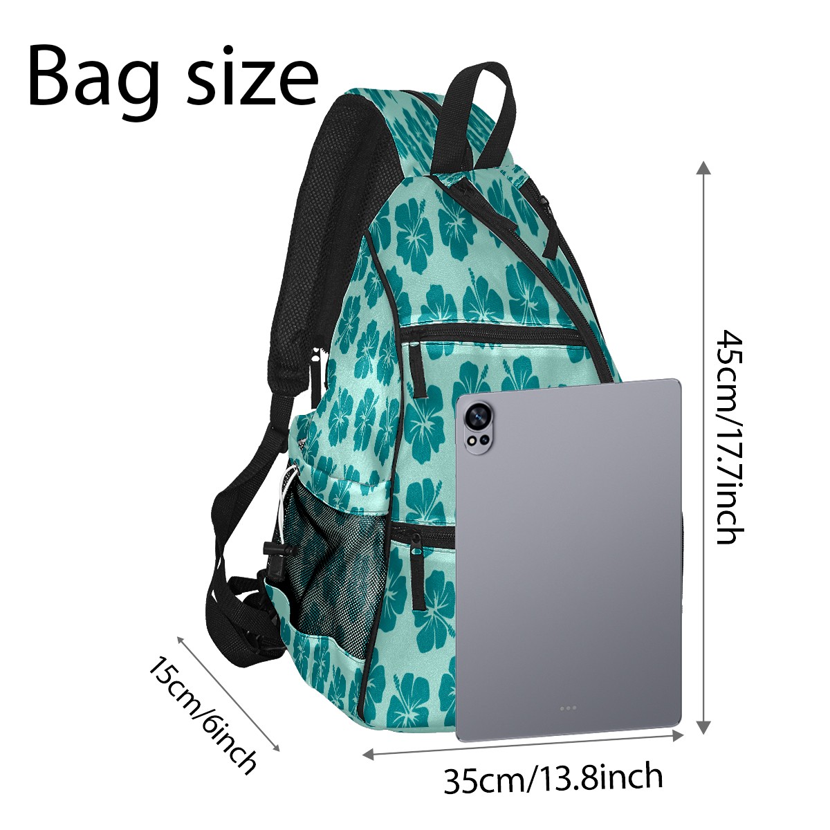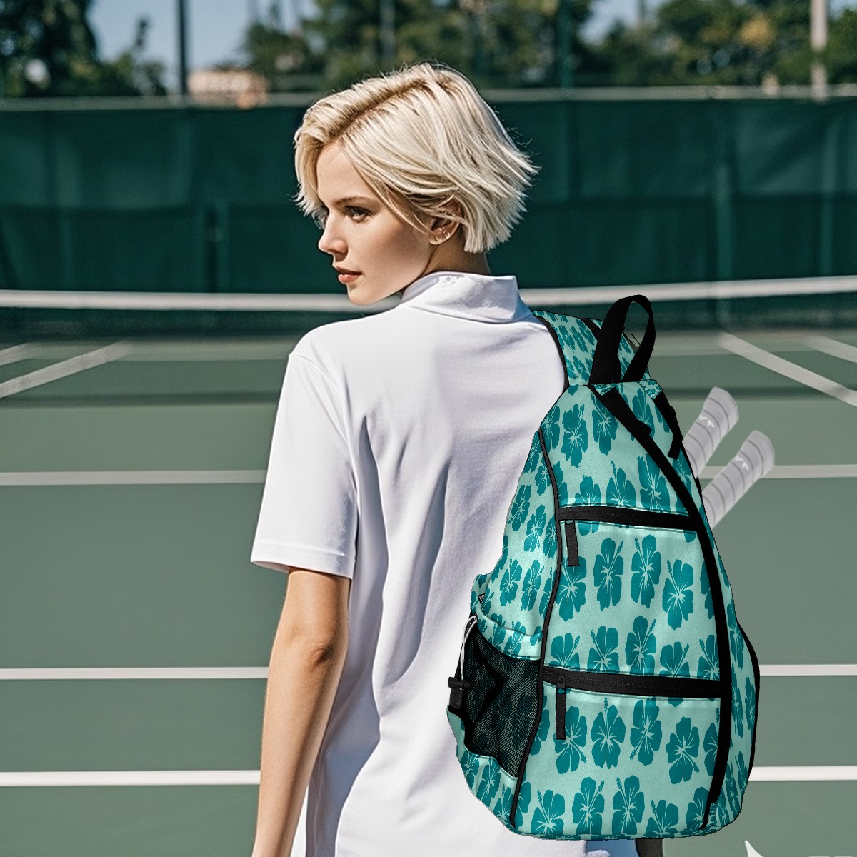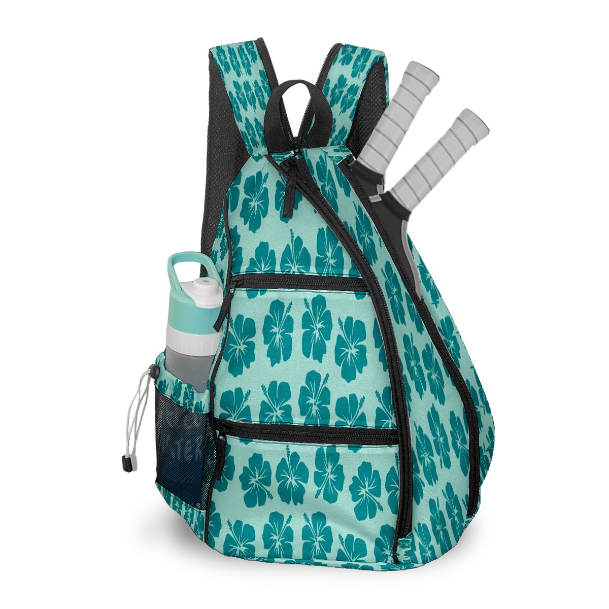 Pickleball Sling Bag for Women and Men - Backpack with Nylon Fabric/Woven Strap/Mesh Pocket/Fence Hook/Large Capacity/Adjustable Sling Bag Light Blue Surf Flowers