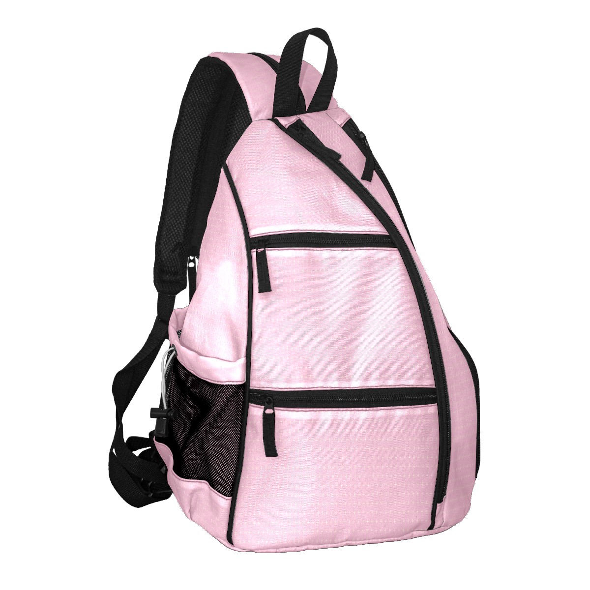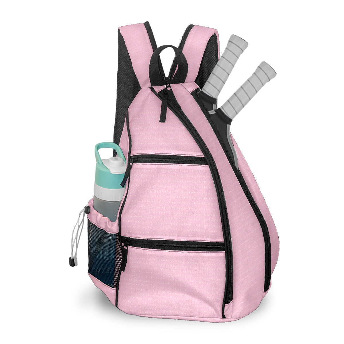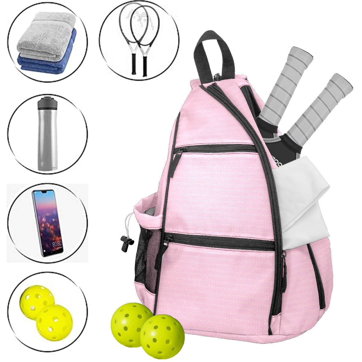 Pickleball Sling Bag for Women and Men - Backpack with Nylon Fabric/Woven Strap/Mesh Pocket/Fence Hook/Large Capacity/Adjustable Sling Bag Pink Plus Pattern