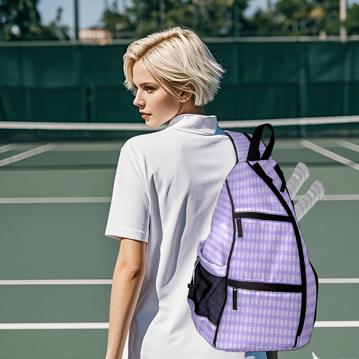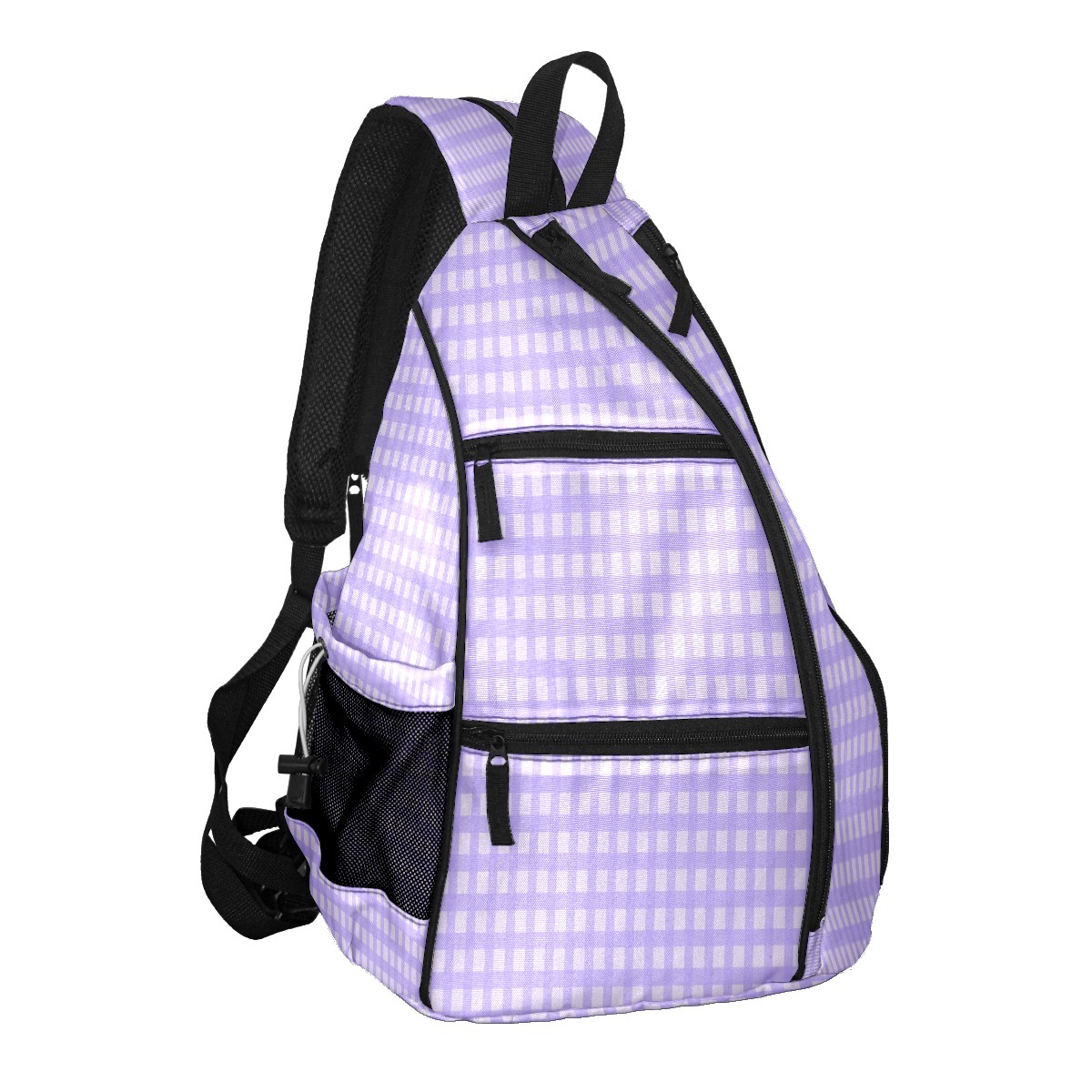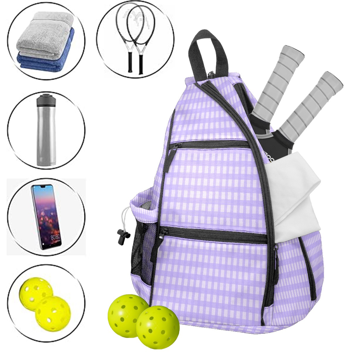 Pickleball Sling Bag for Women and Men - Backpack with Nylon Fabric/Woven Strap/Mesh Pocket/Fence Hook/Large Capacity/Adjustable Sling Bag Lilac Plaid Pattern