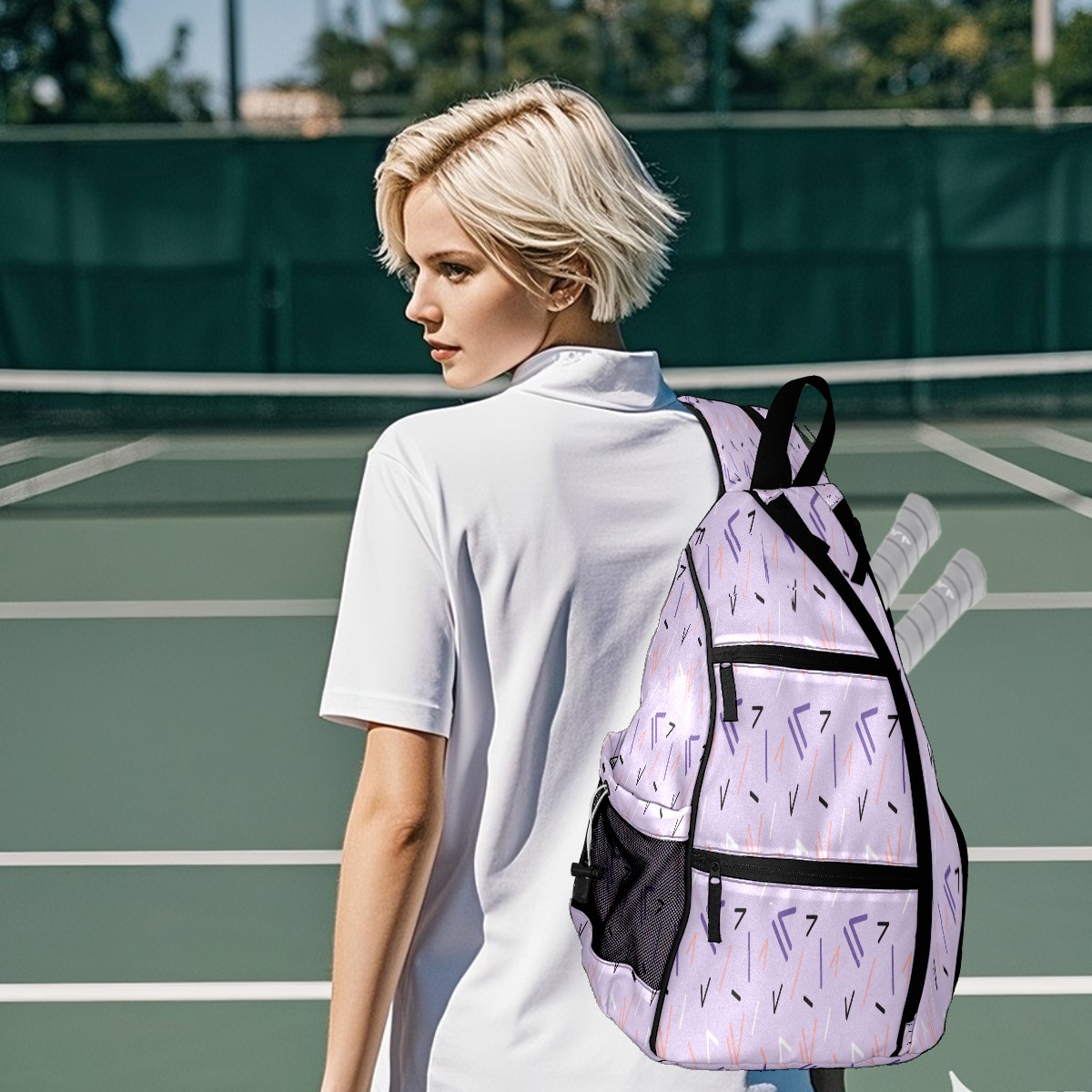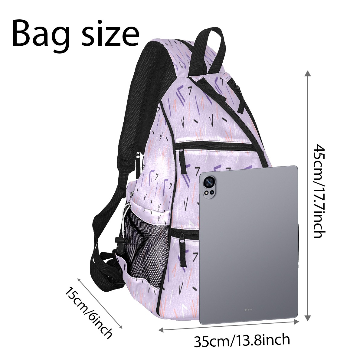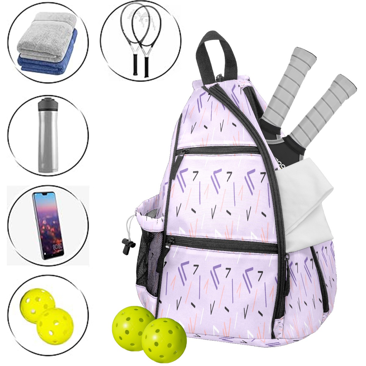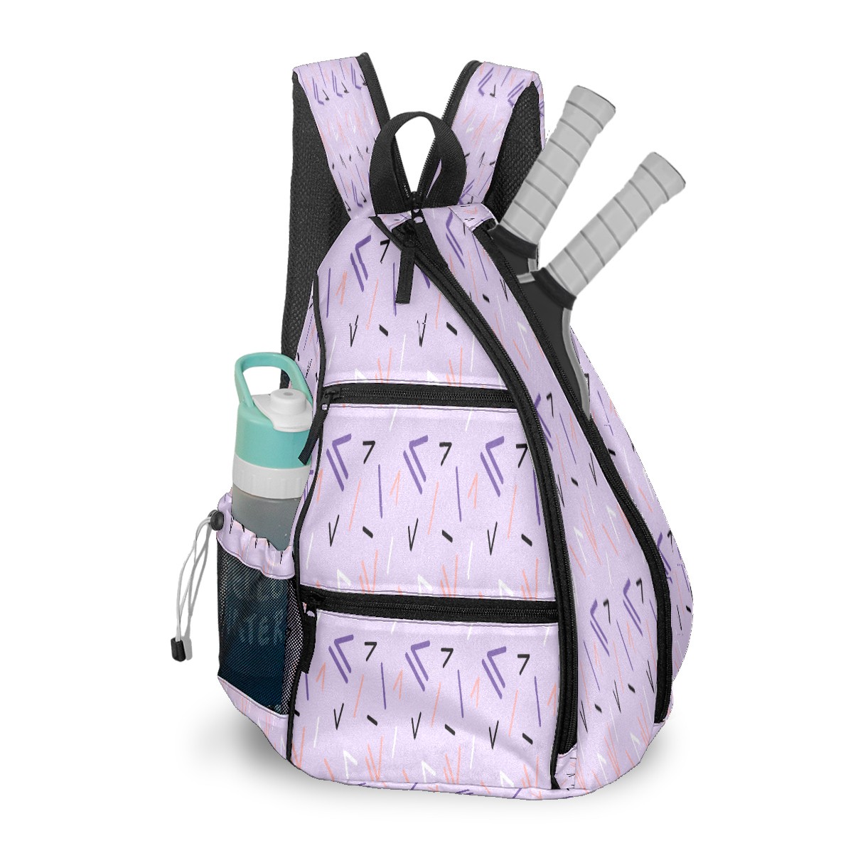 Pickleball Sling Bag for Women and Men - Backpack with Nylon Fabric/Woven Strap/Mesh Pocket/Fence Hook/Large Capacity/Adjustable Sling Bag Lilac Purple Pattern