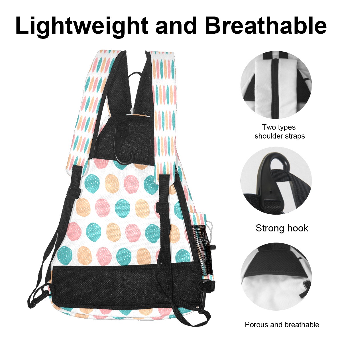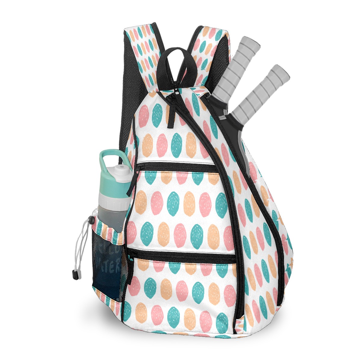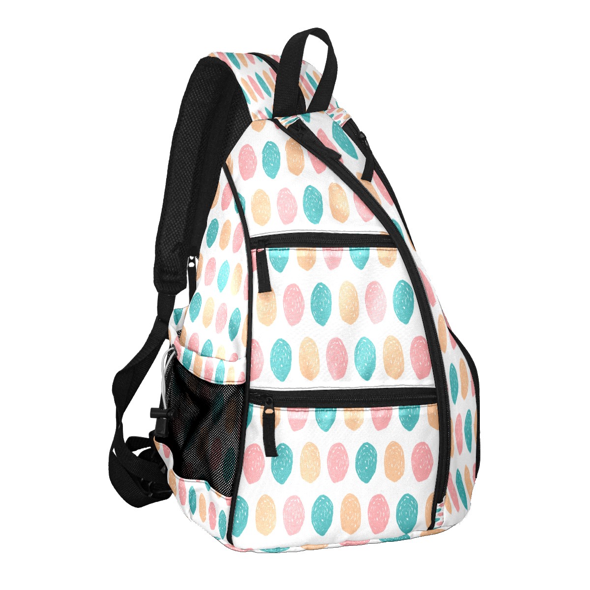 Pickleball Sling Bag for Women and Men - Backpack with Nylon Fabric/Woven Strap/Mesh Pocket/Fence Hook/Large Capacity/Adjustable Sling Bag Colorful Doodle Dots Pattern