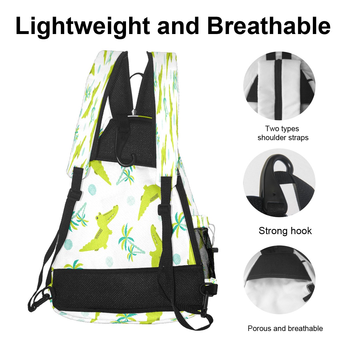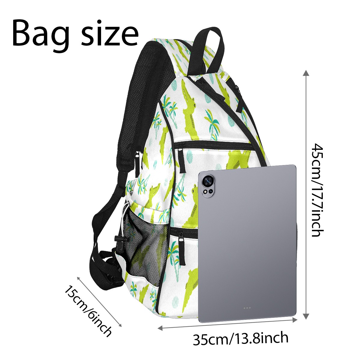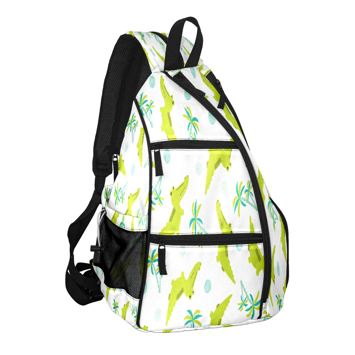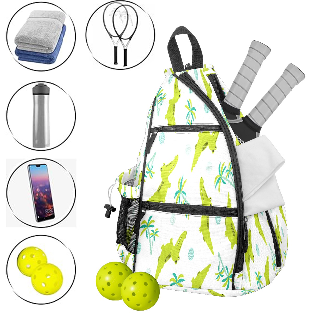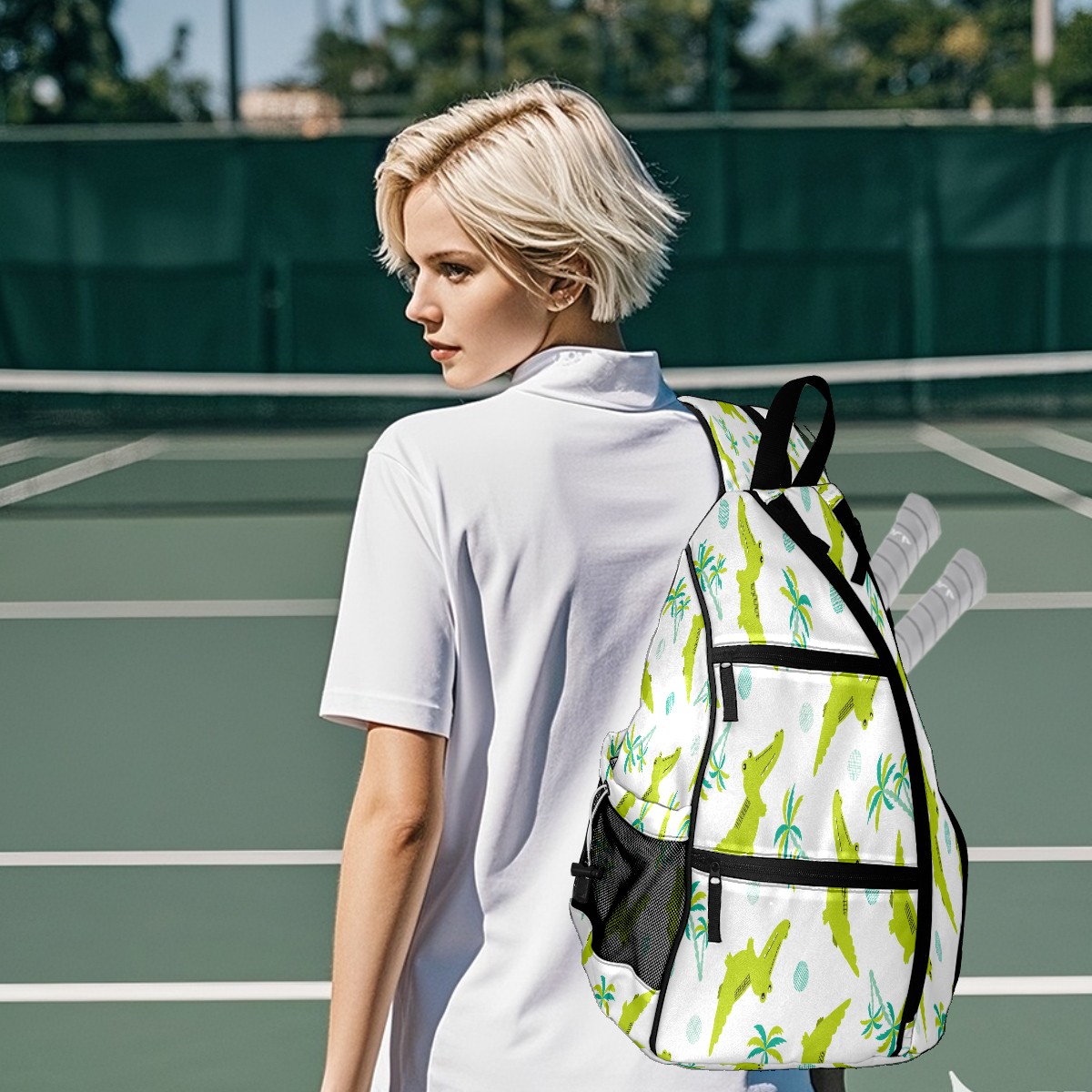 Pickleball Sling Bag for Women and Men - Backpack with Nylon Fabric/Woven Strap/Mesh Pocket/Fence Hook/Large Capacity/Adjustable Sling Bag Green Crocodiles