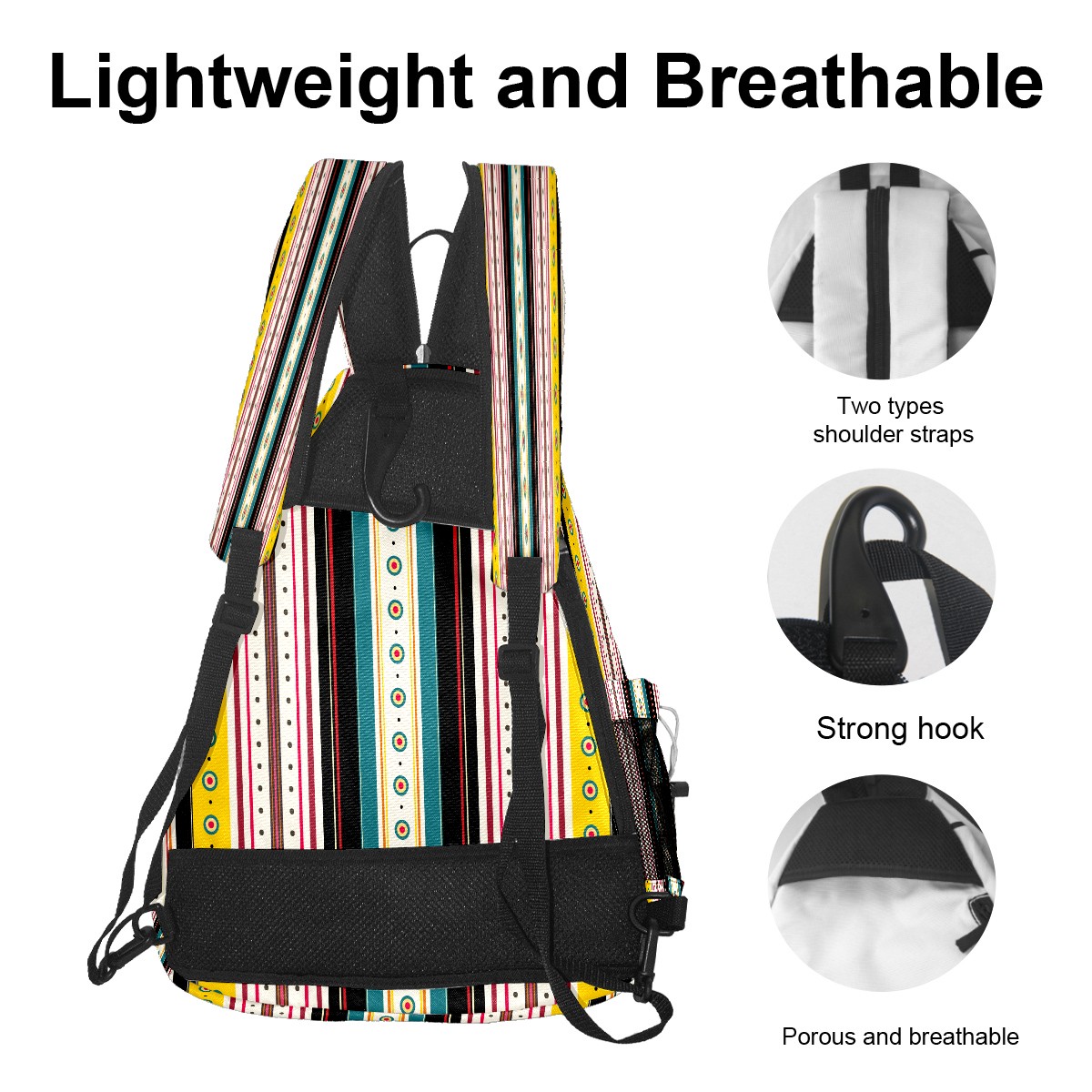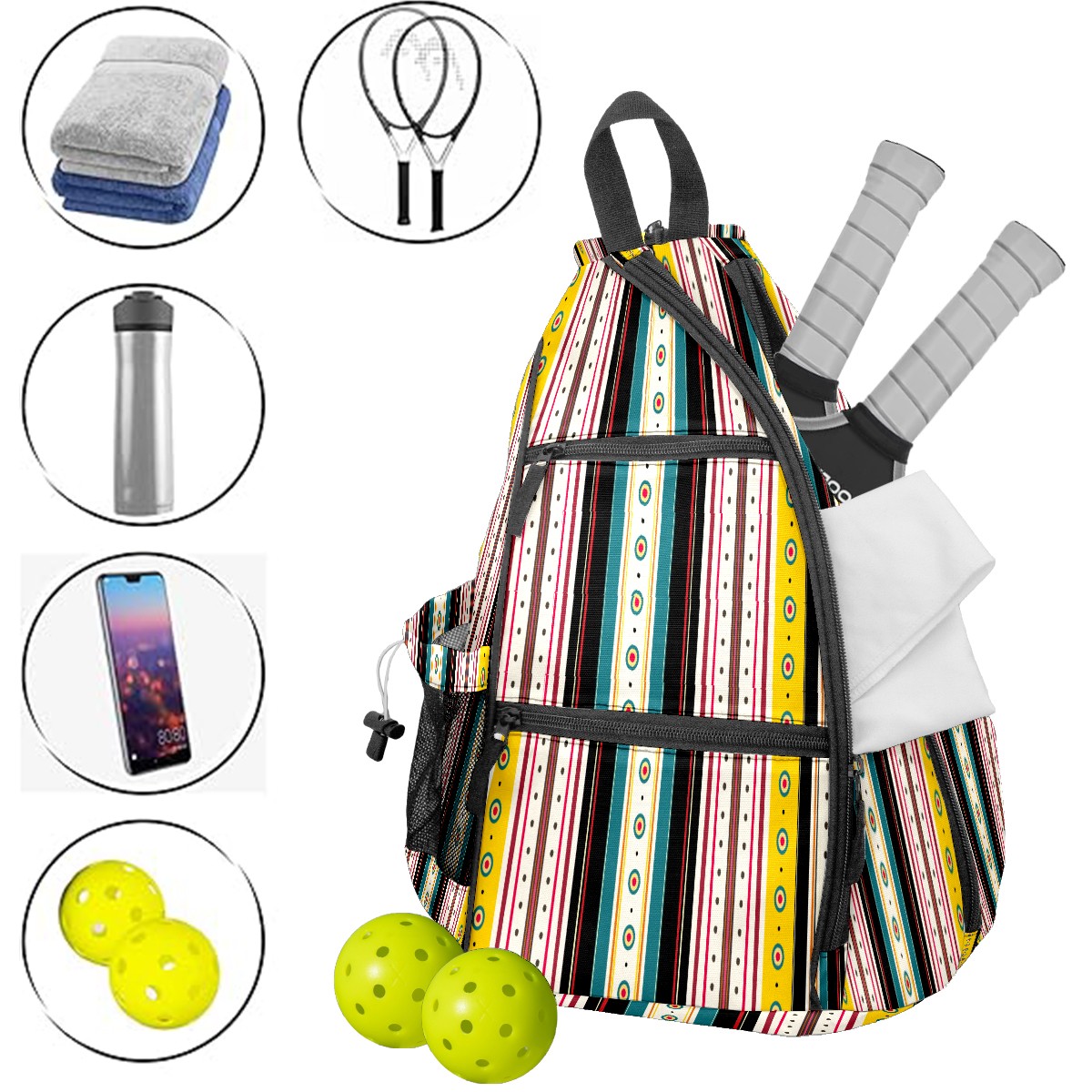 Pickleball Sling Bag for Women and Men - Backpack with Nylon Fabric/Woven Strap/Mesh Pocket/Fence Hook/Large Capacity/Adjustable Sling Bag Little Circles Yellow