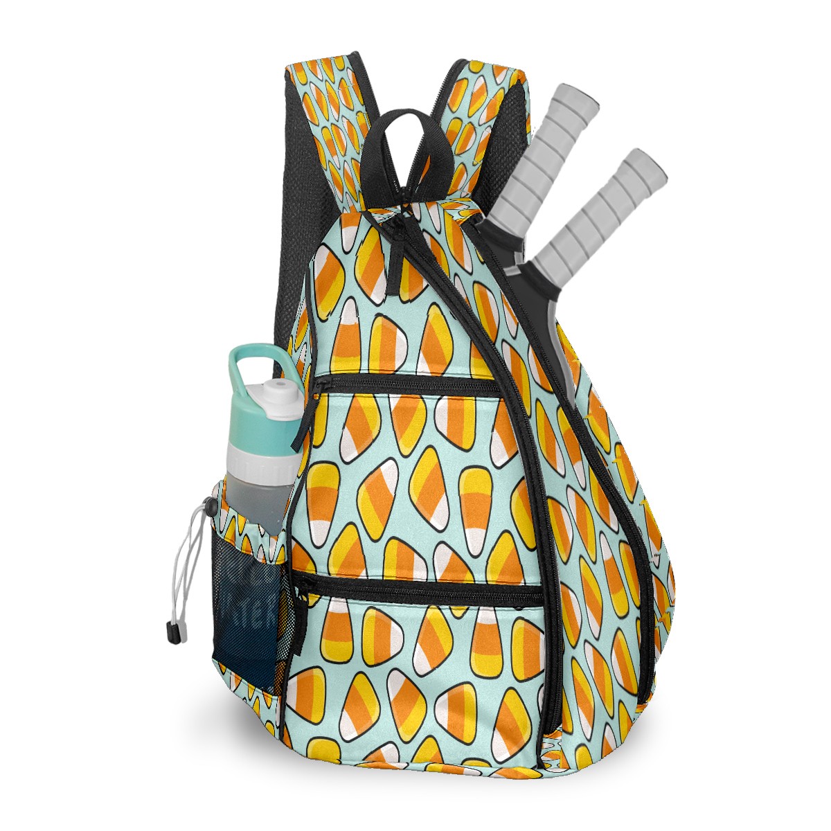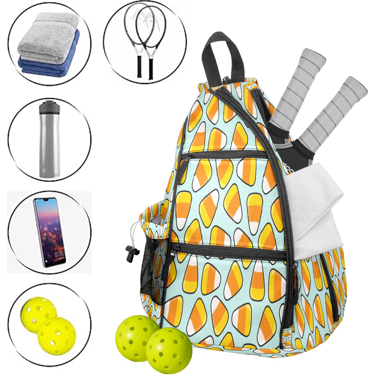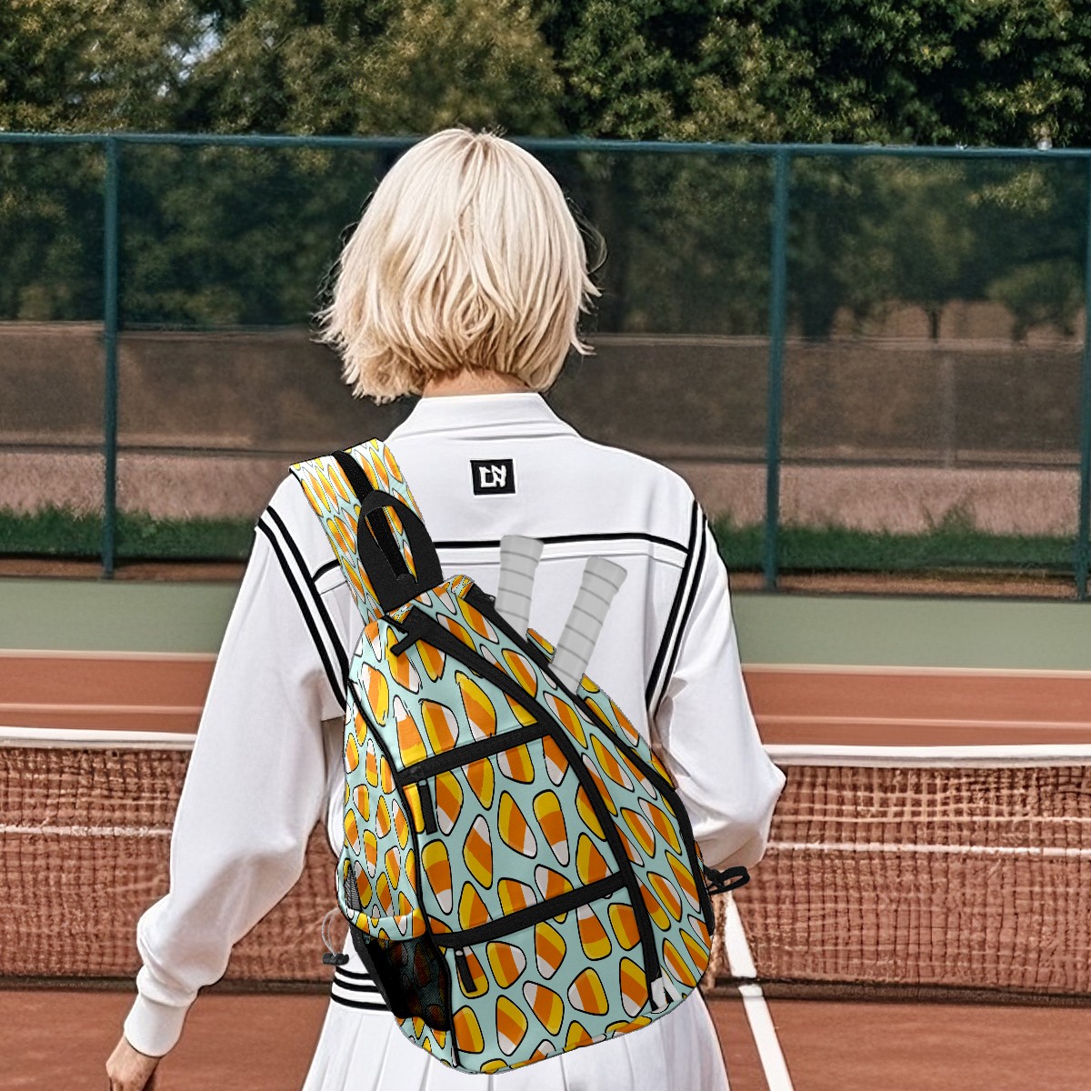 Pickleball Sling Bag for Women and Men - Backpack with Nylon Fabric/Woven Strap/Mesh Pocket/Fence Hook/Large Capacity/Adjustable Sling Bag Candy Corn Orange Pattern
