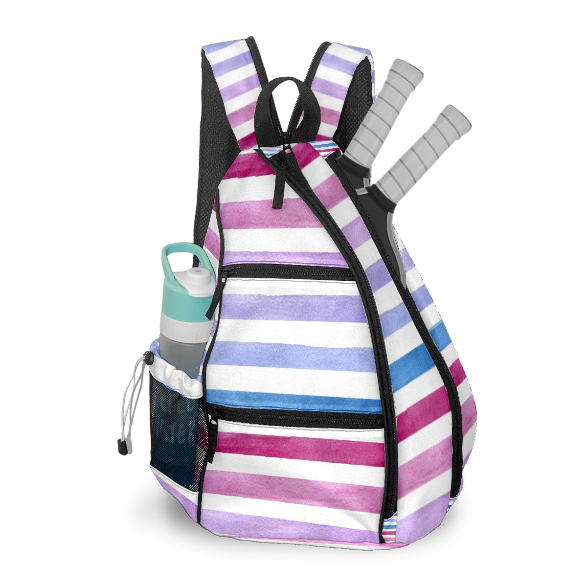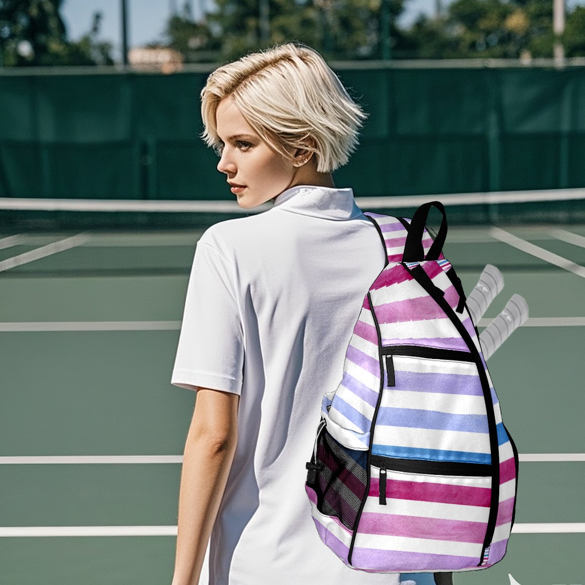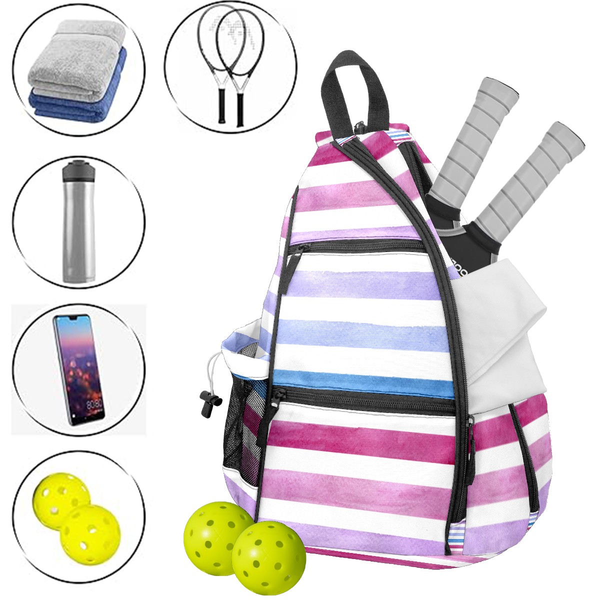 Pickleball Sling Bag for Women and Men - Backpack with Nylon Fabric/Woven Strap/Mesh Pocket/Fence Hook/Large Capacity/Adjustable Sling Bag Blue Pink Purple Stripe