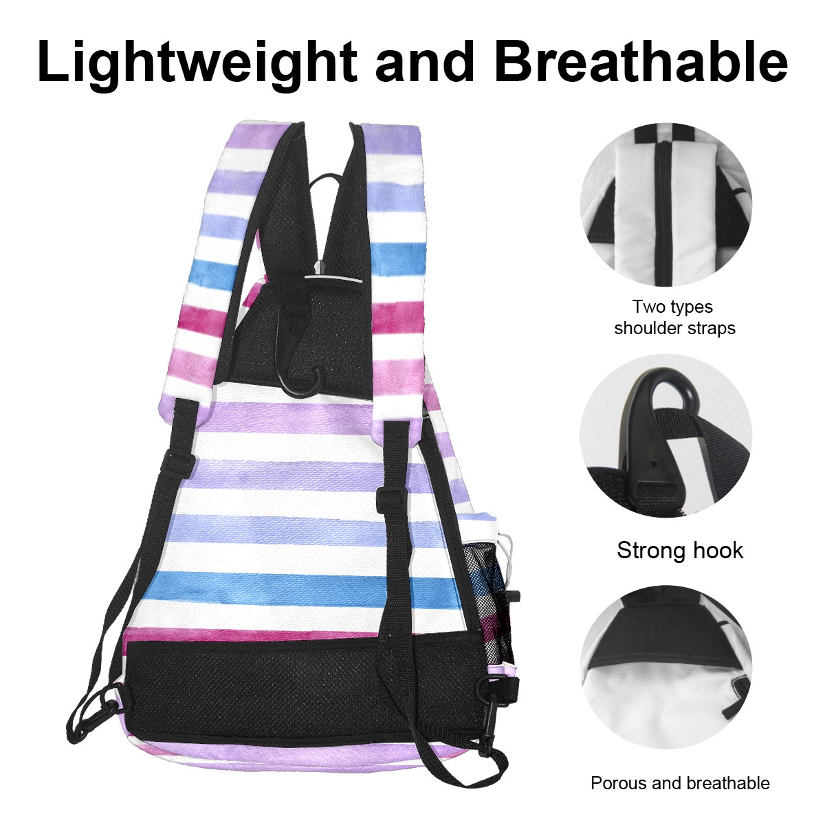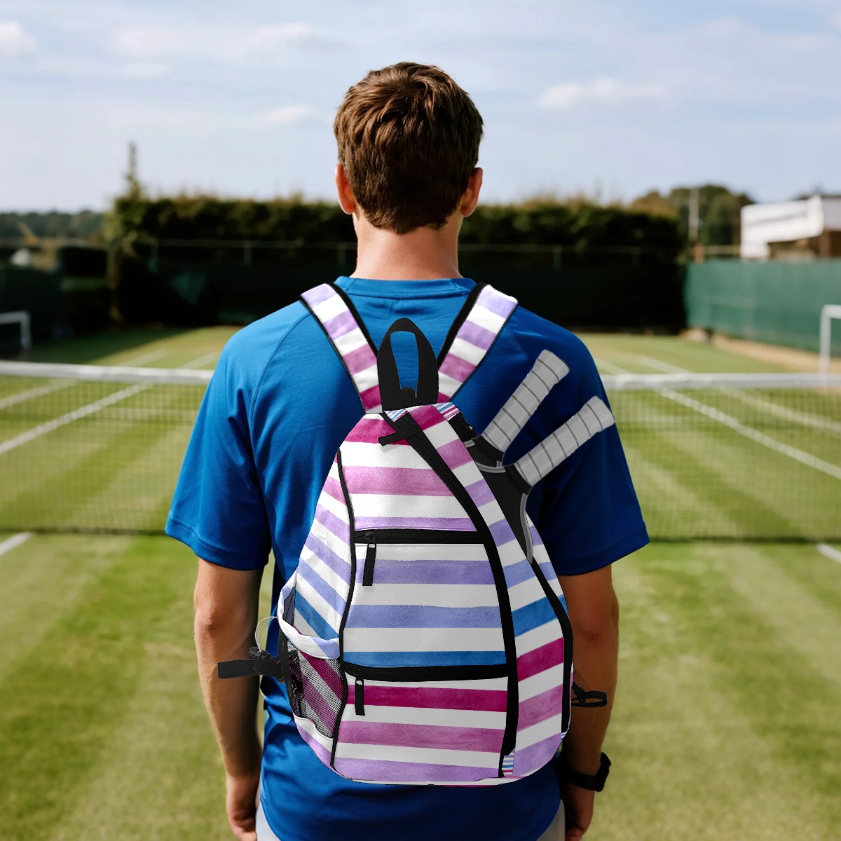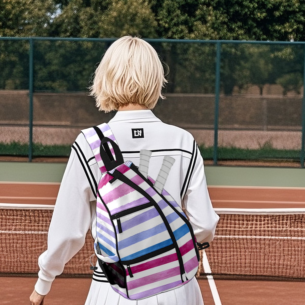 Pickleball Sling Bag for Women and Men - Backpack with Nylon Fabric/Woven Strap/Mesh Pocket/Fence Hook/Large Capacity/Adjustable Sling Bag Blue Pink Purple Stripe