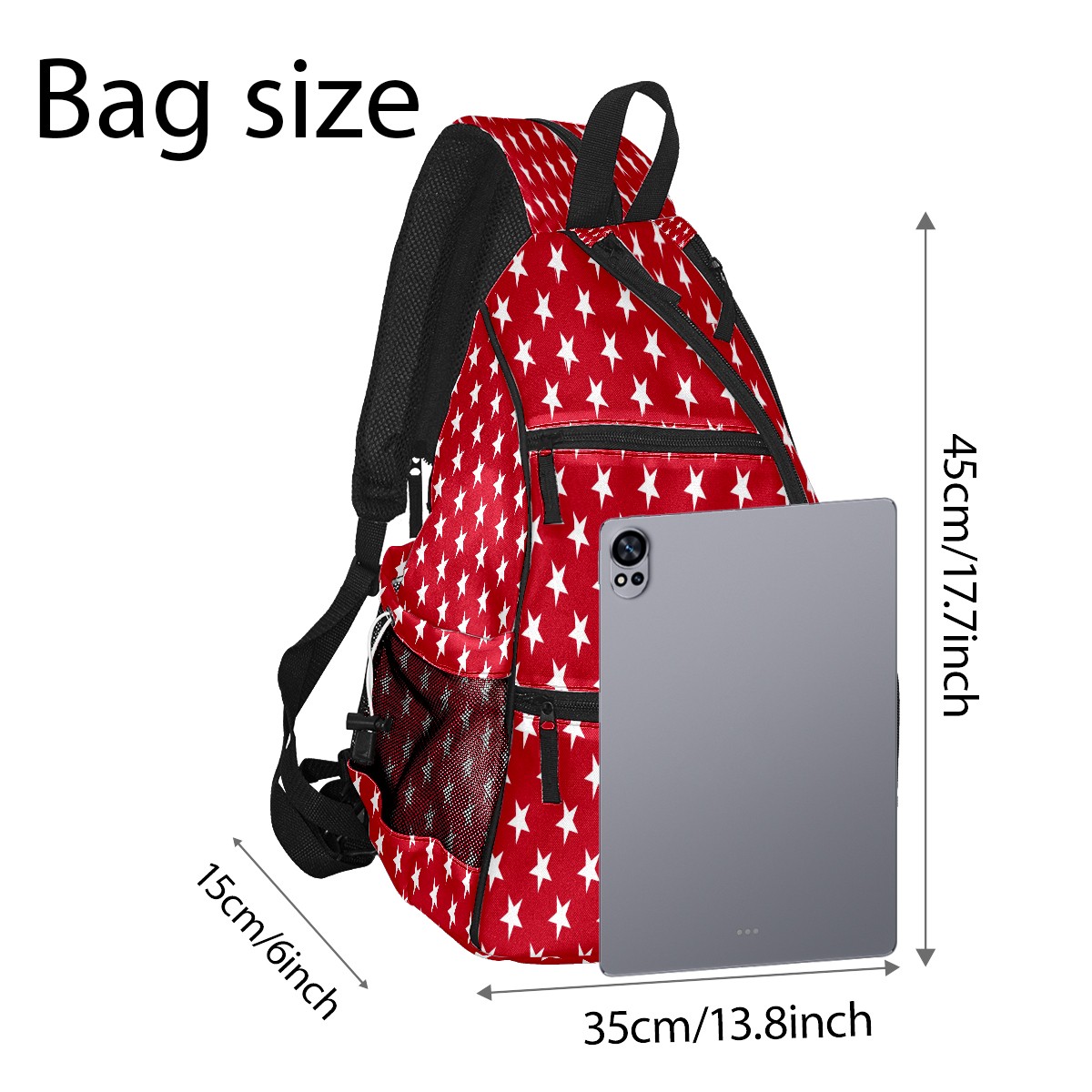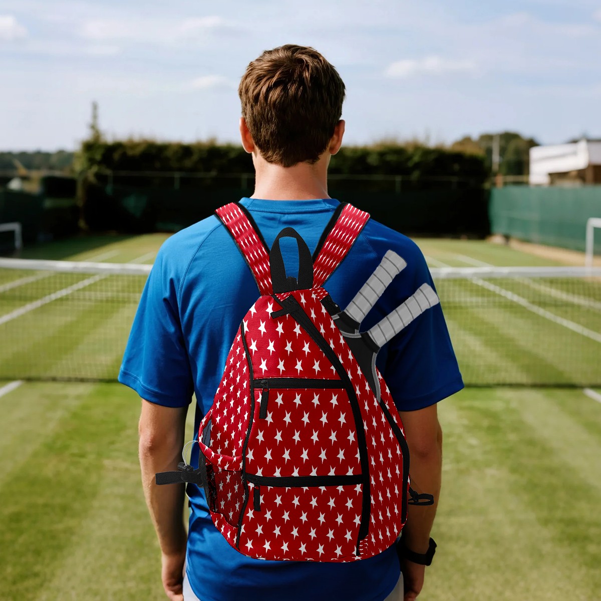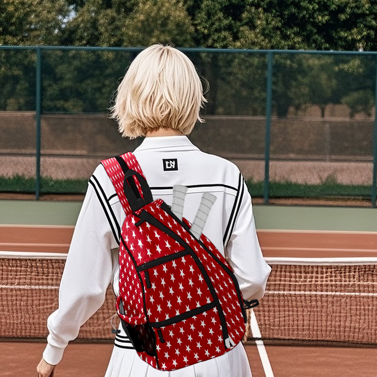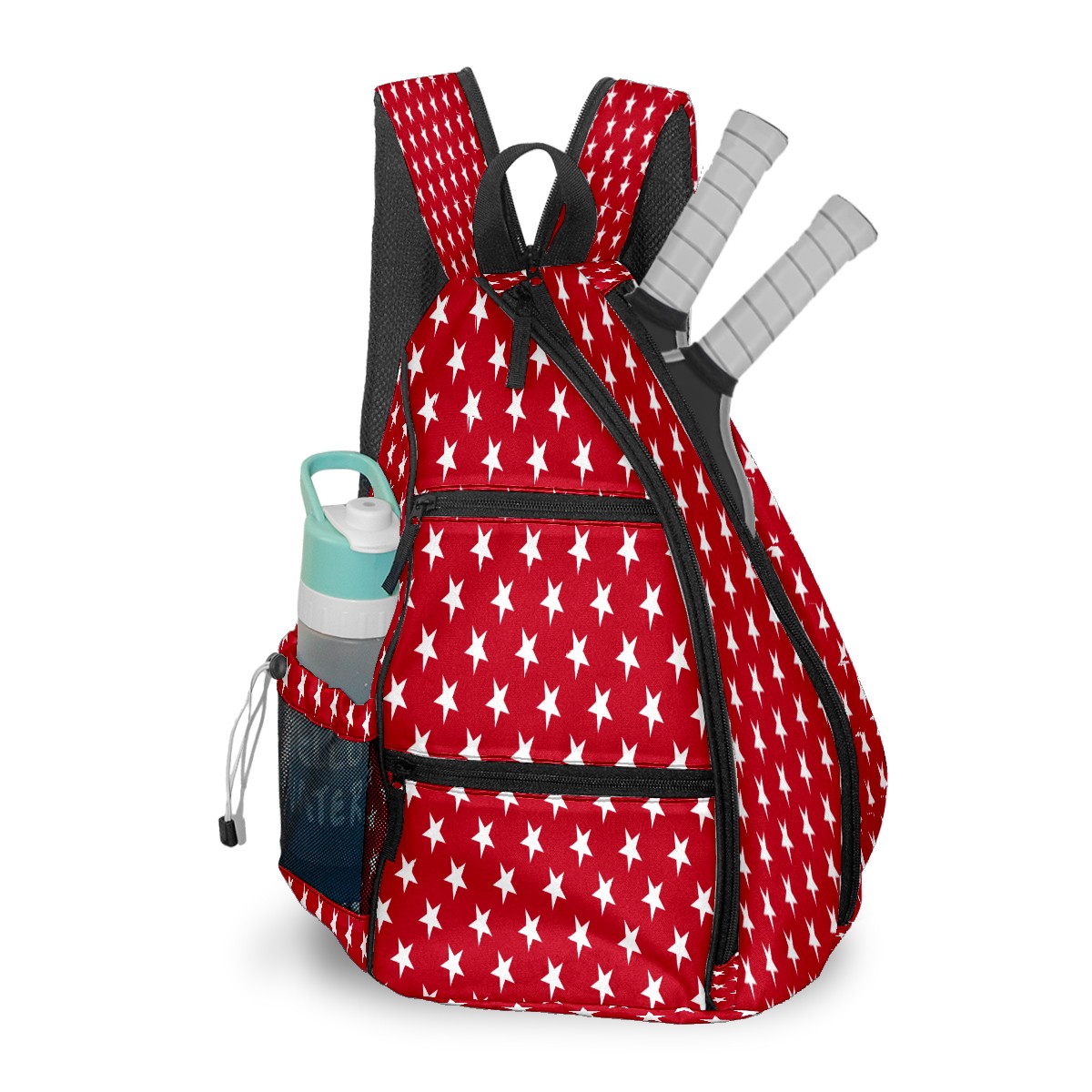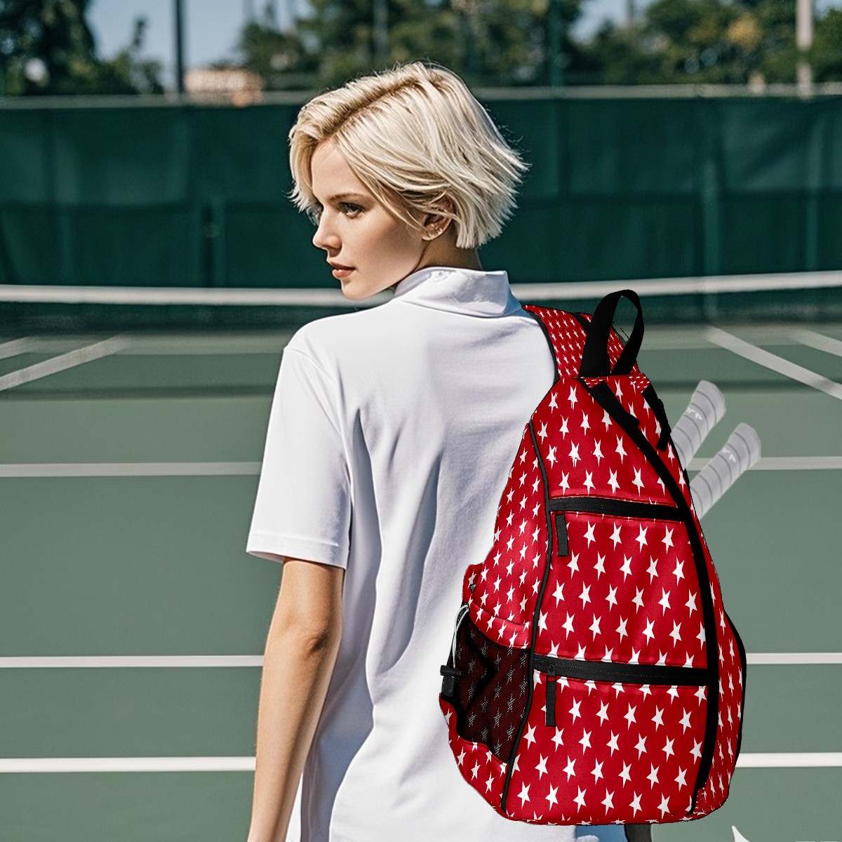 Pickleball Sling Bag for Women and Men - Backpack with Nylon Fabric/Woven Strap/Mesh Pocket/Fence Hook/Large Capacity/Adjustable Sling Bag Geometric Red Stars Pattern