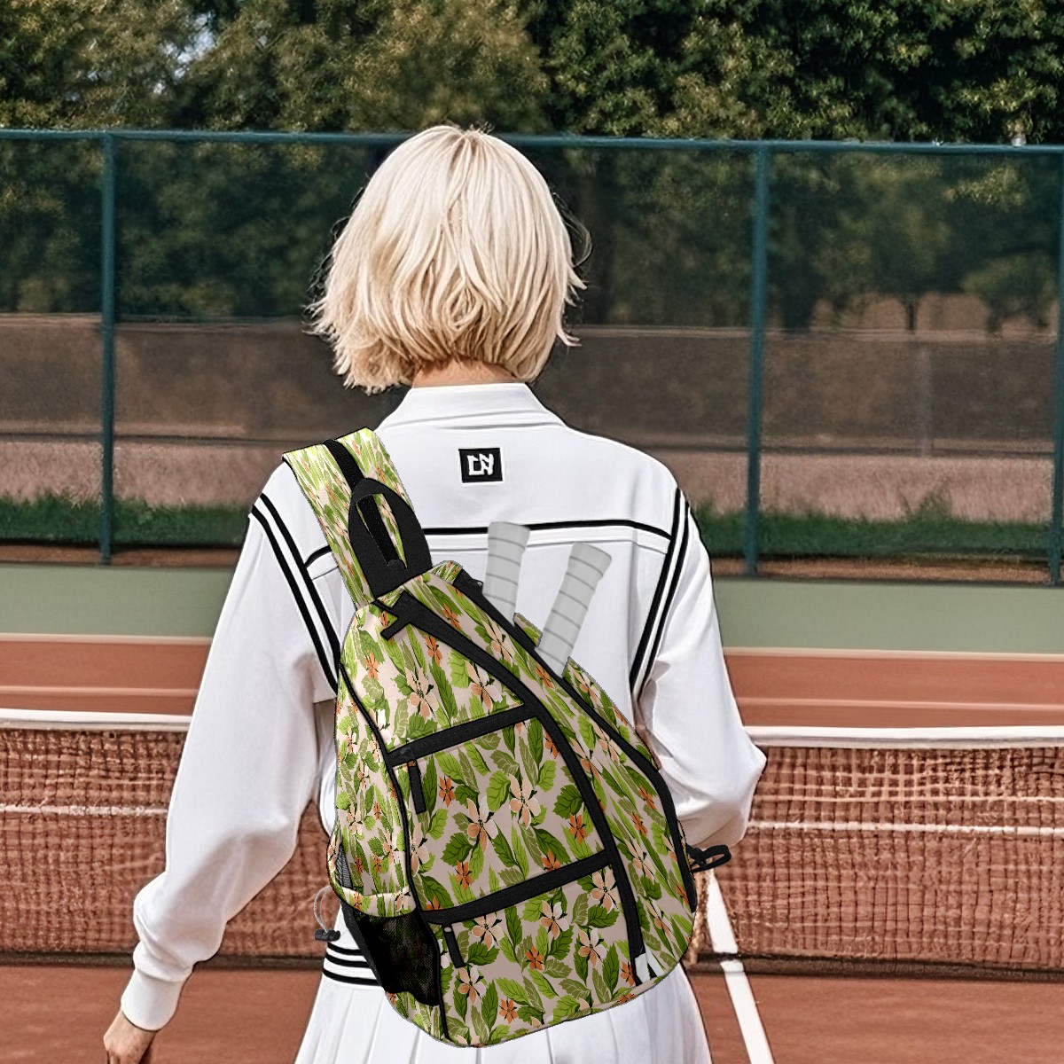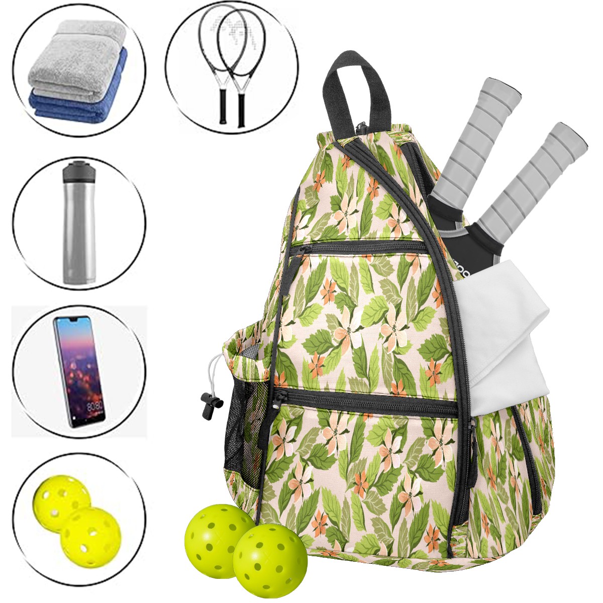 Pickleball Sling Bag for Women and Men - Backpack with Nylon Fabric/Woven Strap/Mesh Pocket/Fence Hook/Large Capacity/Adjustable Sling Bag Green Leaves Floral Pattern
