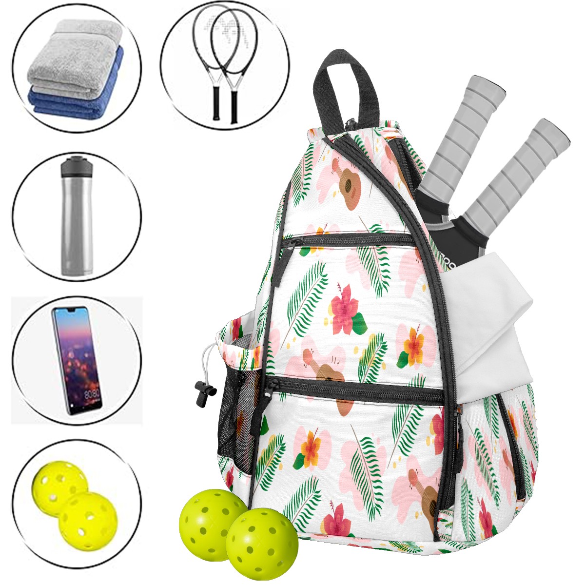 Pickleball Sling Bag for Women and Men - Backpack with Nylon Fabric/Woven Strap/Mesh Pocket/Fence Hook/Large Capacity/Adjustable Sling Bag Tropical Floral Exotic