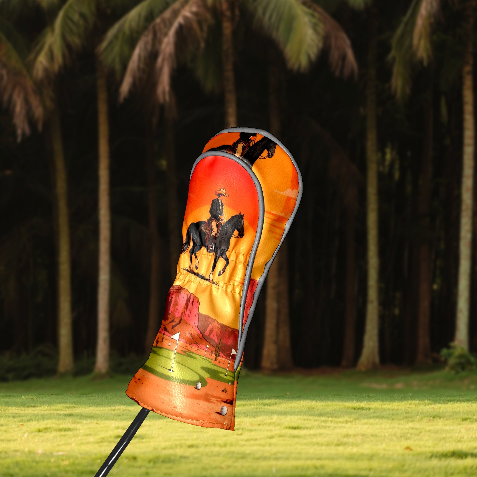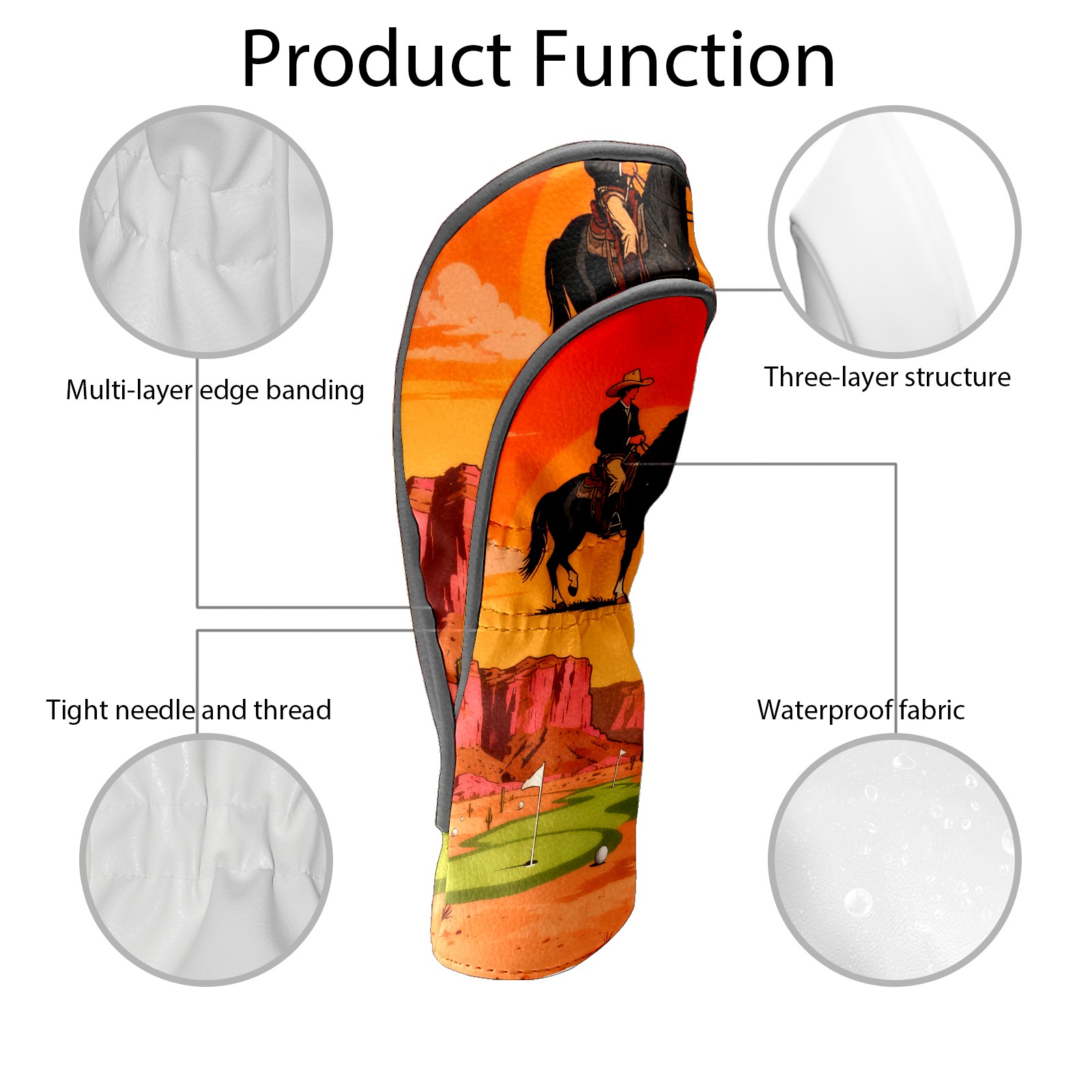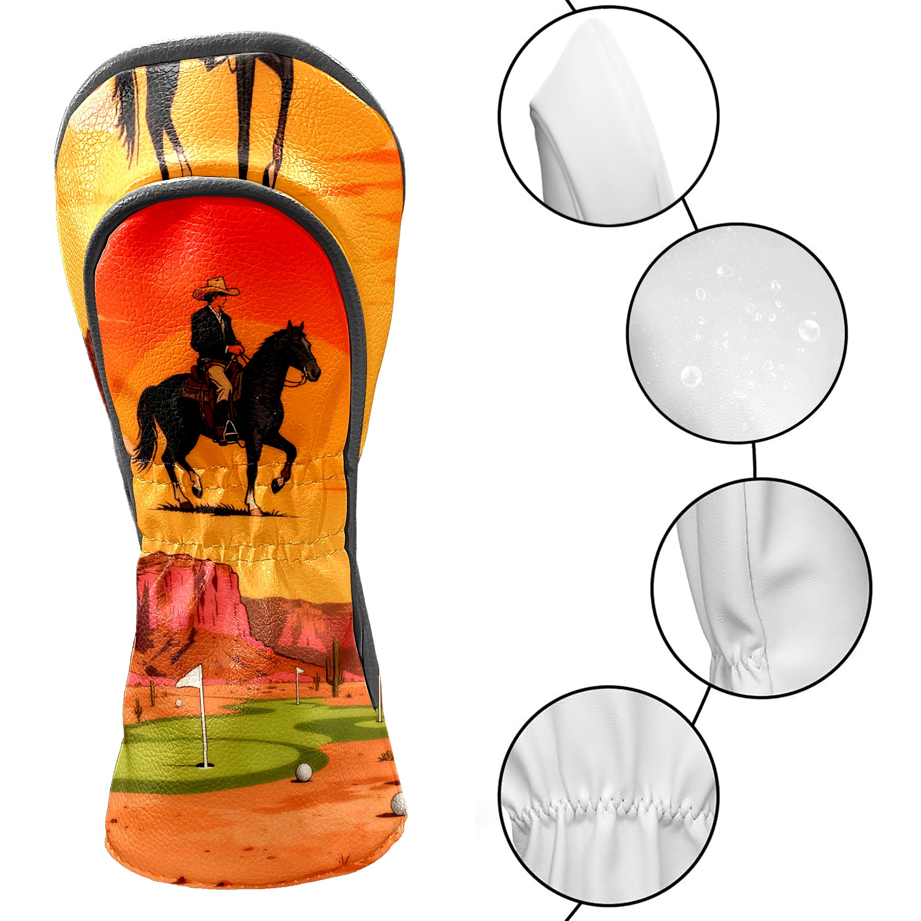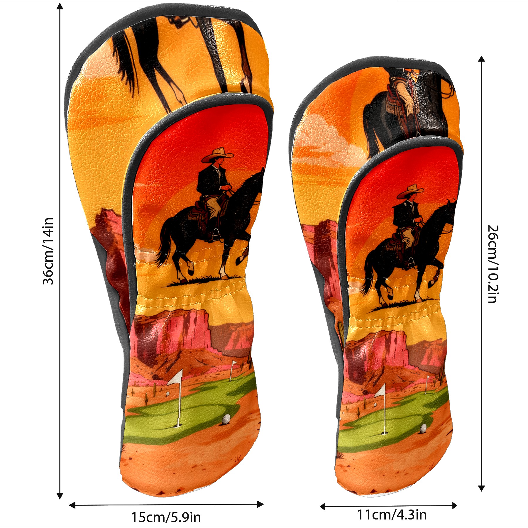 Golf Driver Head Covers Fairway Wood Headcovers, Premium Leather Golf Club Covers with Anti-Scratch Lining 1/3/5 Wood Cover for golf clubs for Women Men (Jimeng-2025-10-20-4492-参考图1的复古插画风格和构图,牛仔骑手戴着宽边帽,骑在黑色马匹上,背景天空改为橙...)