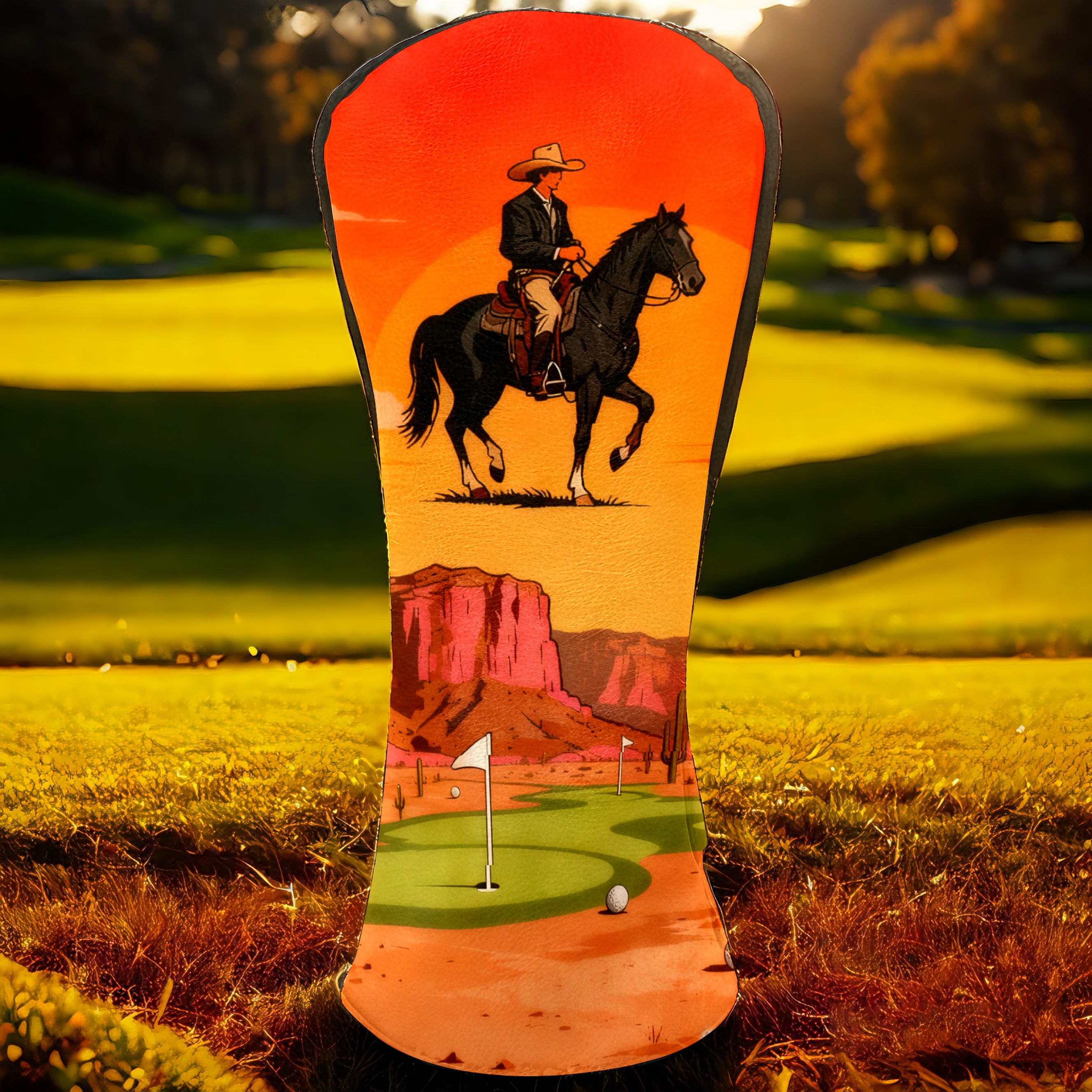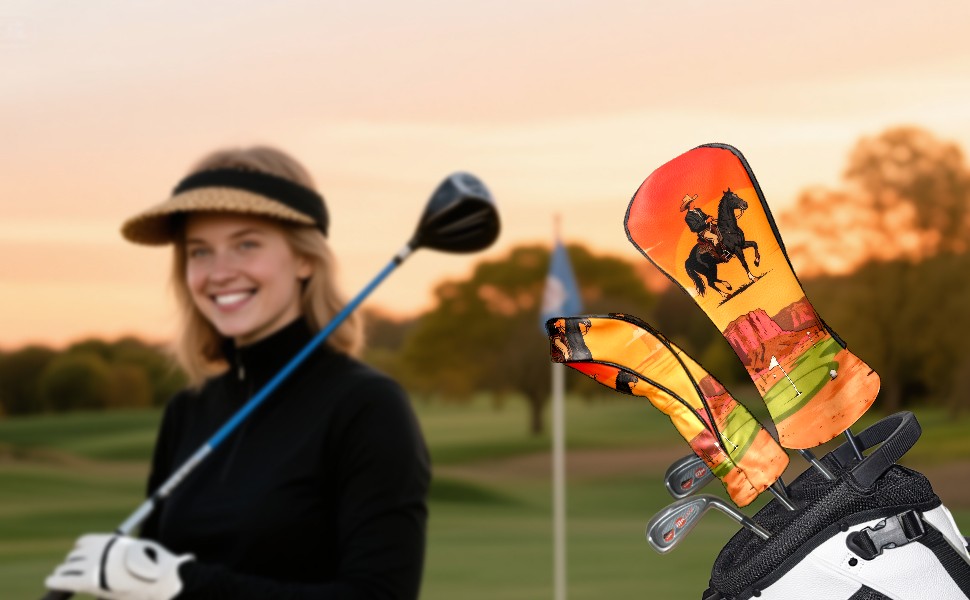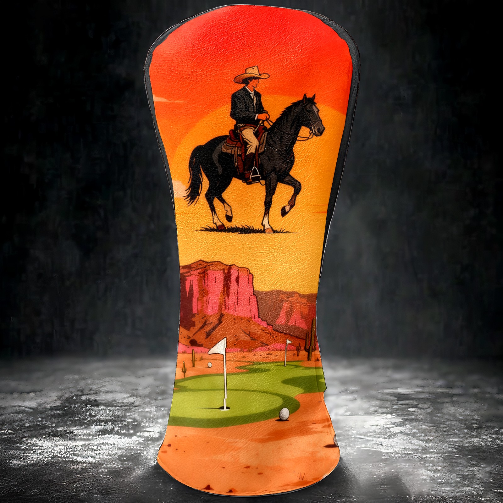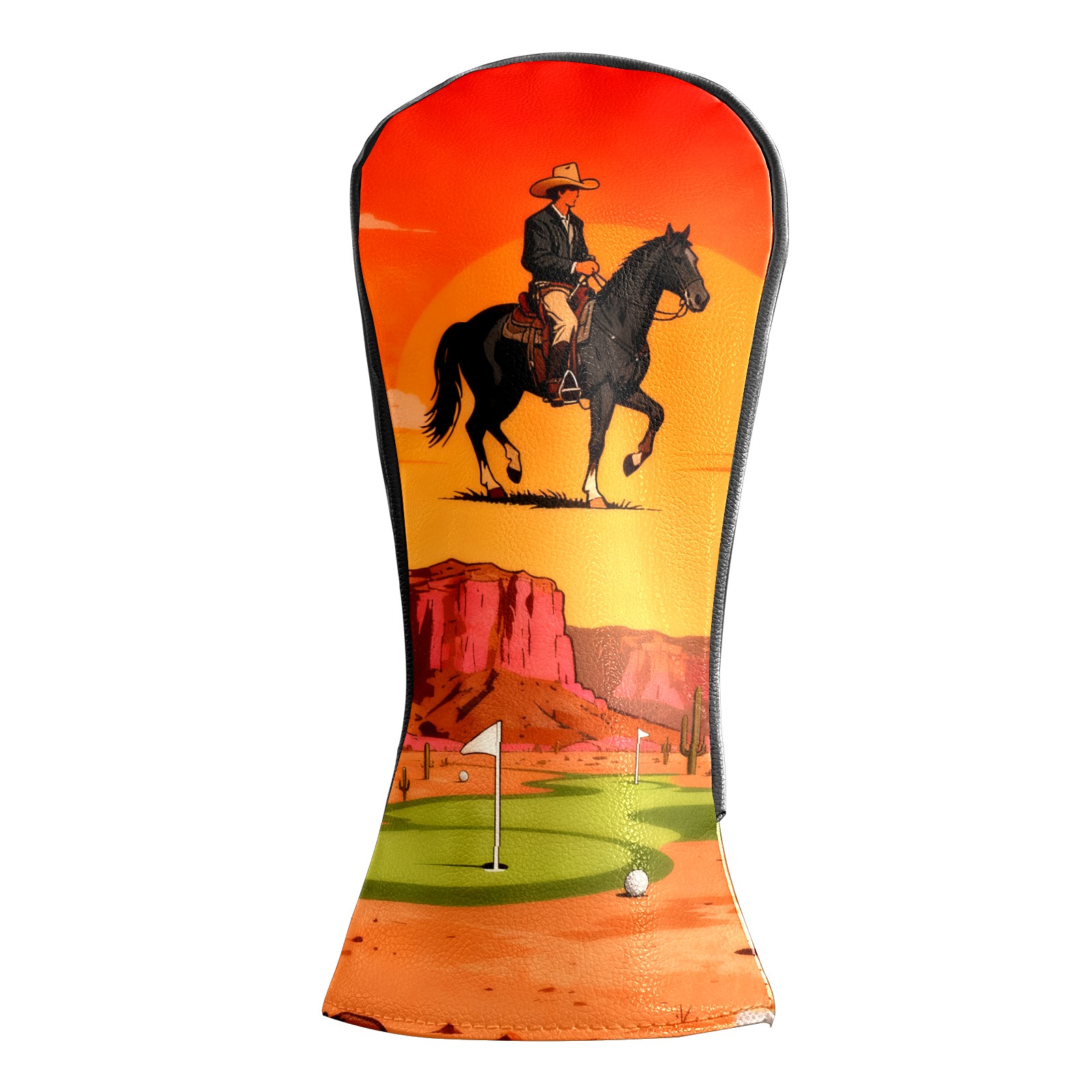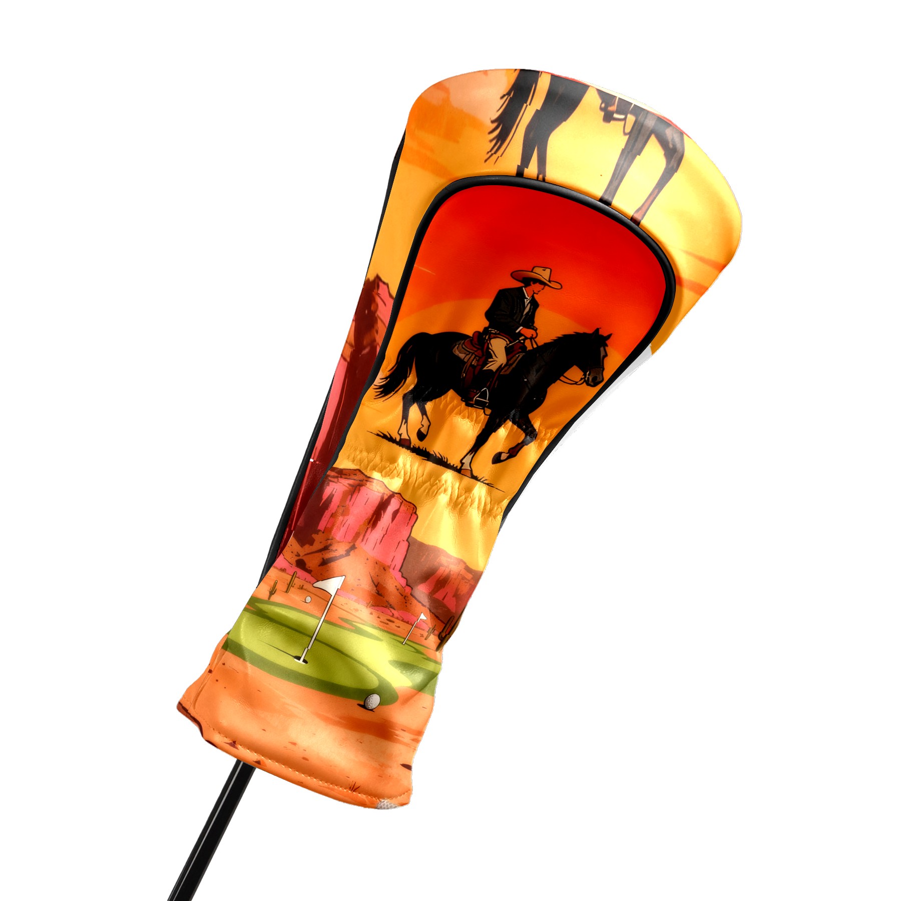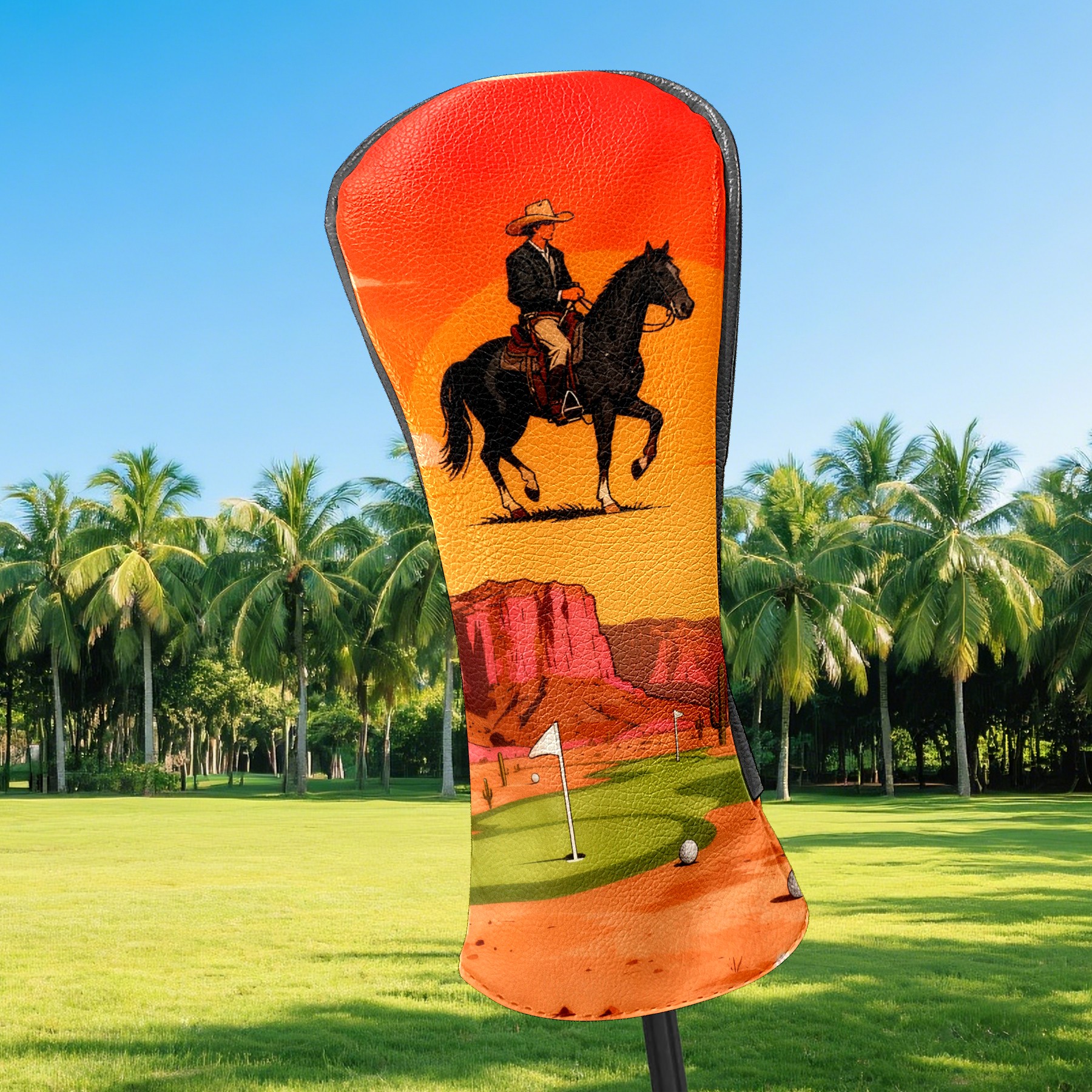 Golf Driver Head Covers Fairway Wood Headcovers, Premium Leather Golf Club Covers with Anti-Scratch Lining 1/3/5 Wood Cover for golf clubs for Women Men (Jimeng-2025-10-20-4492-参考图1的复古插画风格和构图,牛仔骑手戴着宽边帽,骑在黑色马匹上,背景天空改为橙...)