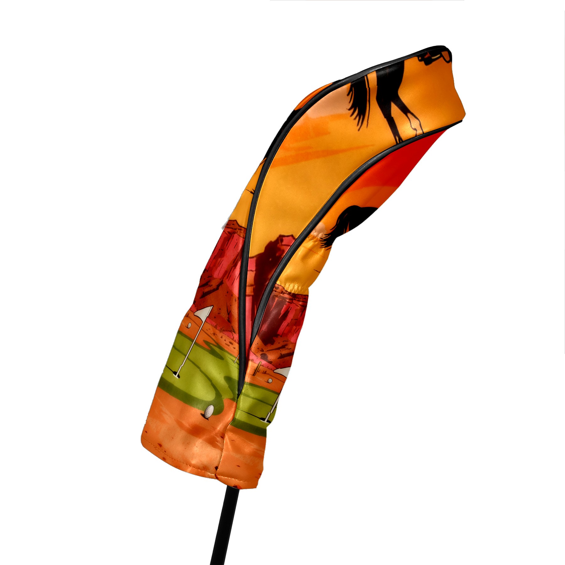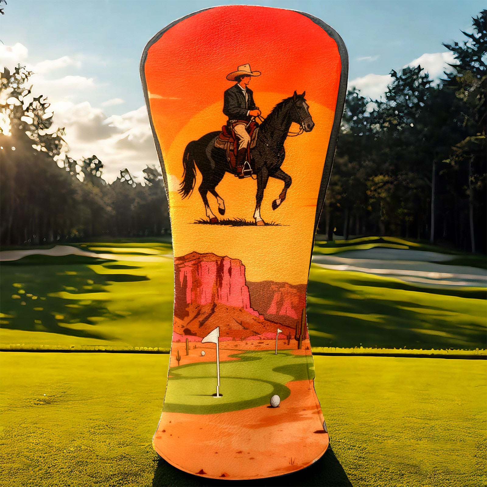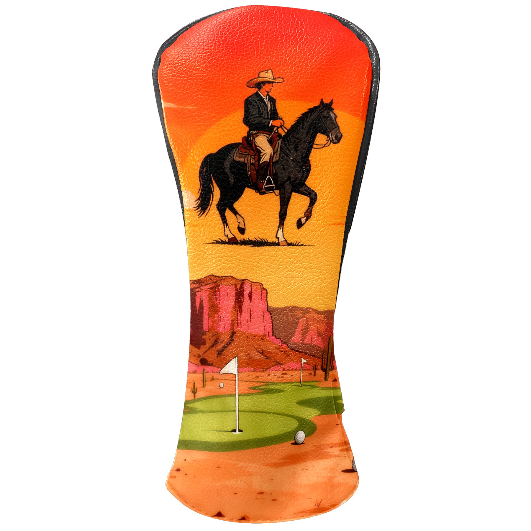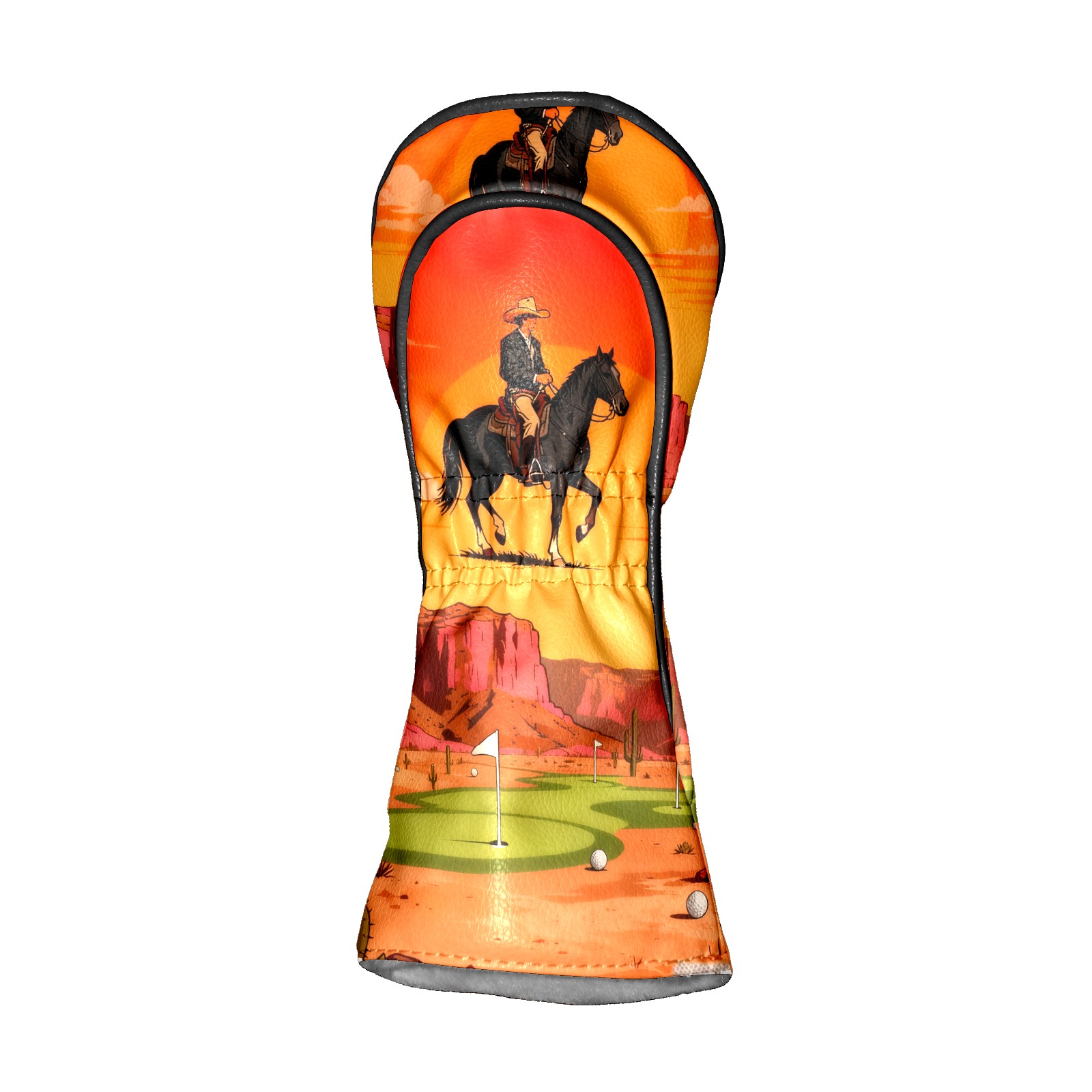 Golf Driver Head Covers Fairway Wood Headcovers, Premium Leather Golf Club Covers with Anti-Scratch Lining 1/3/5 Wood Cover for golf clubs for Women Men (Jimeng-2025-10-20-4492-参考图1的复古插画风格和构图,牛仔骑手戴着宽边帽,骑在黑色马匹上,背景天空改为橙...)
