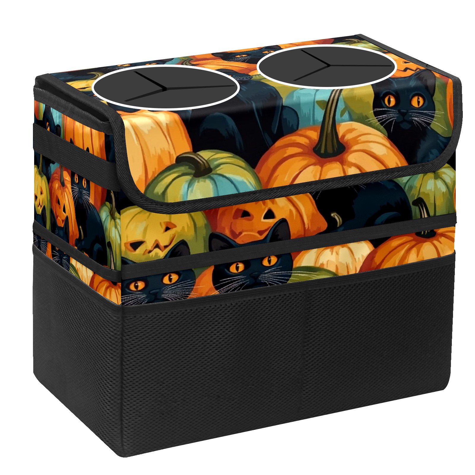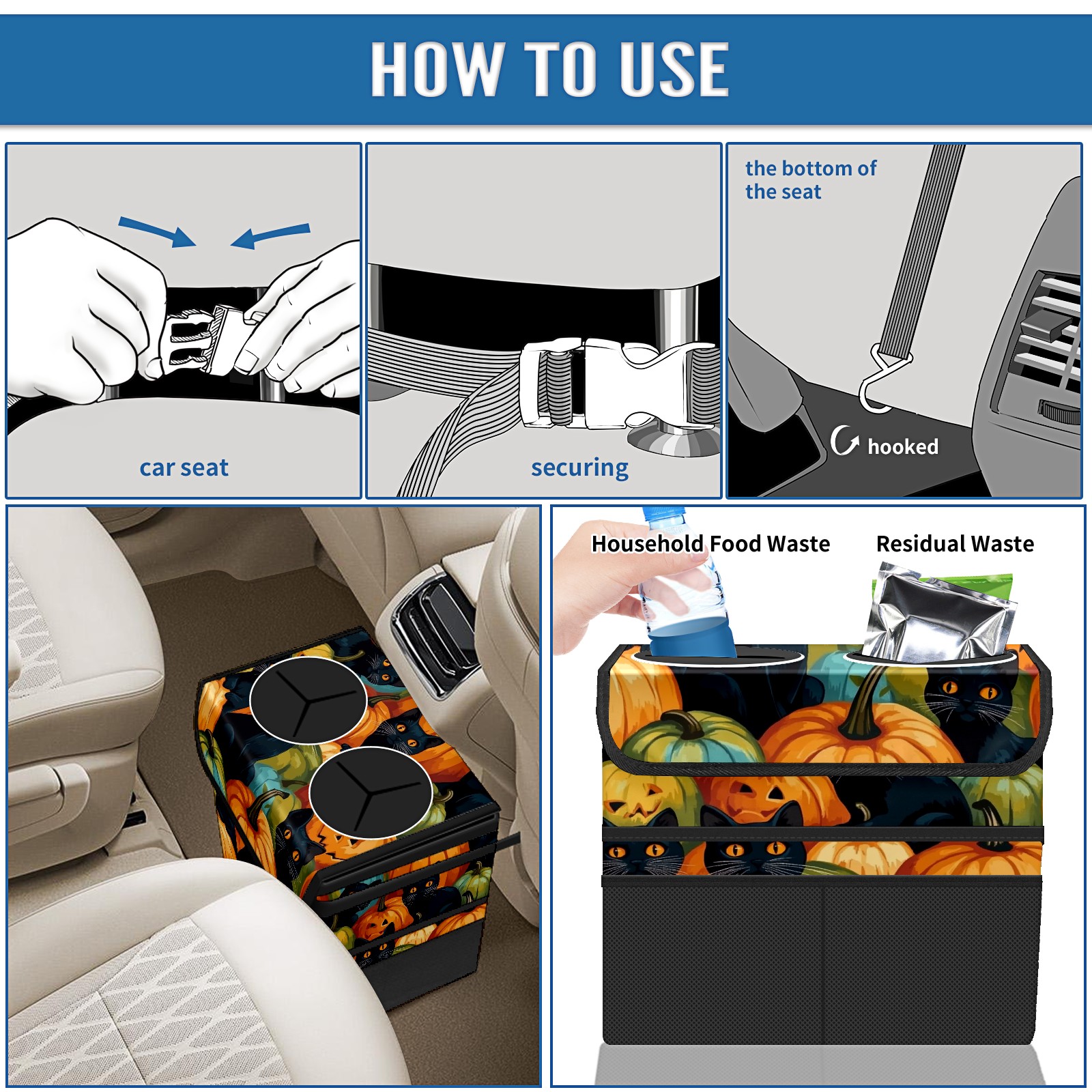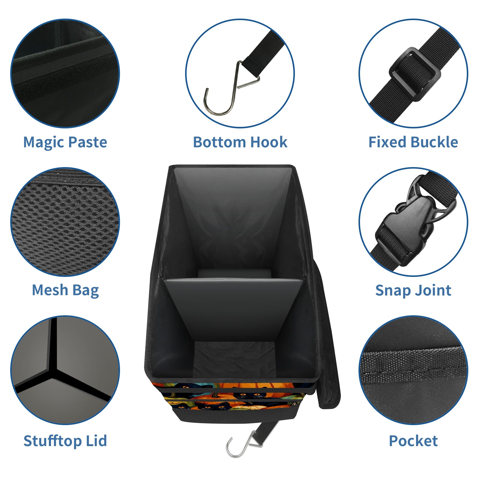 Car Trash Can with Lid, Portable Hanging Automotive Garbage Bin for Vehicles, Leakproof Waste Bag Container for SUV Truck Van Interior Auto Travel Road Trips(Pumpkins And Cats)