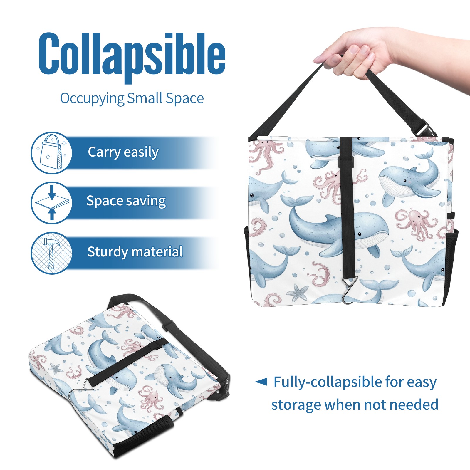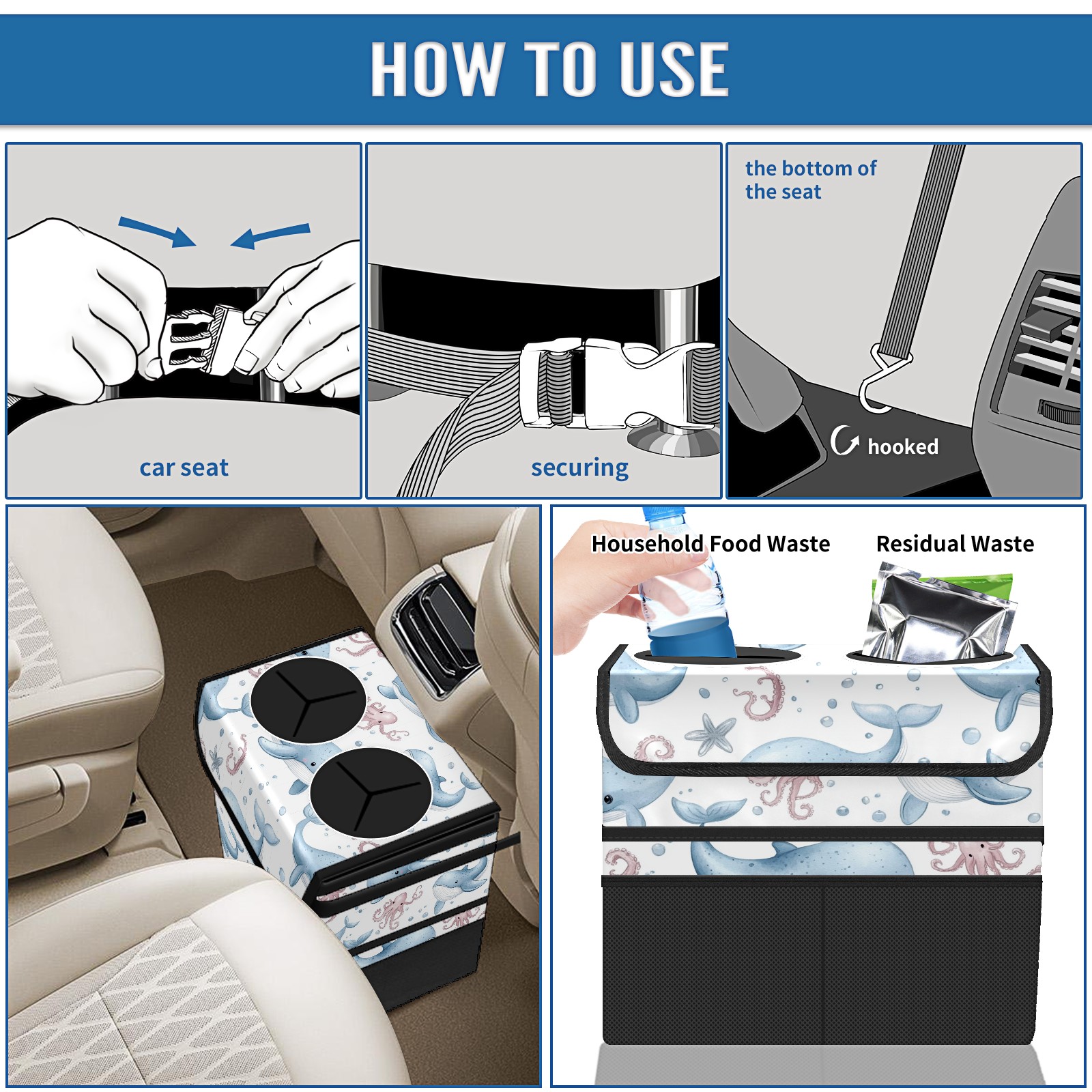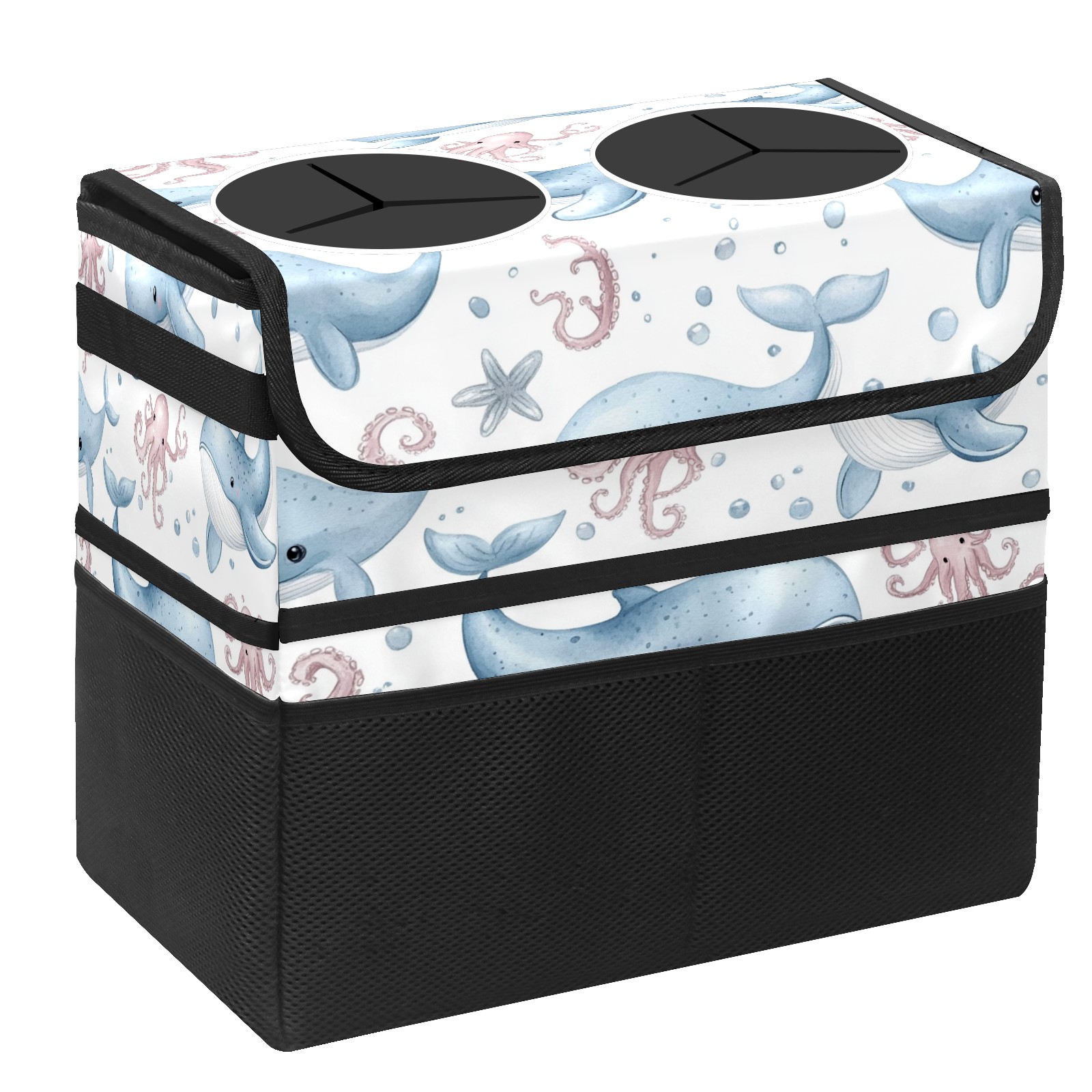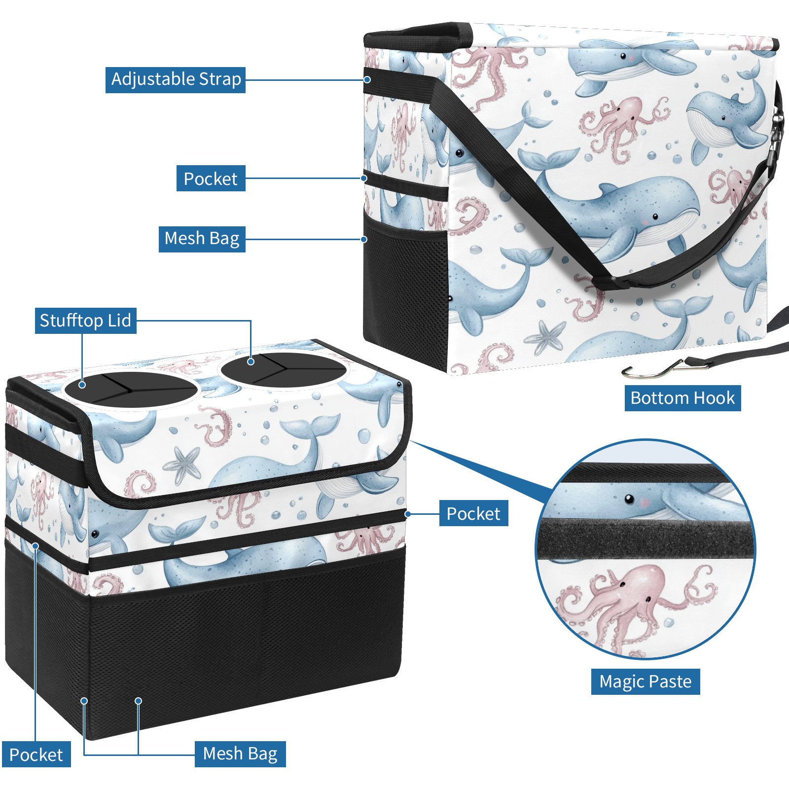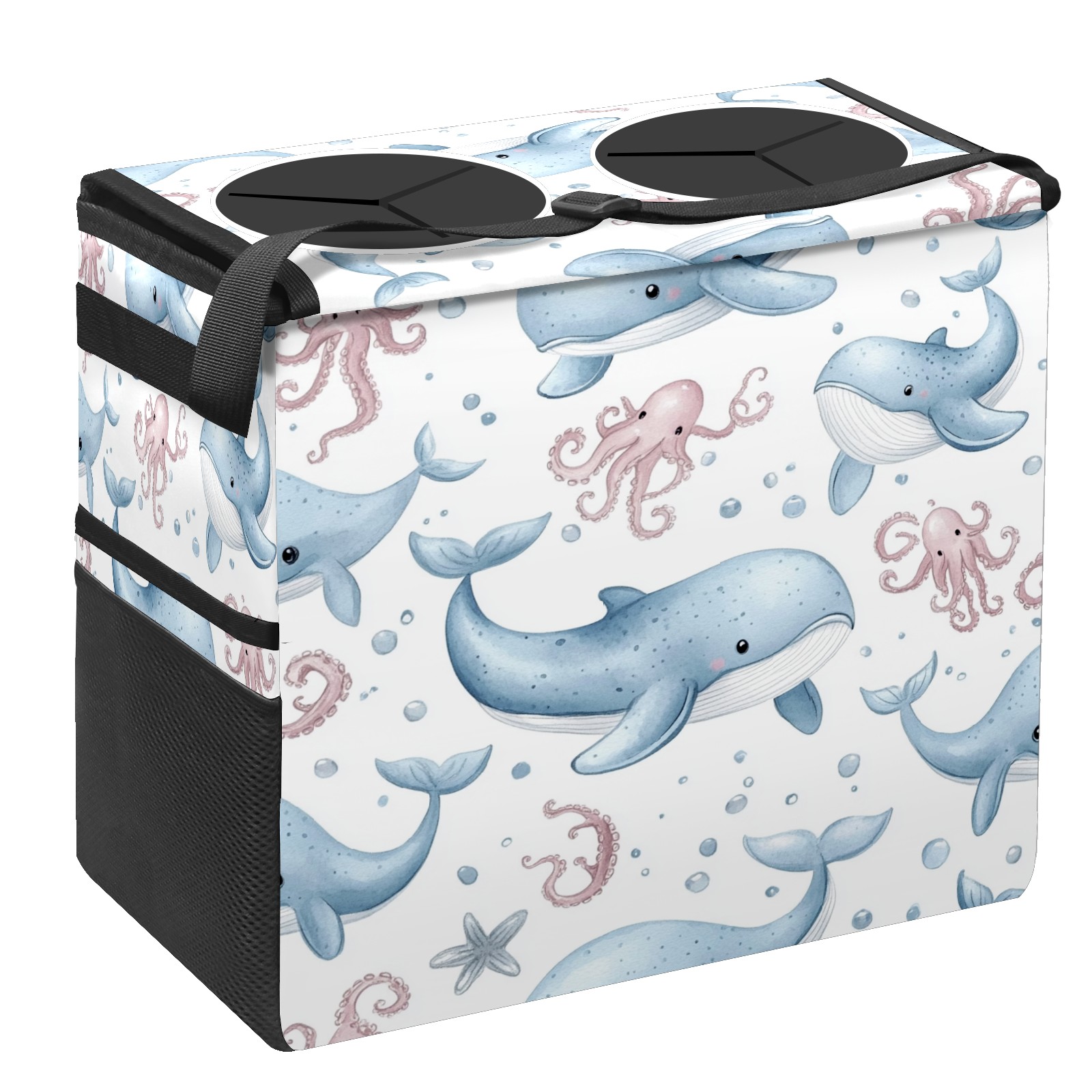 Car Trash Can with Lid, Portable Hanging Automotive Garbage Bin for Vehicles, Leakproof Waste Bag Container for SUV Truck Van Interior Auto Travel Road Trips(Whales Octopus)
