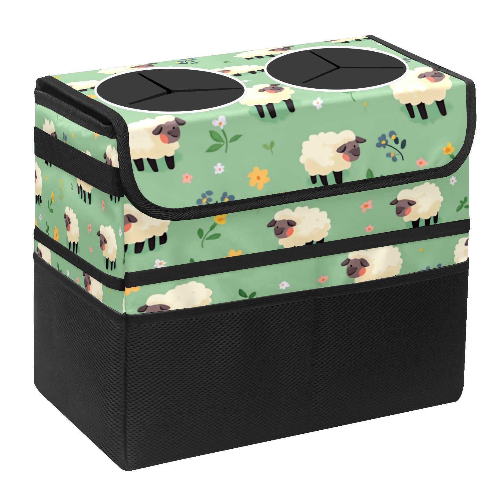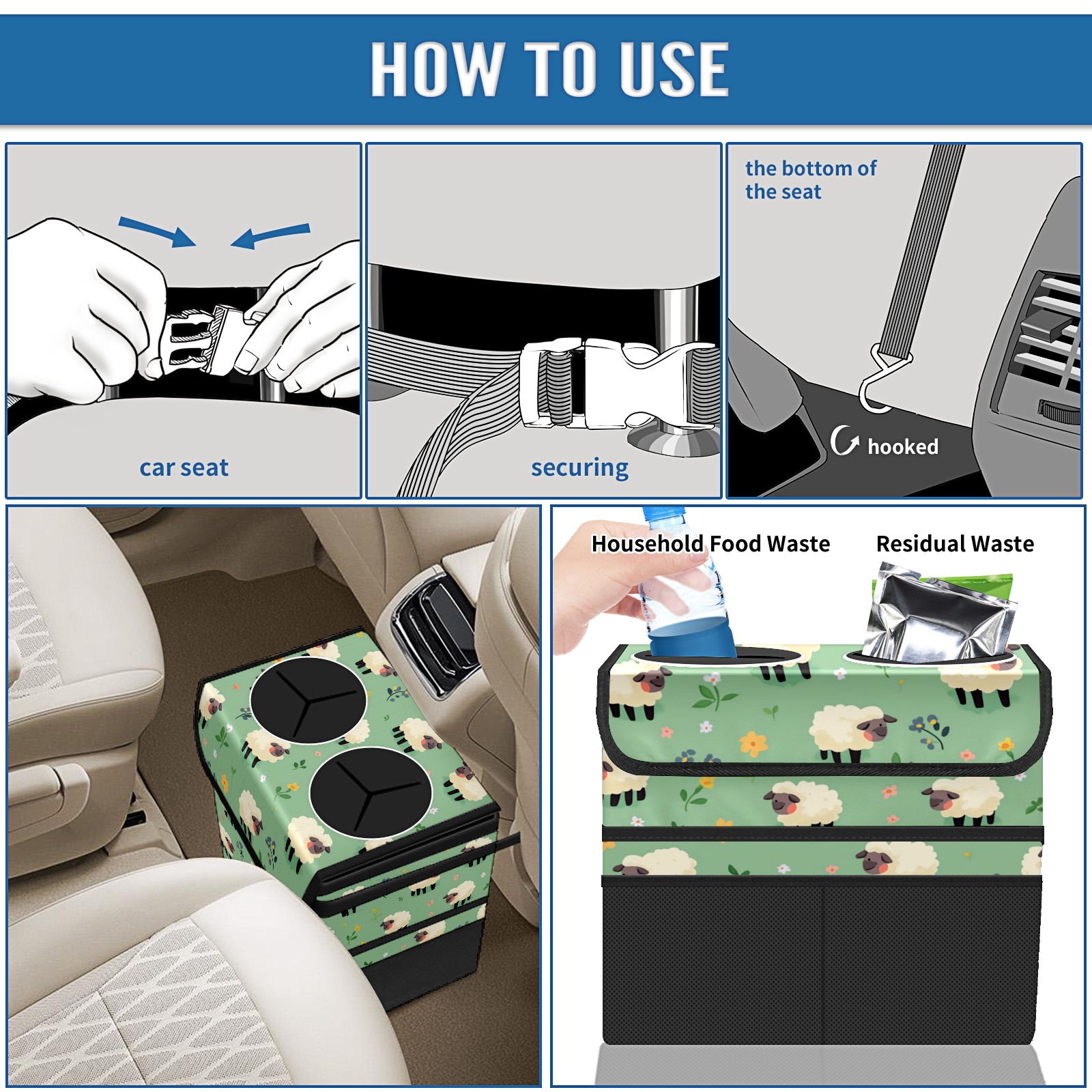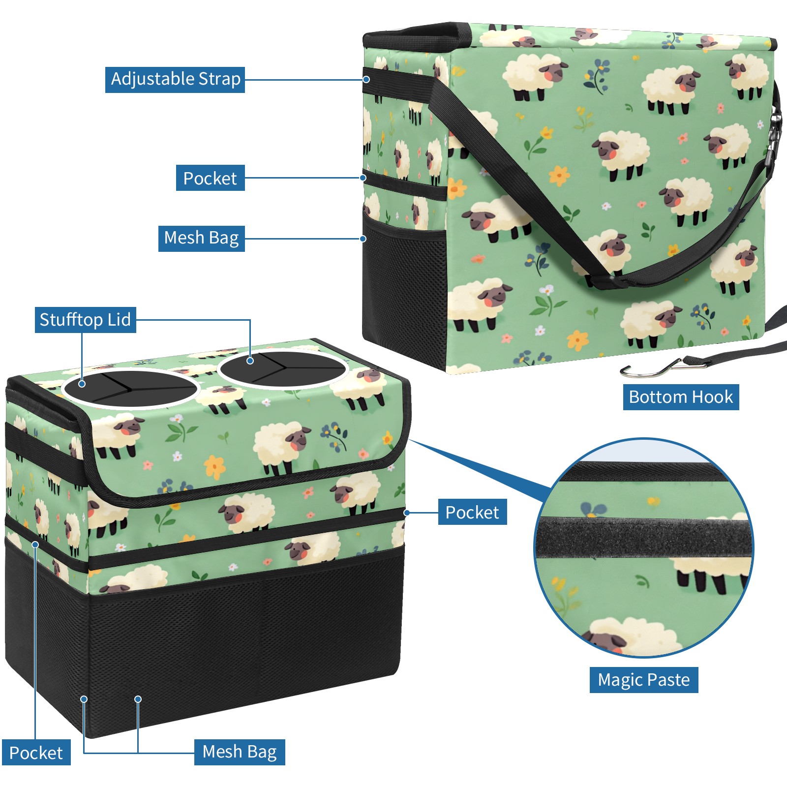 Car Trash Can with Lid, Portable Hanging Automotive Garbage Bin for Vehicles, Leakproof Waste Bag Container for SUV Truck Van Interior Auto Travel Road Trips(Cartoon Sheep)