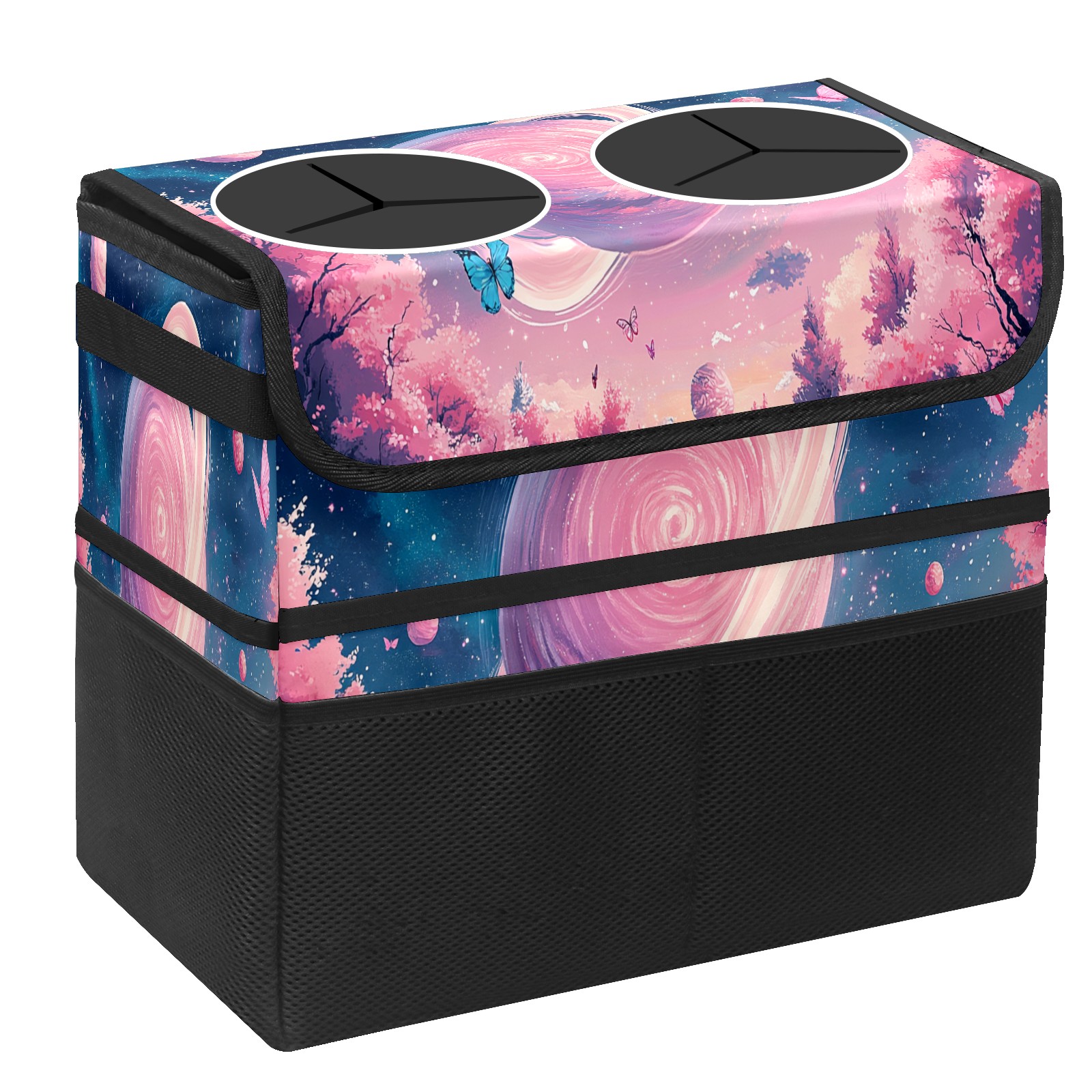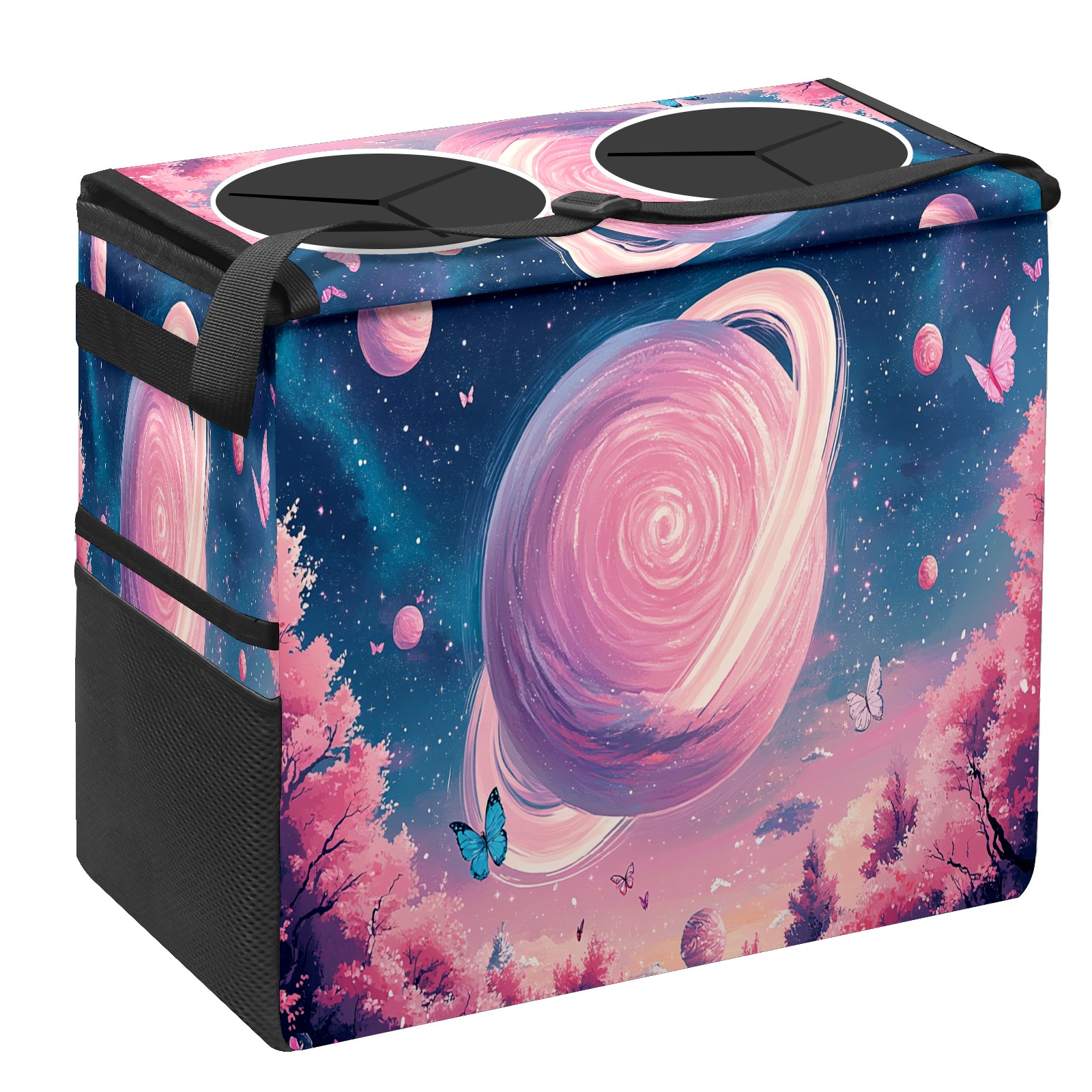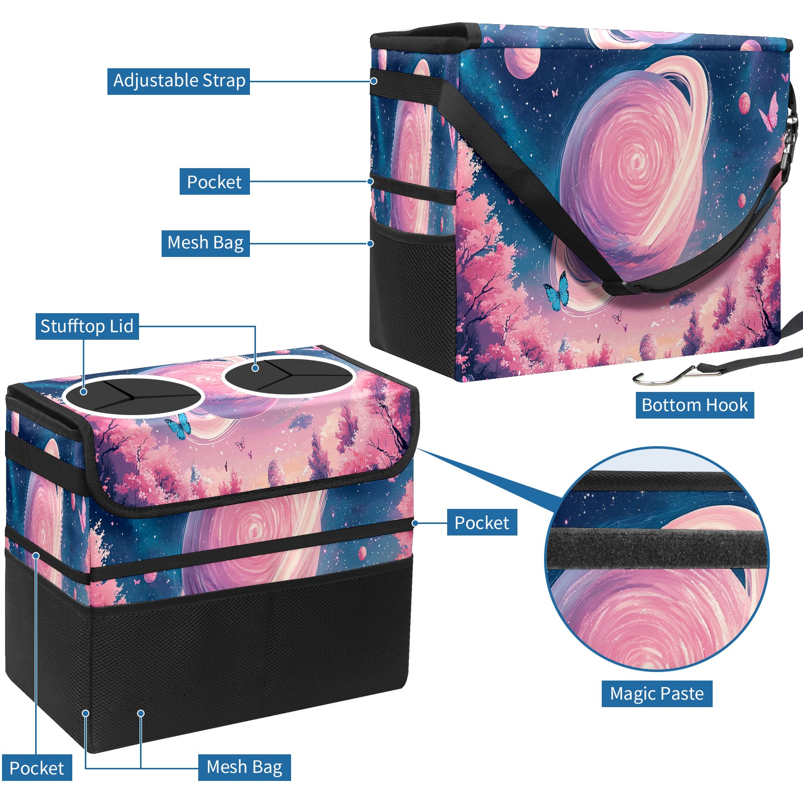 Car Trash Can with Lid, Portable Hanging Automotive Garbage Bin for Vehicles, Leakproof Waste Bag Container for SUV Truck Van Interior Auto Travel Road Trips(Pink Universe)