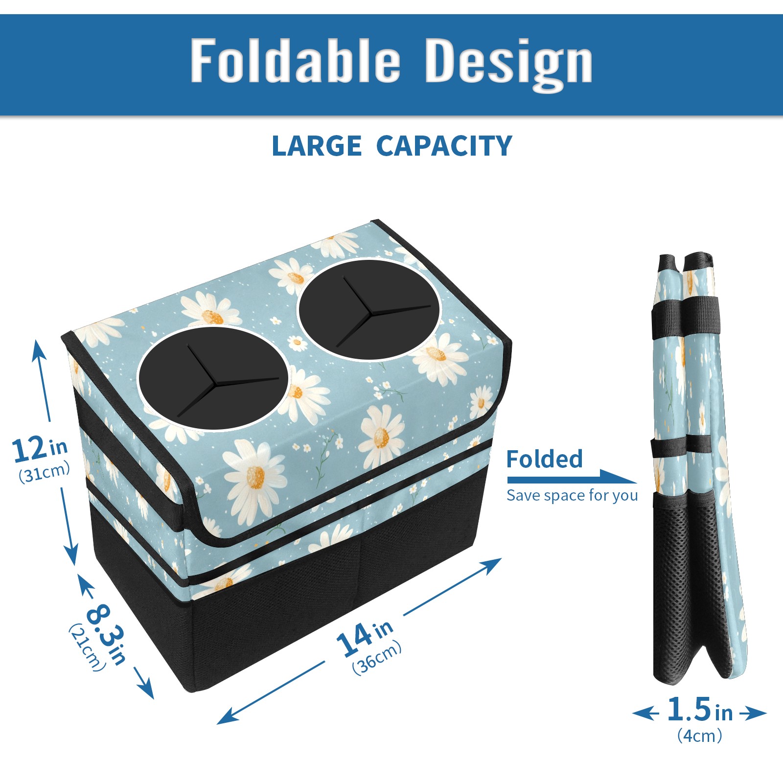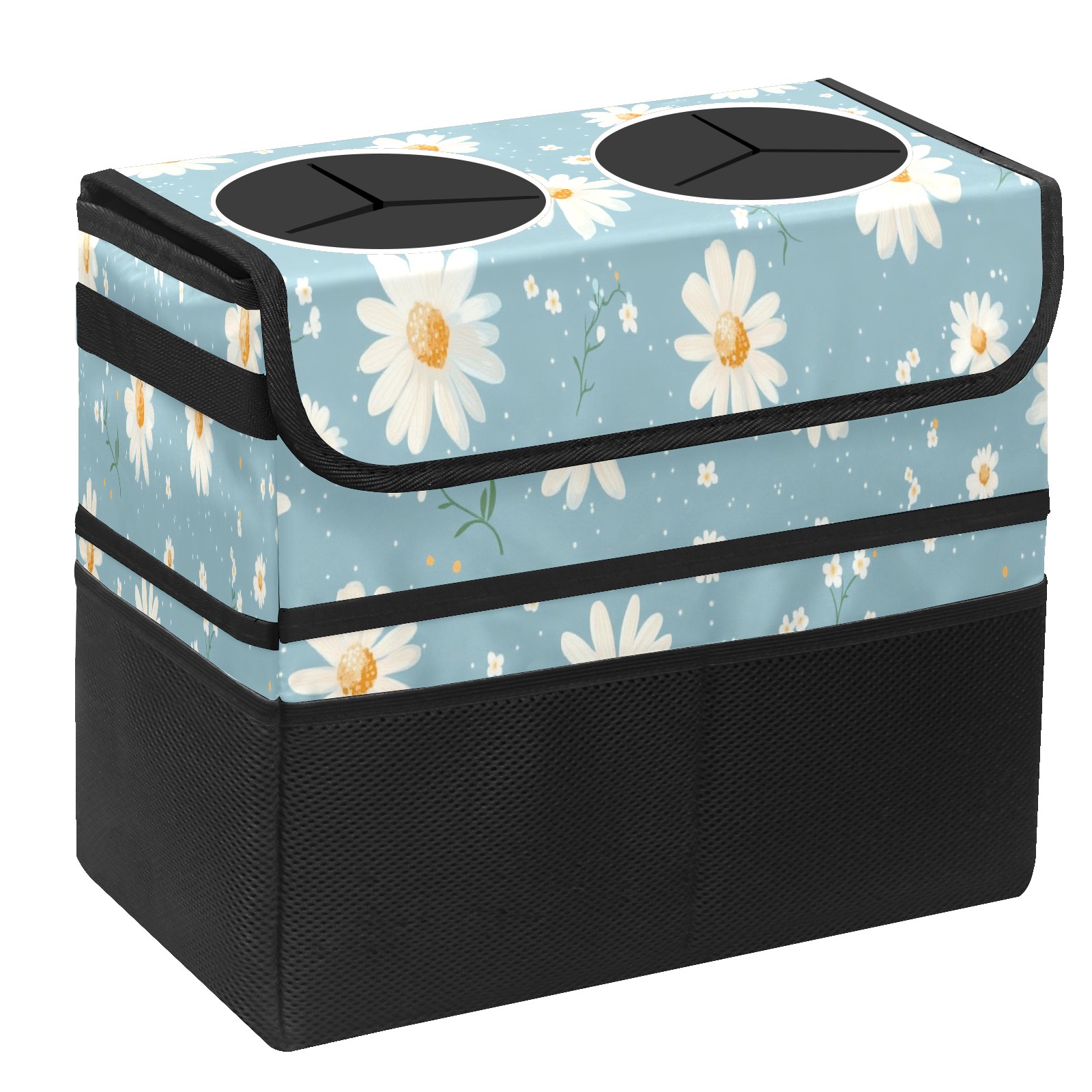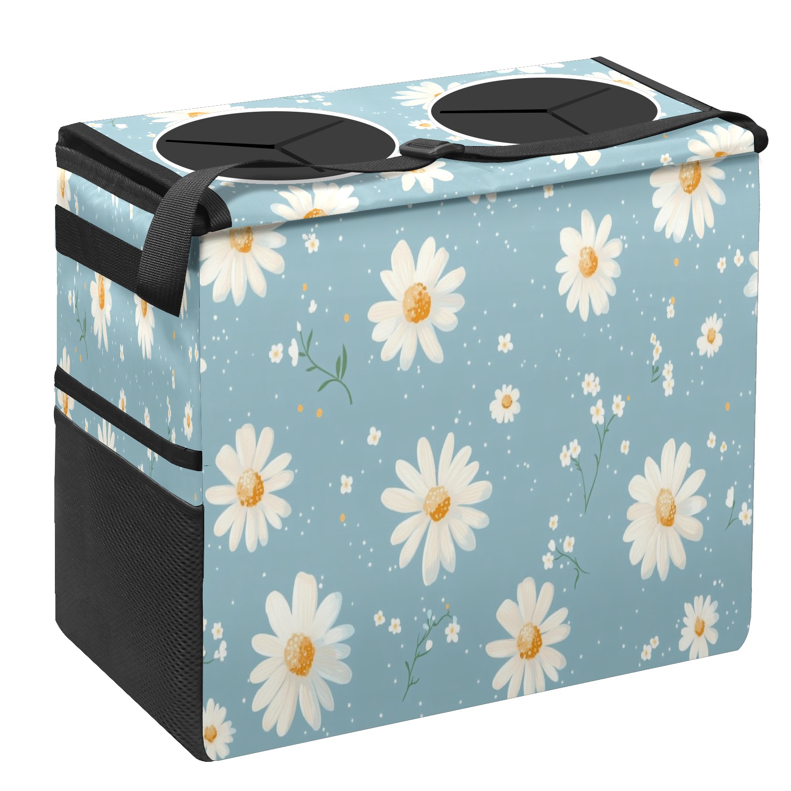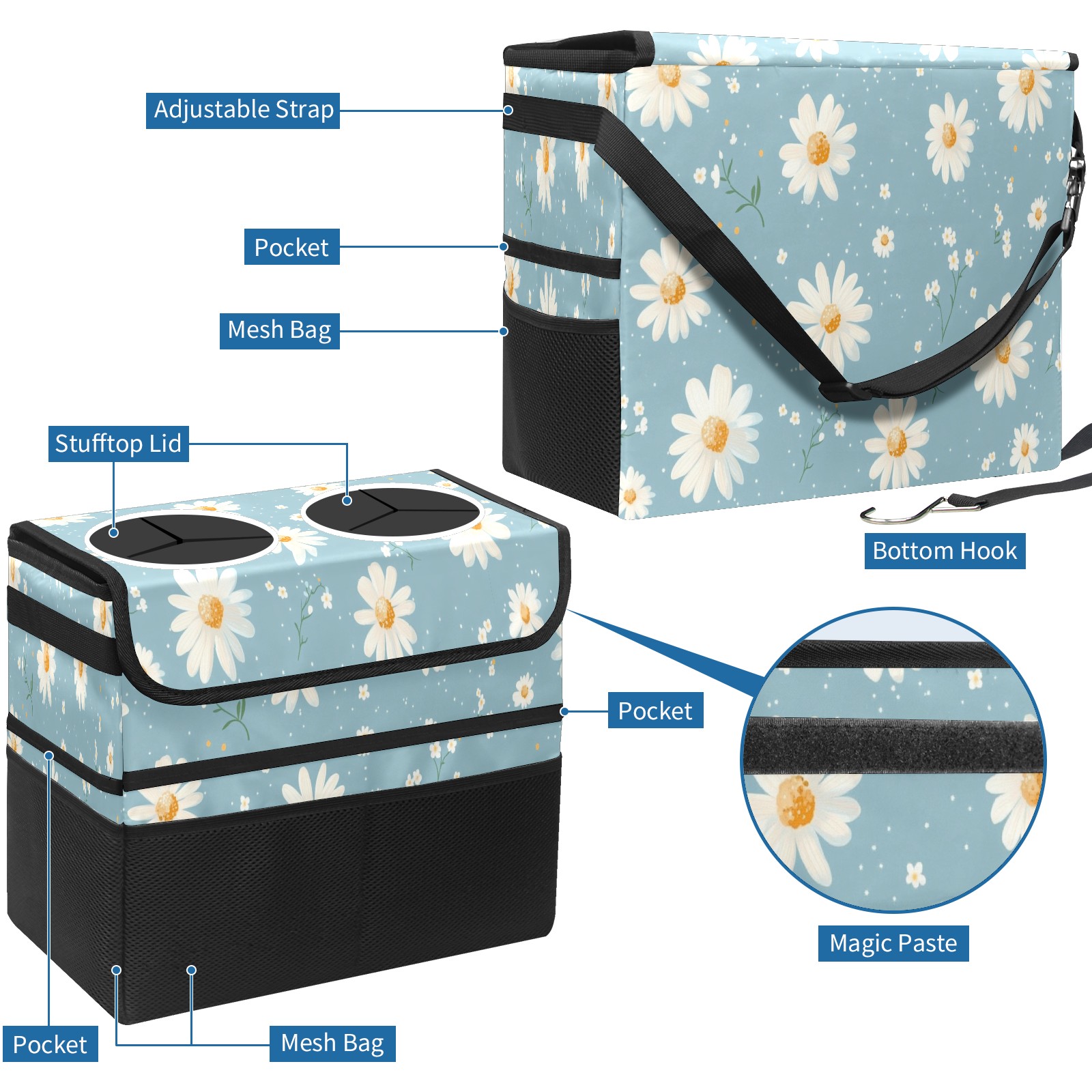 Car Trash Can with Lid, Portable Hanging Automotive Garbage Bin for Vehicles, Leakproof Waste Bag Container for SUV Truck Van Interior Auto Travel Road Trips(White Daisies)